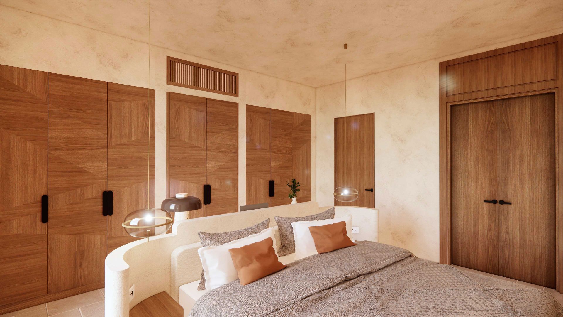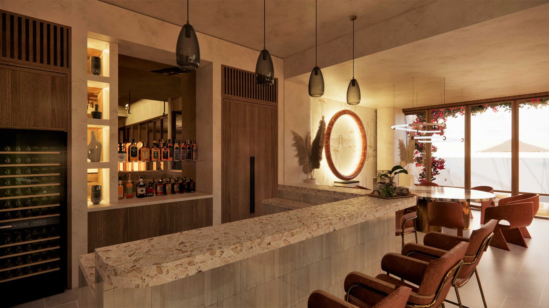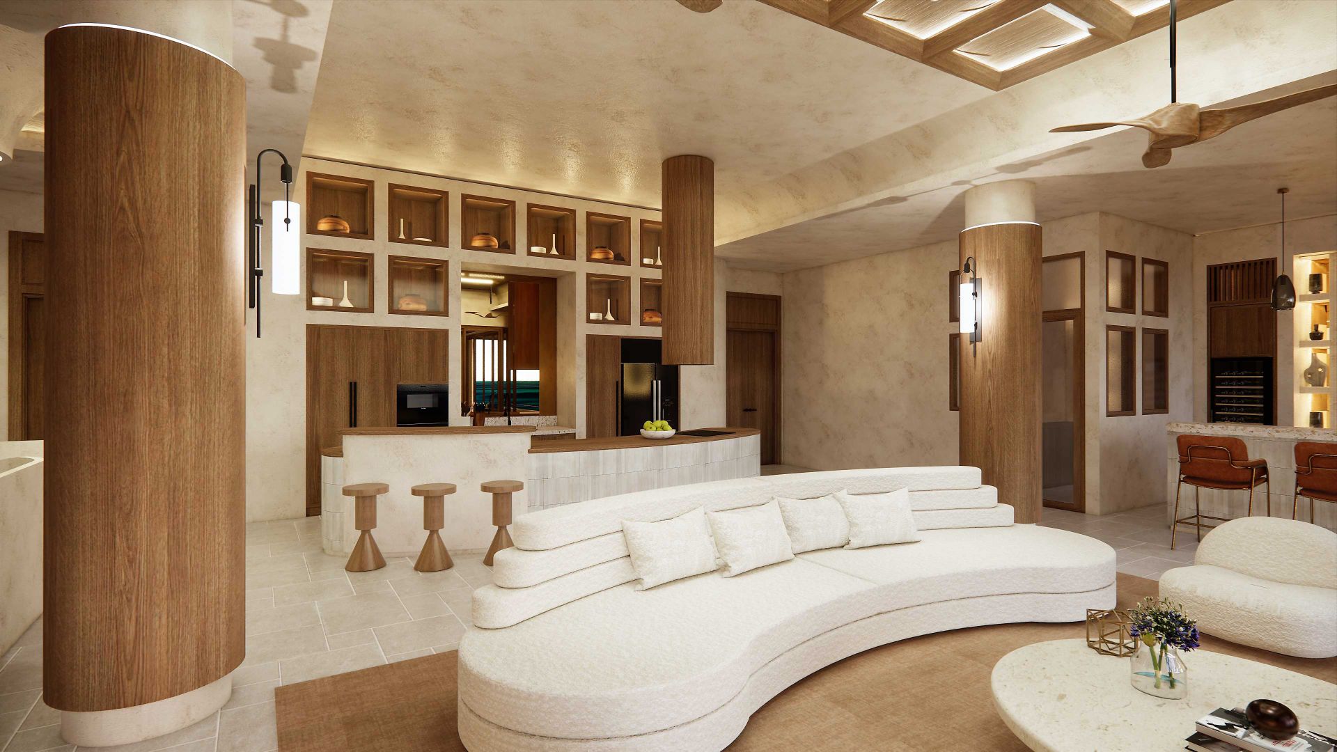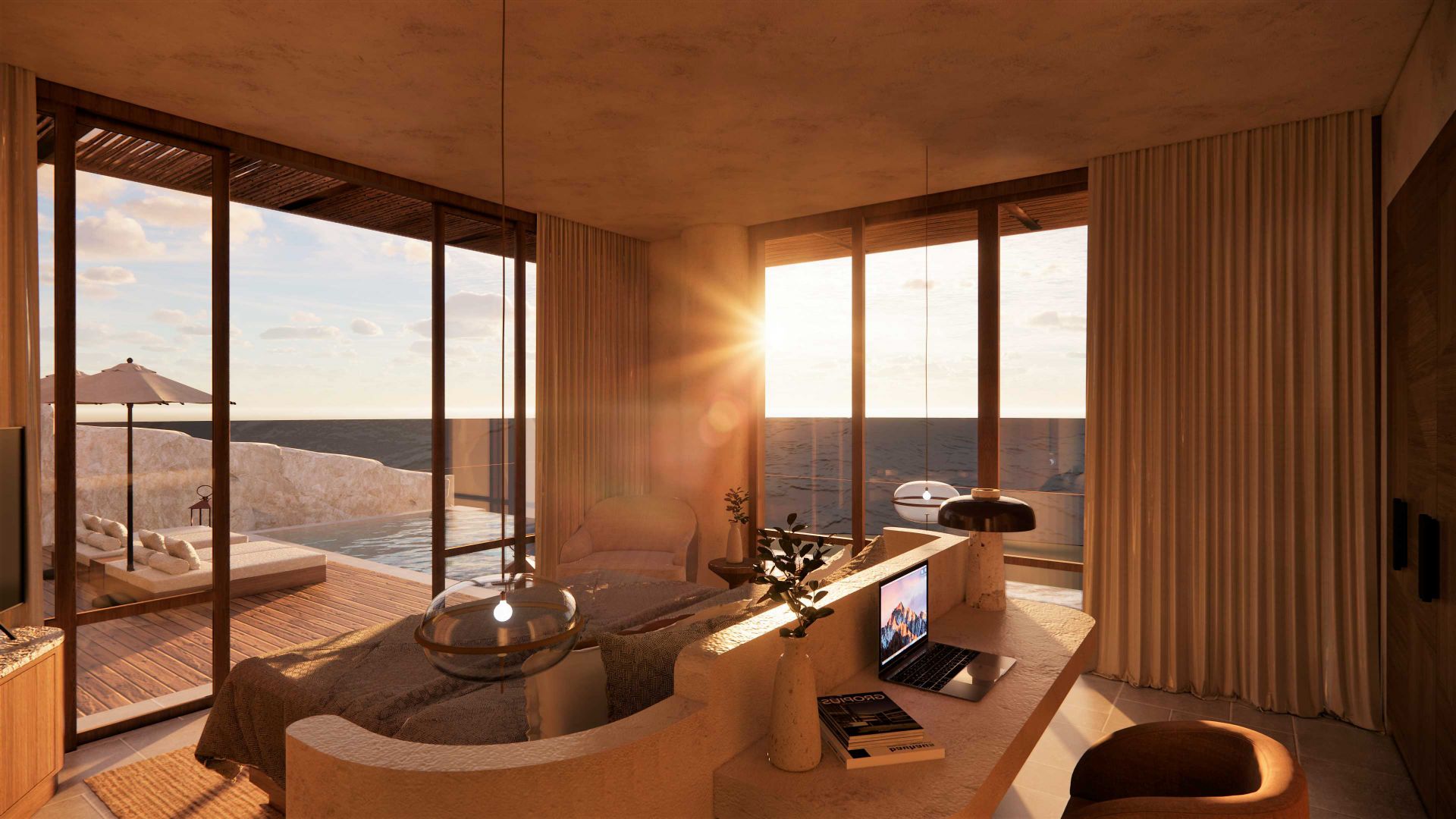 Los interiores están influenciados por el discreto diseño californiano de mediados de siglo y modernizados con la simplicidad escandinava del minimalismo industrial, acentuados con los profundos tonos de color de los años 60 y 70.