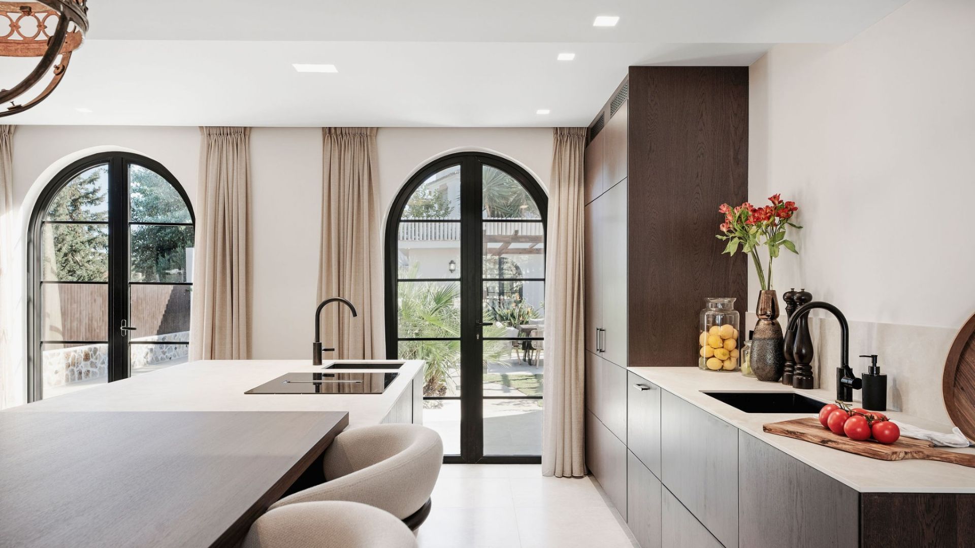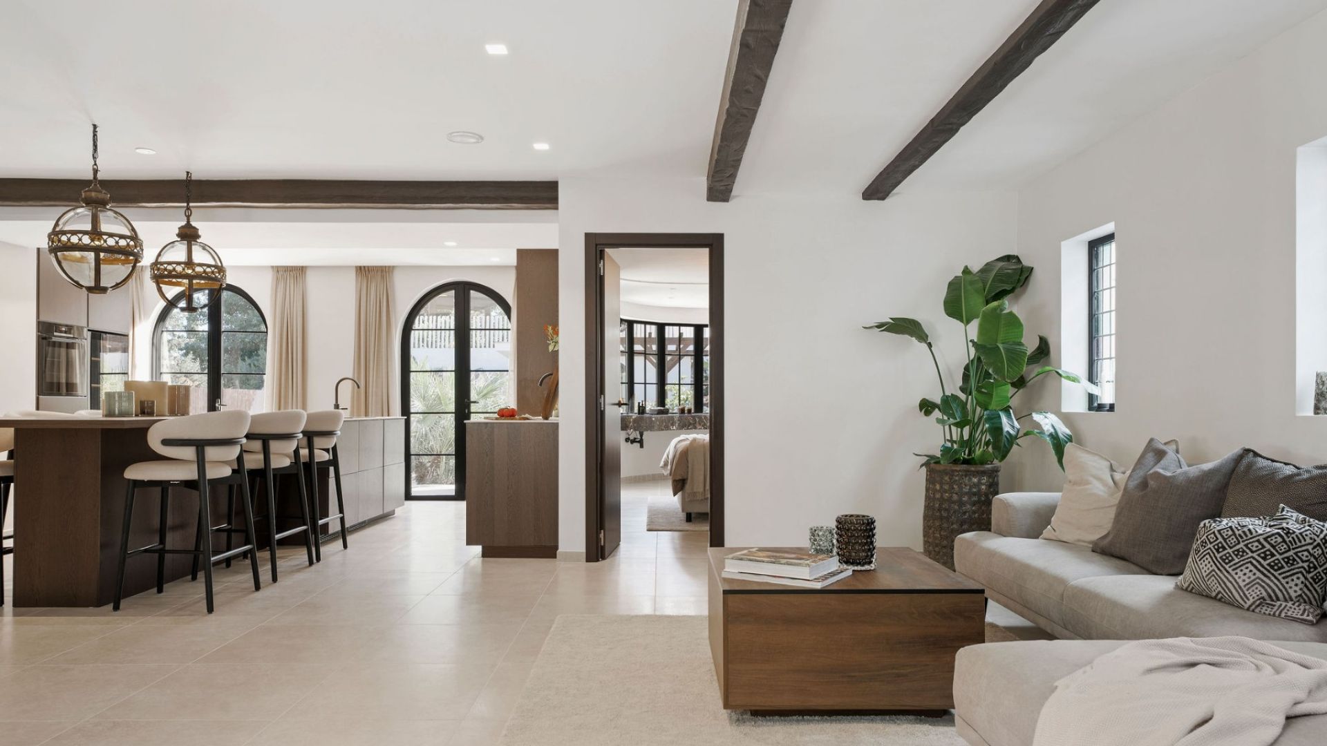 La villa cuenta con un área de estar y cocina de planta abierta, elegantemente diseñada con piedra italiana y acabados de alta calidad. Dispone de cuatro dormitorios y cuatro baños, incluyendo una casa de huéspedes con sus propias comodidades, asegurando confort y privacidad para todos los residentes. La suite principal, con su exclusivo lavabo imperial de mármol en forma de U, proporciona acceso directo a la piscina climatizada y al área de barbacoa, facilitando un estilo de vida fluido entre interiores y exteriores.
