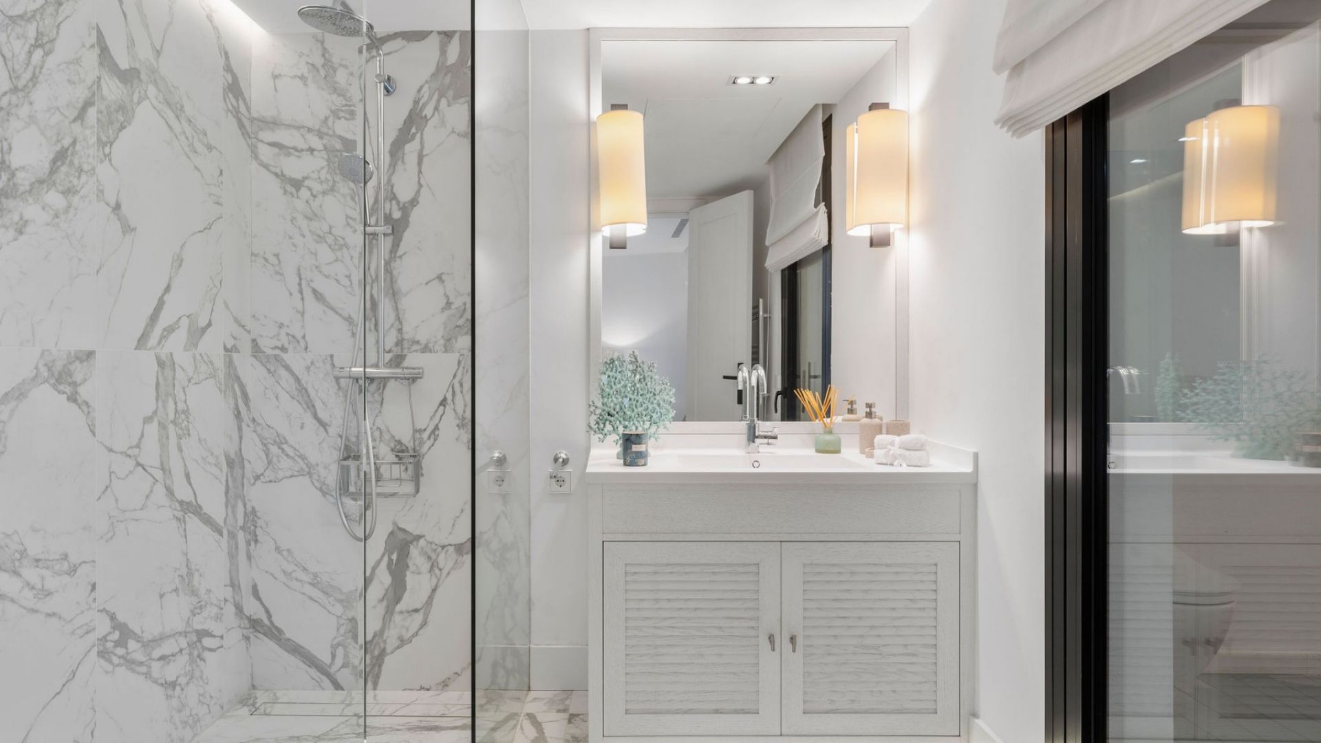 Subiendo al nivel superior, encontrarás tres dormitorios más, cada uno con su propio baño en suite. El dormitorio principal es un verdadero refugio, con un diseño espacioso, vestidores para él y para ella, y una terraza privada que ofrece impresionantes vistas del campo de golf y del mar más allá.