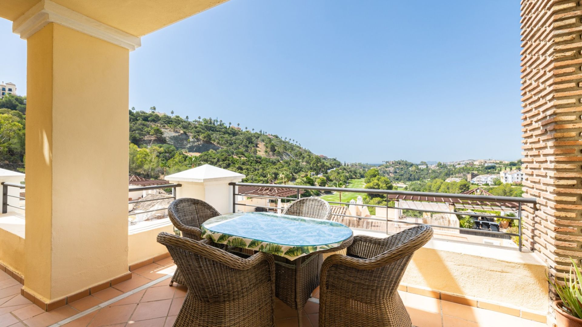 La amplia terraza de 38 m², accesible desde el salón y dos de los dormitorios, ofrece un espacio perfecto para relajarse y disfrutar del aire libre. La terraza tiene mucho espacio para áreas de descanso, zona de comedor y área de descanso, creando una extensión perfecta de los espacios interiores. Al salir a la terraza, te recibe un cautivador panorama con fantásticas vistas al mar y a las montañas.