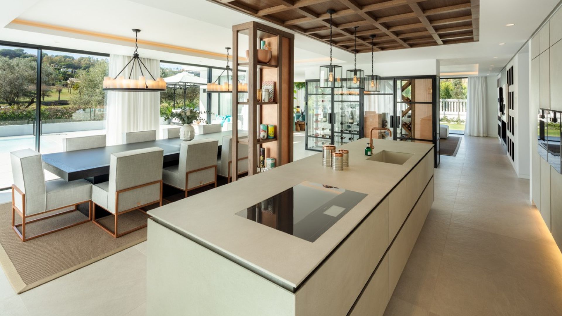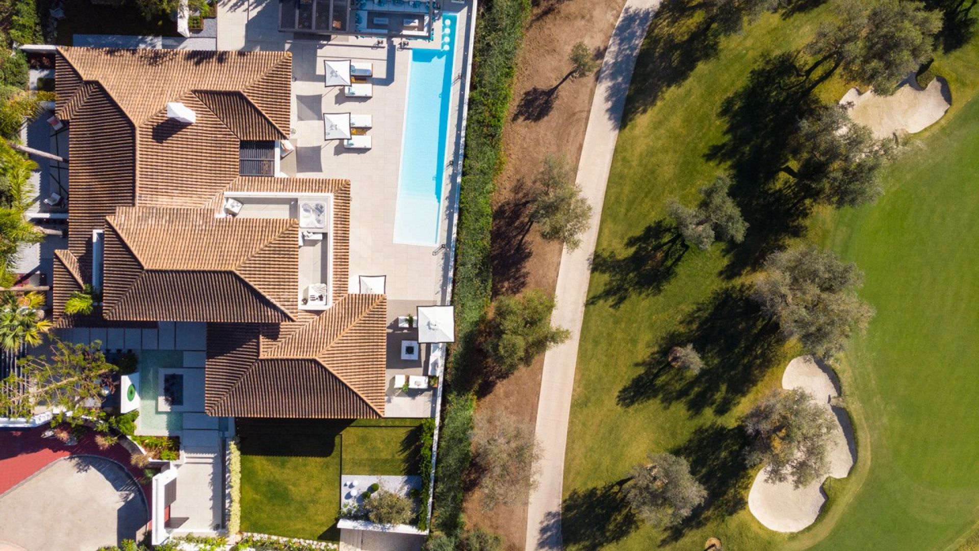 El diseño de la villa integra a la perfección los espacios interiores y exteriores, con amplias terrazas, una gran piscina exterior y una zona chill-out hundida, todo ello enmarcado por unas impresionantes vistas al campo de golf. Ideal tanto para relajarse como para organizar eventos, estos espacios ofrecen una atmósfera elegante y cómoda para disfrutar en familia o con amigos.