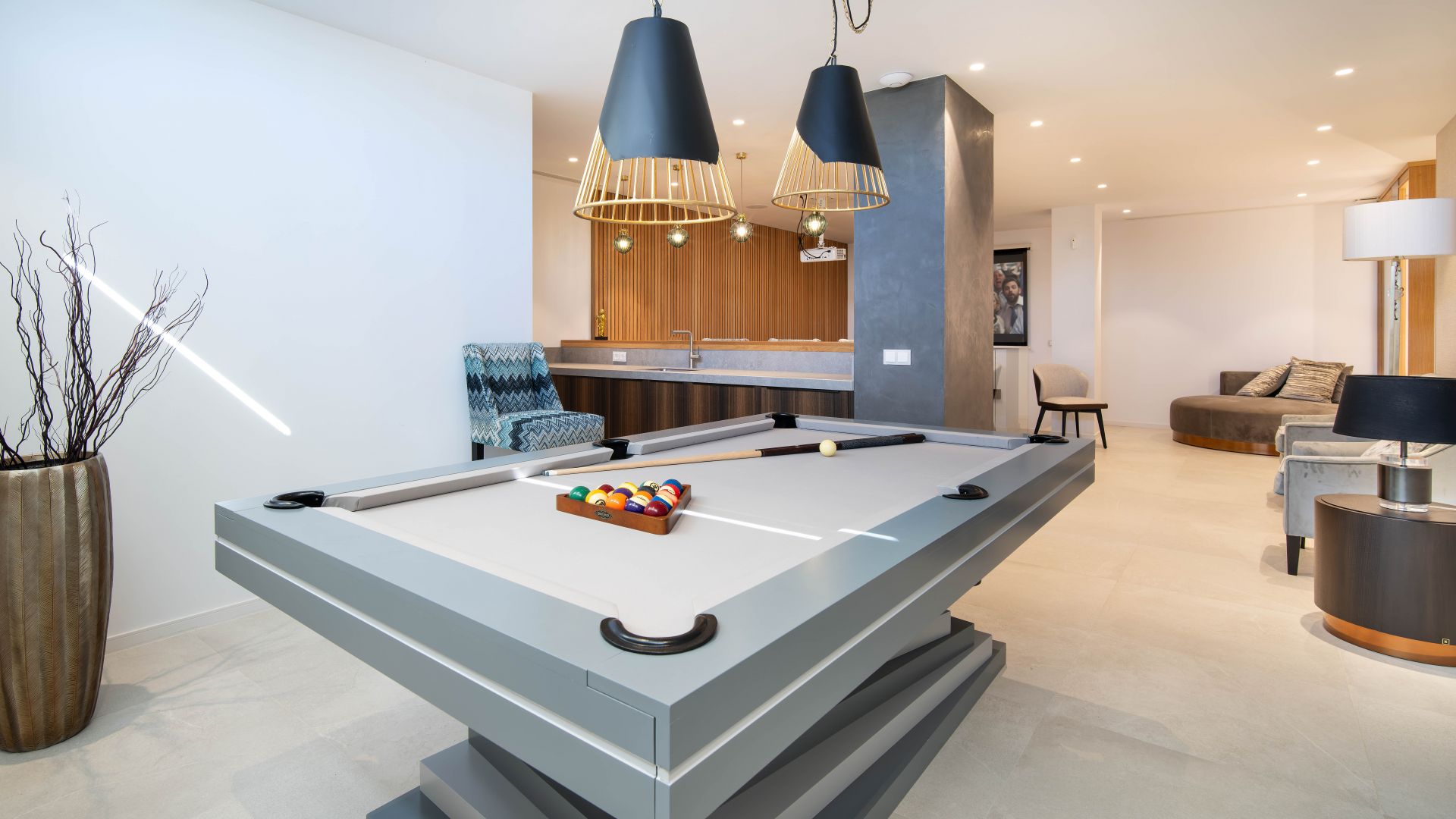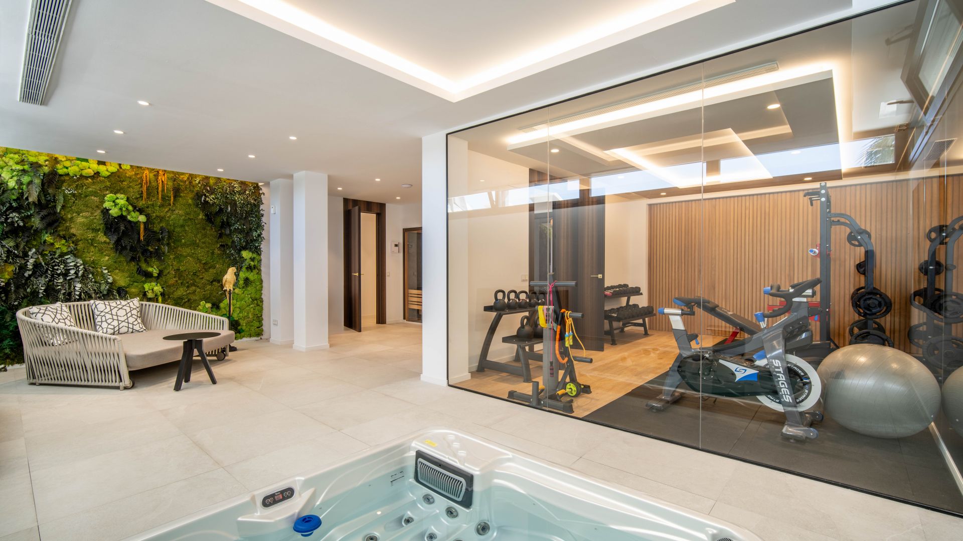 Distribuida en tres niveles, la planta superior está dedicada a los dormitorios, incluida la lujosa suite principal con vistas panorámicas y terraza privada. El baño principal cuenta con una bañera exenta y acabados en mármol. El nivel inferior alberga una impresionante zona de entretenimiento con una sala de juegos con mesa de billar, bodega de vinos, cine, bar, gimnasio y sauna. El sistema de calefacción por suelo radiante añade comodidad en toda la propiedad.