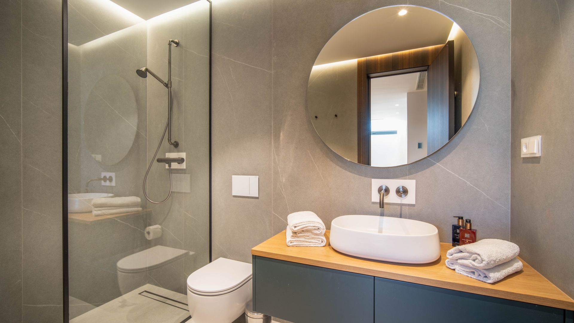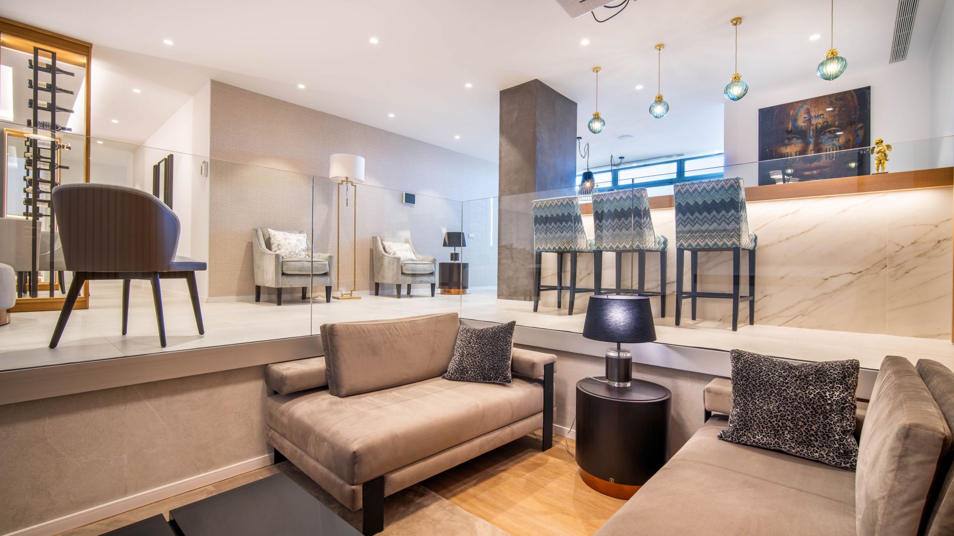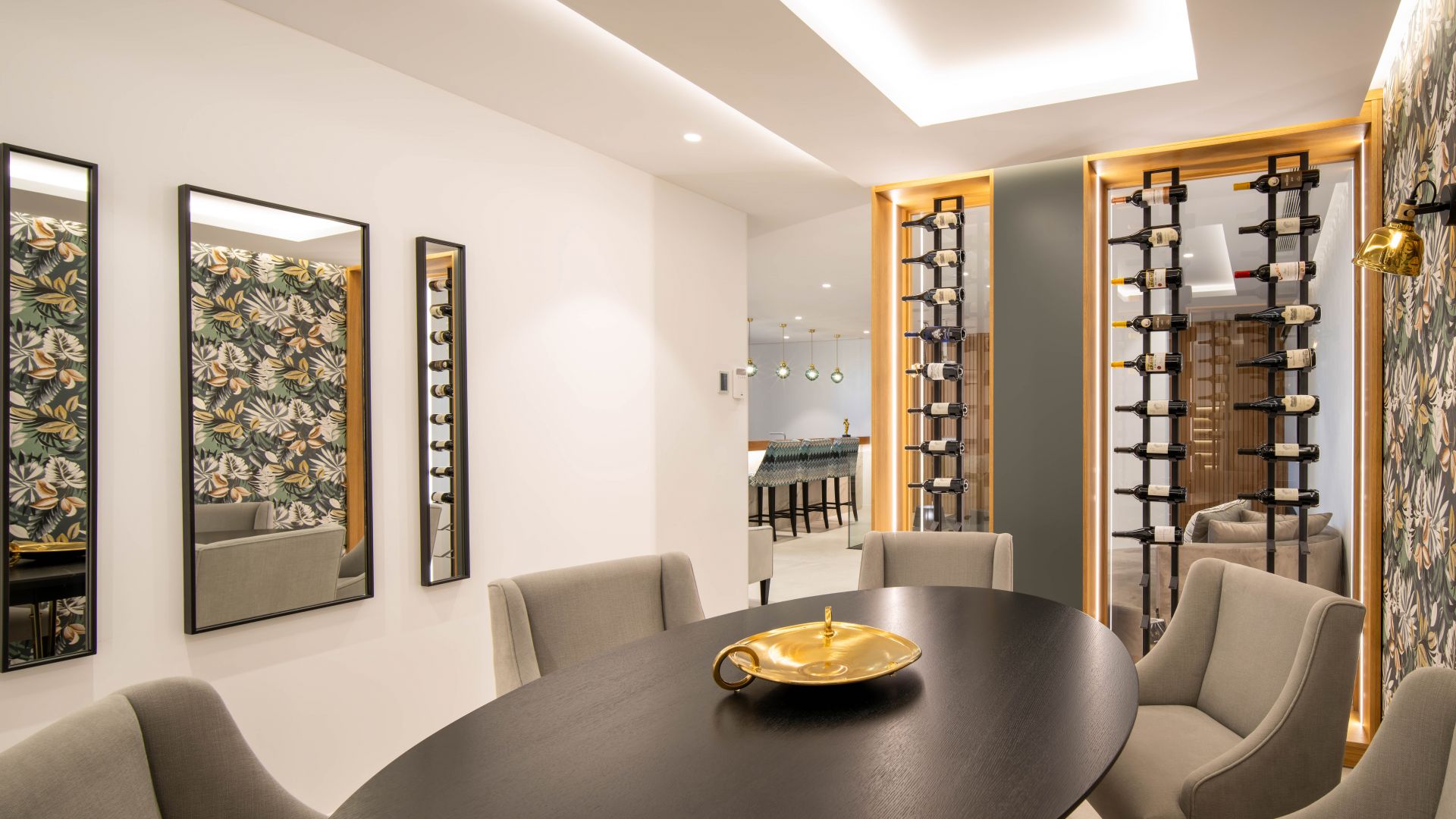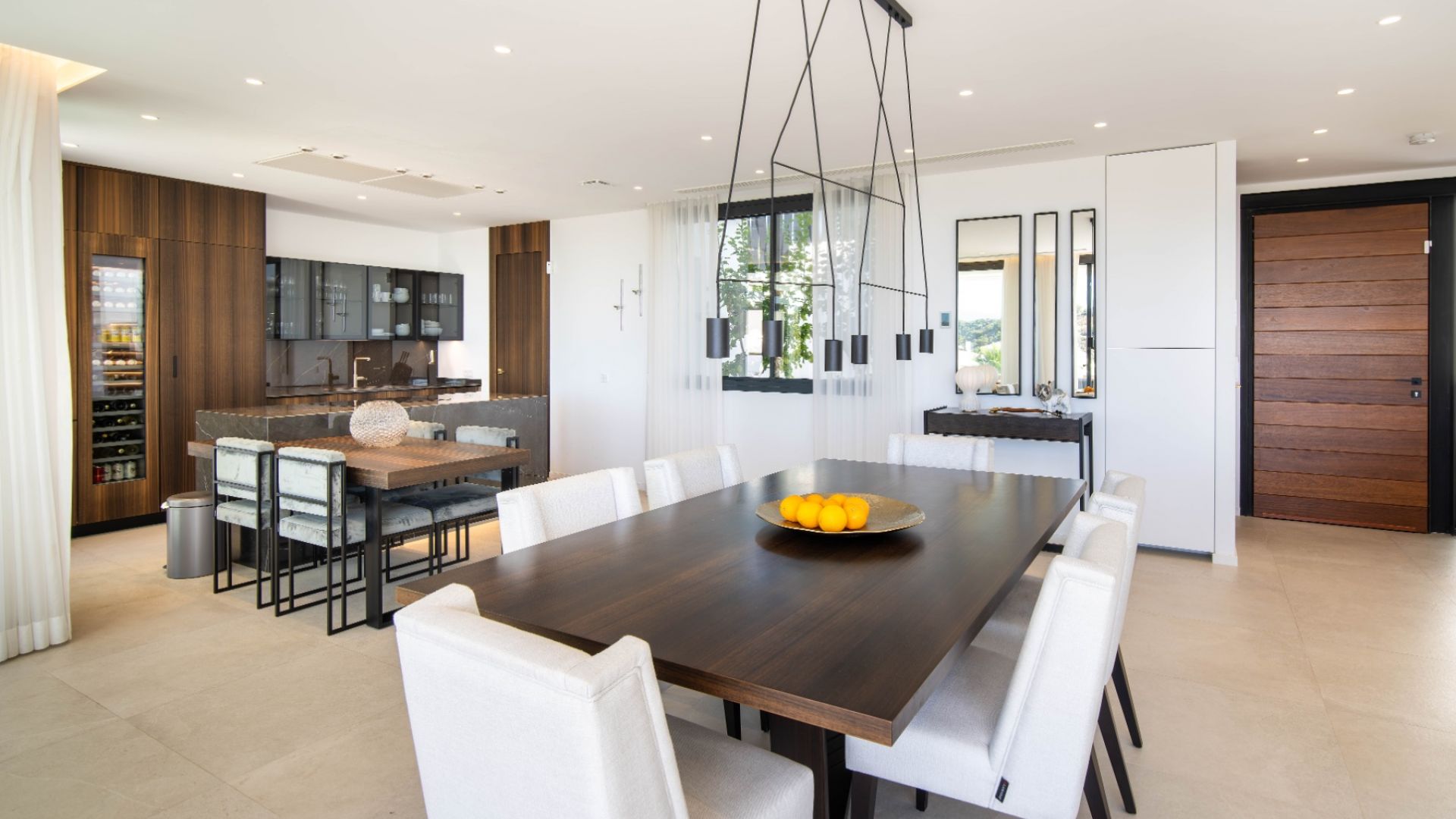 Los interiores son igualmente impresionantes, con una zona de estar de planta abierta, mobiliario elegante y un comedor con vistas espectaculares al exterior. La cocina a medida cuenta con carpintería de madera, una isla de mármol y electrodomésticos de alta gama Gaggenau. La terraza del nivel superior ofrece un espacio chill-out con vistas impresionantes al atardecer.