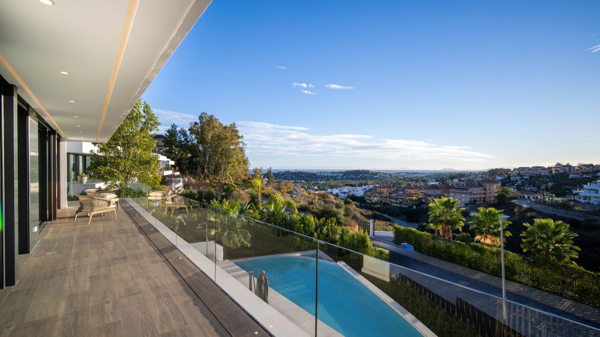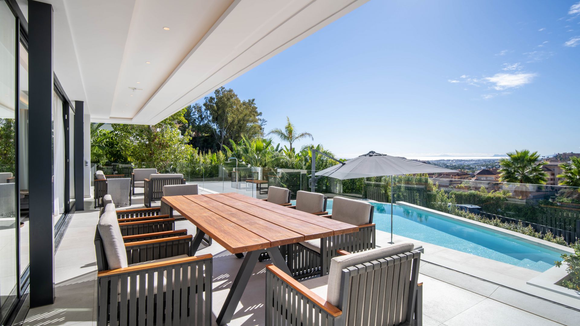 Esta moderna villa en Nueva Andalucía destaca por su arquitectura impresionante, con paredes exteriores blancas y ventanales de piso a techo. Su orientación suroeste garantiza abundante luz solar y ofrece vistas panorámicas de la zona circundante y del mar Mediterráneo. Amplias terrazas rodean la planta baja, ideales para comer al aire libre, descansar y tomar el sol, con una gran piscina infinita y zona de barbacoa. La conexión fluida entre los espacios interiores y exteriores realza la experiencia de vida. También dispone de un porche cubierto en la entrada.