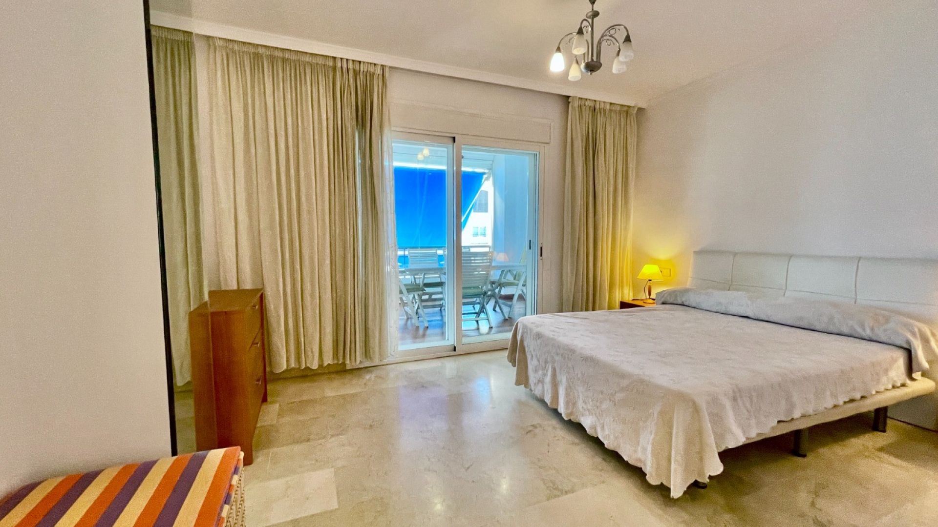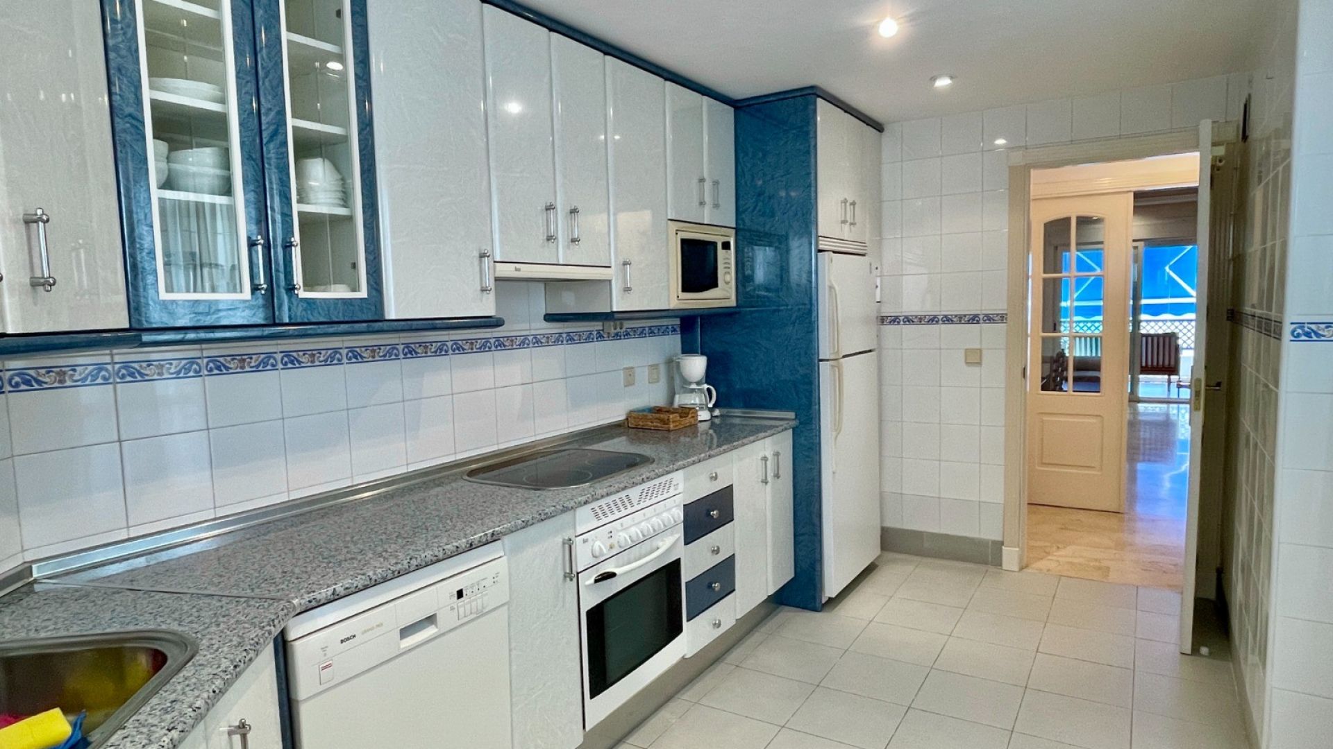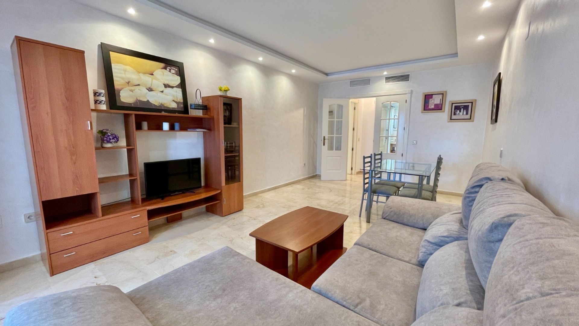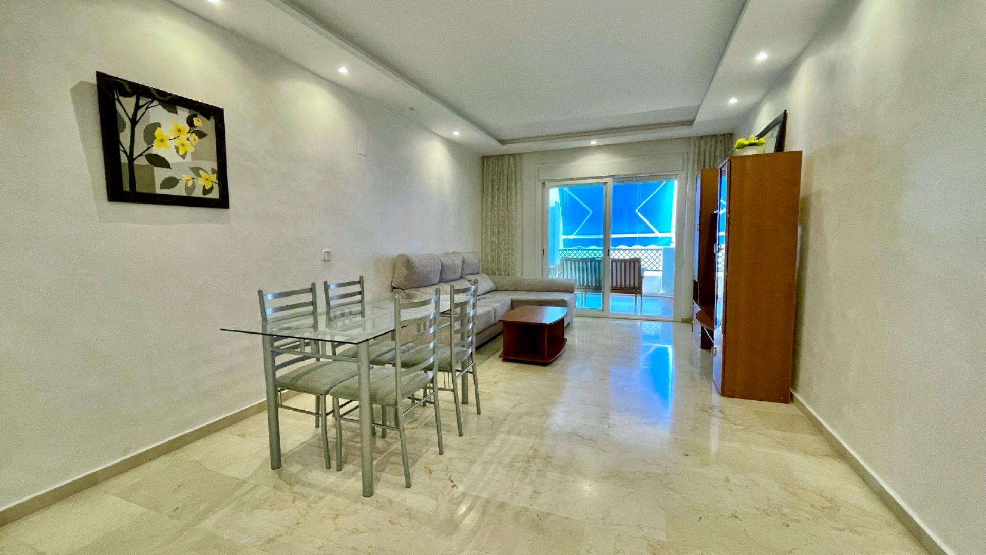 El apartamento cuenta con un amplio salón/comedor con terraza cerrada con cortinas Lumon, una cocina independiente con lavadero, un dormitorio principal con baño en suite, un segundo dormitorio y un baño completo. Los suelos son de mármol, con suelo de madera en la terraza, y dispone de aire acondicionado centralizado.