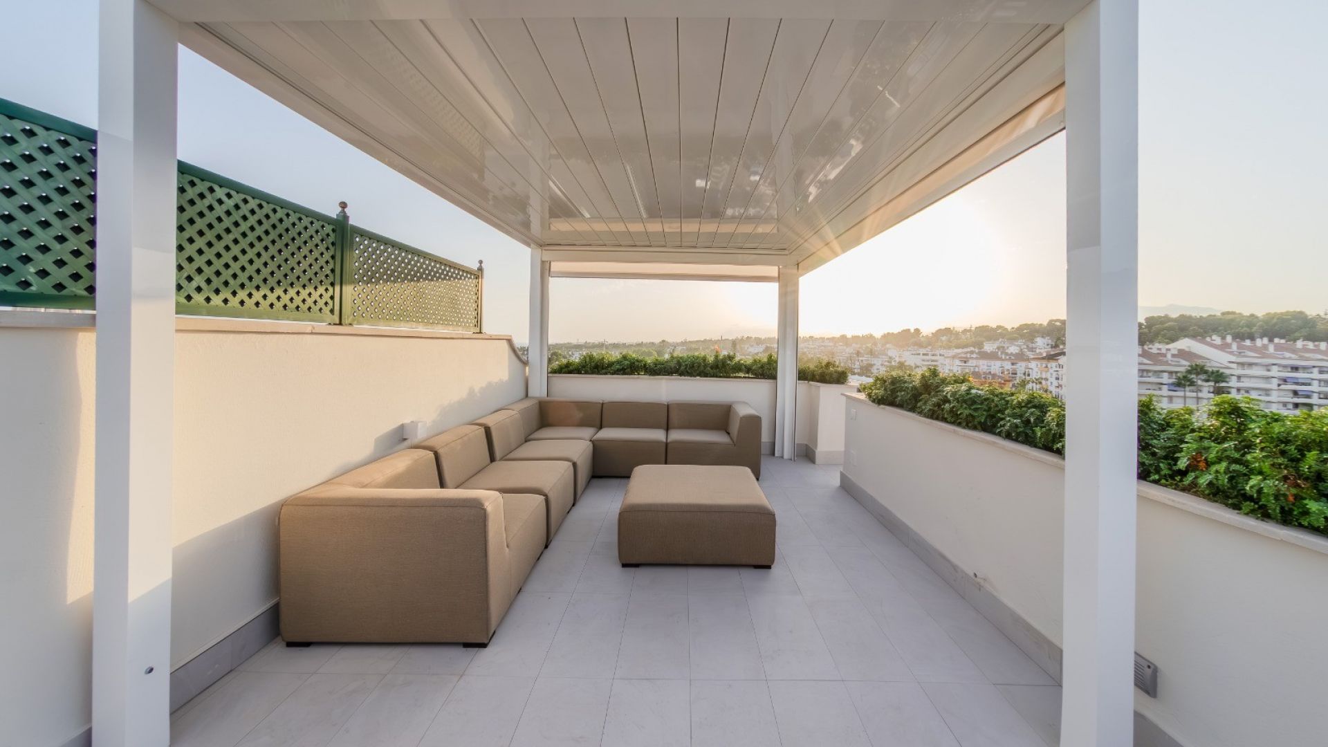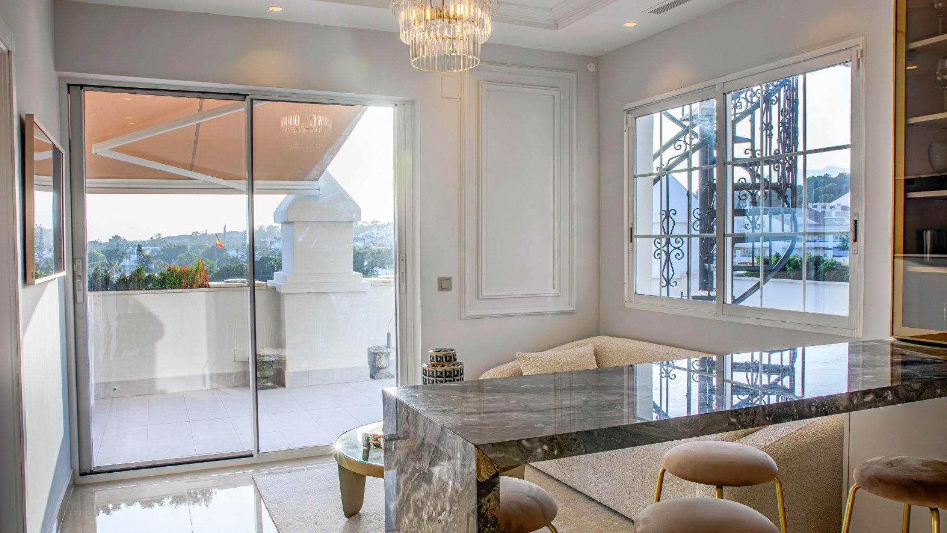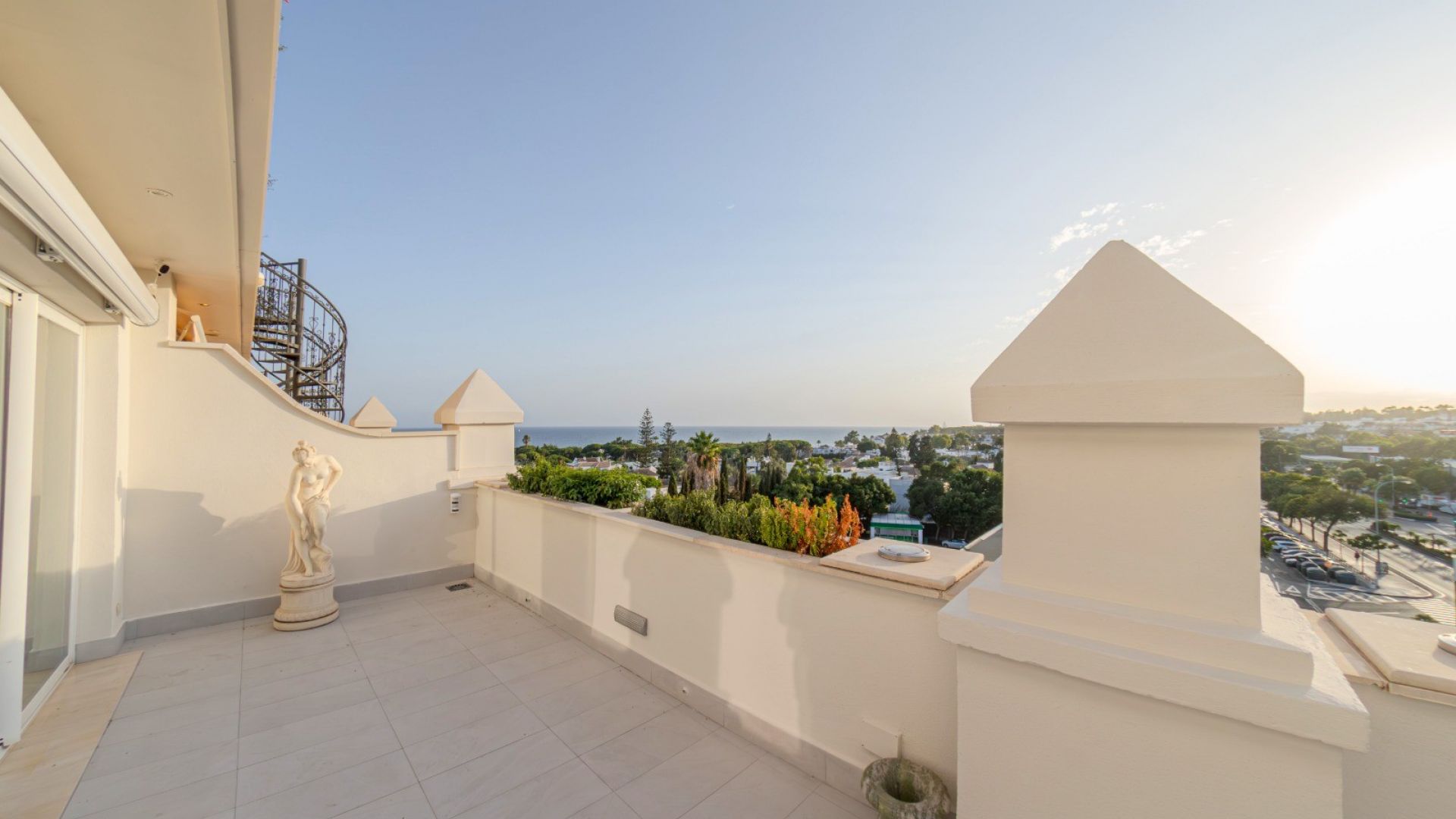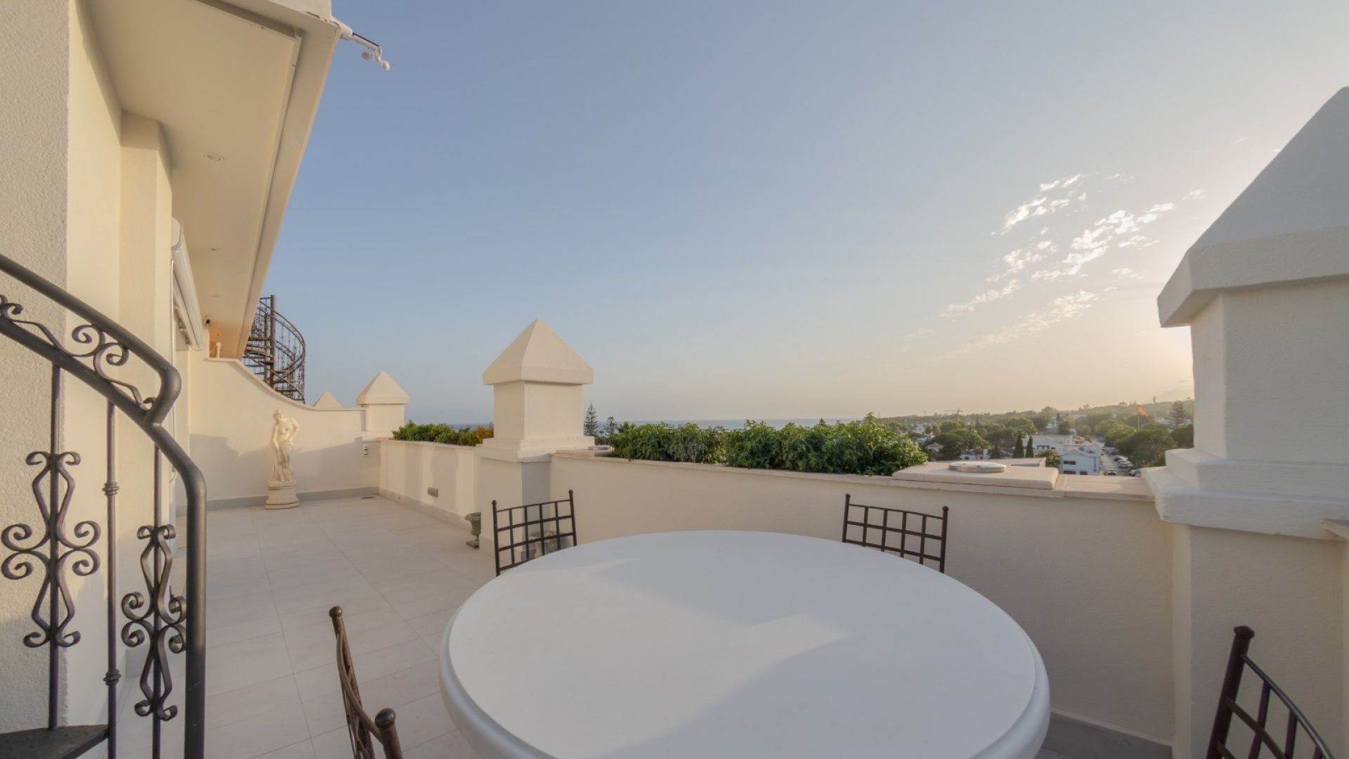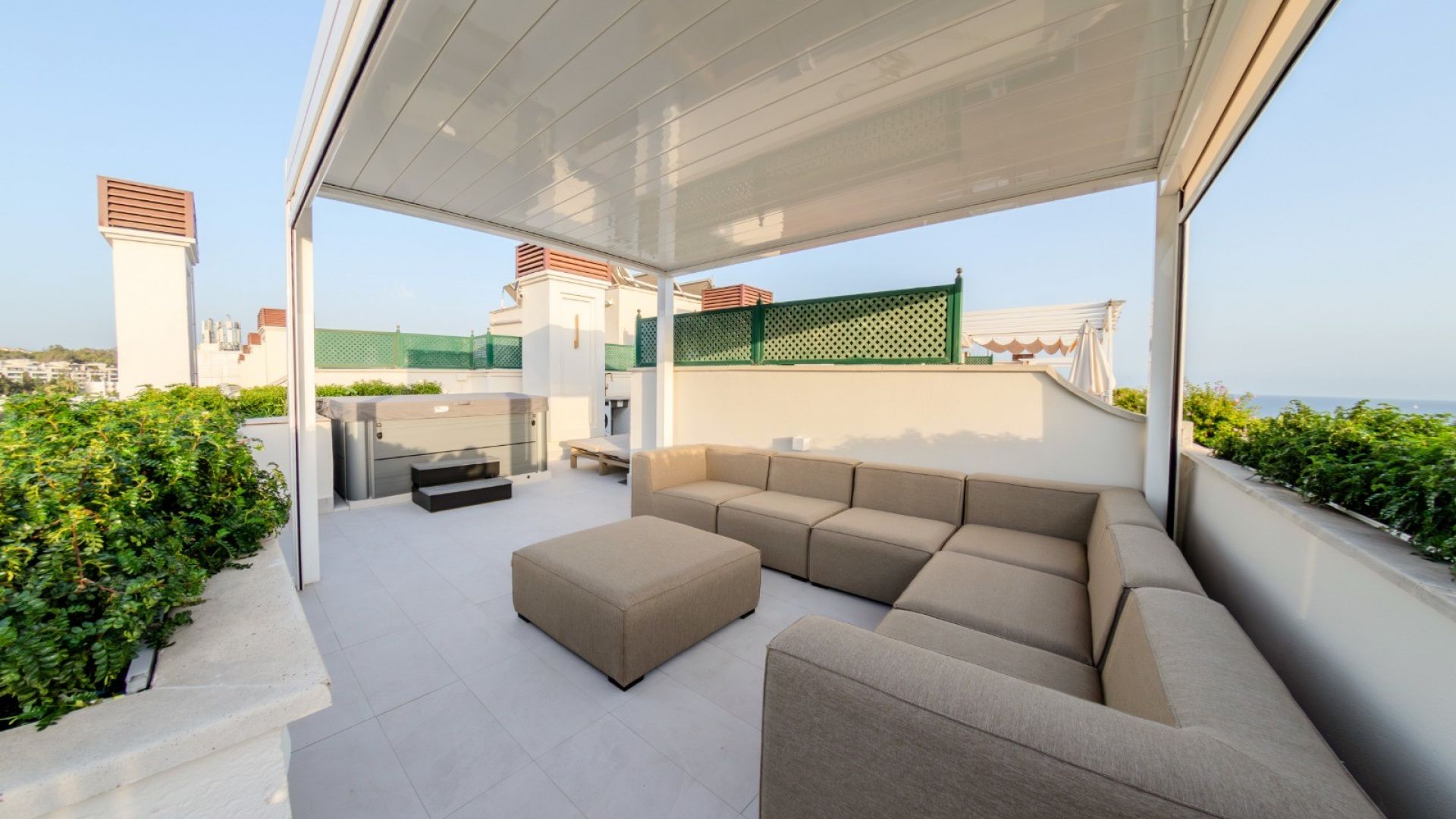 Uno de los principales atractivos de la propiedad es la terraza envolvente que proporciona un amplio espacio exterior para relajarse o disfrutar de momentos inolvidables. Desde la terraza, una escalera de caracol conduce a una terraza privada en la azotea, un oasis con jacuzzi, tumbonas y una acogedora zona chill-out bajo una pérgola, ideal para descansar o celebrar reuniones inolvidables.
