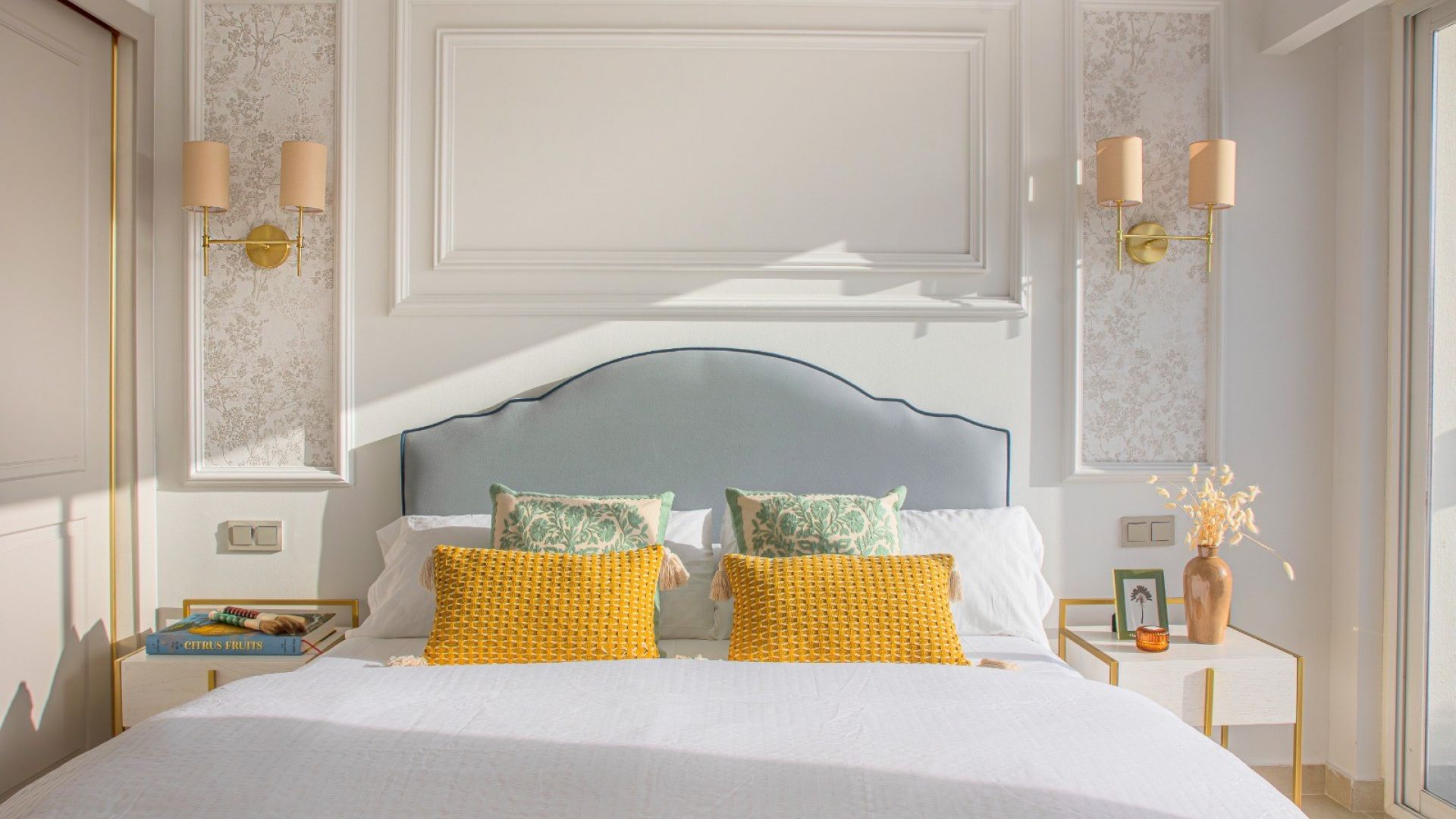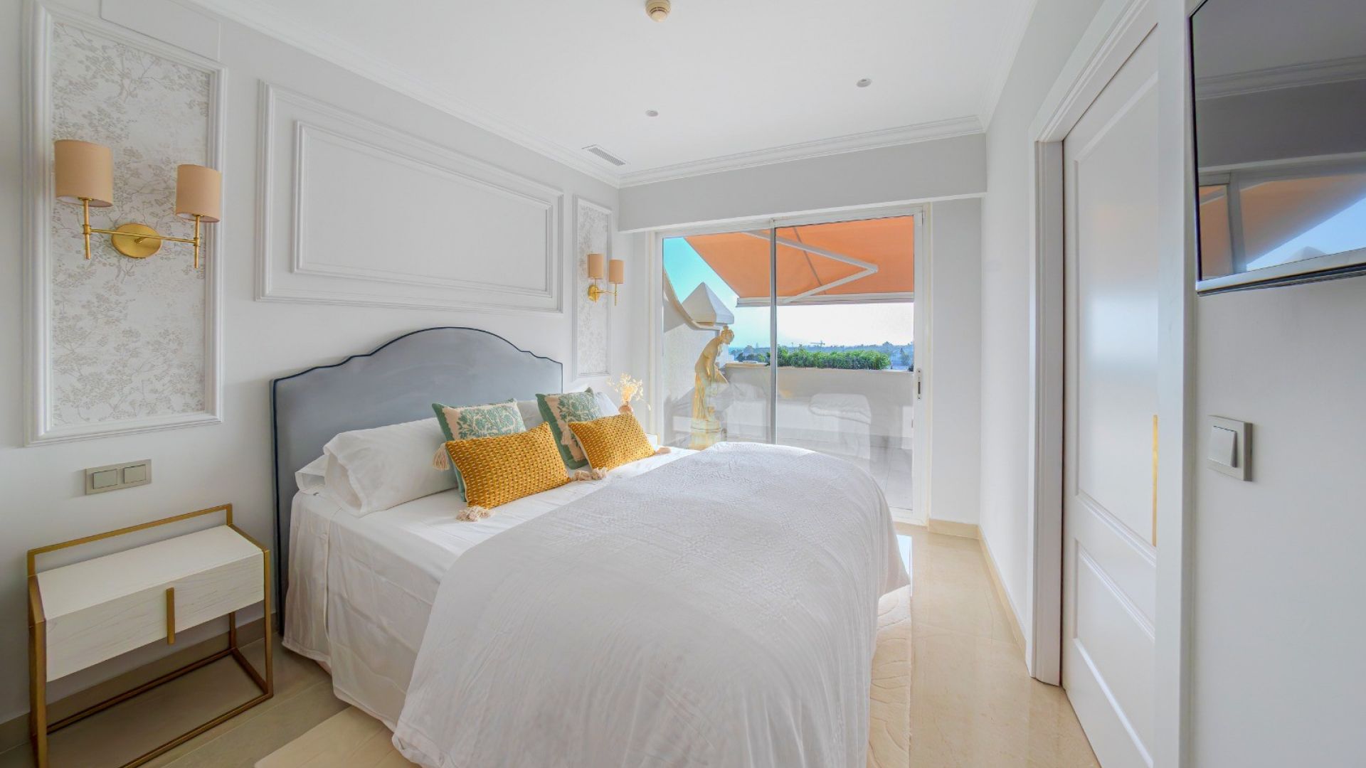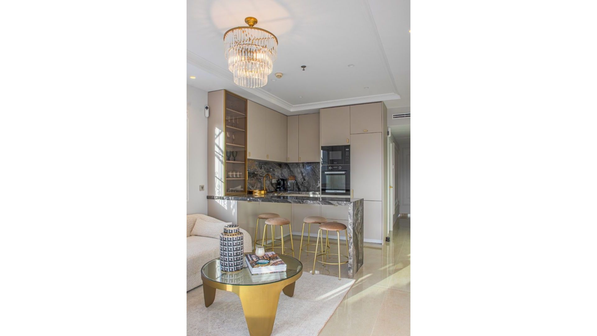 El ático cuenta con dos elegantes dormitorios. El principal dispone de un baño en suite, un amplio armario con puertas correderas y una televisión de pared. El segundo dormitorio ofrece espacio de almacenamiento y gran comodidad. Los dos baños están diseñados con materiales de alta calidad, con detalles en oro y modernas duchas a ras de suelo que añaden un toque de lujo.