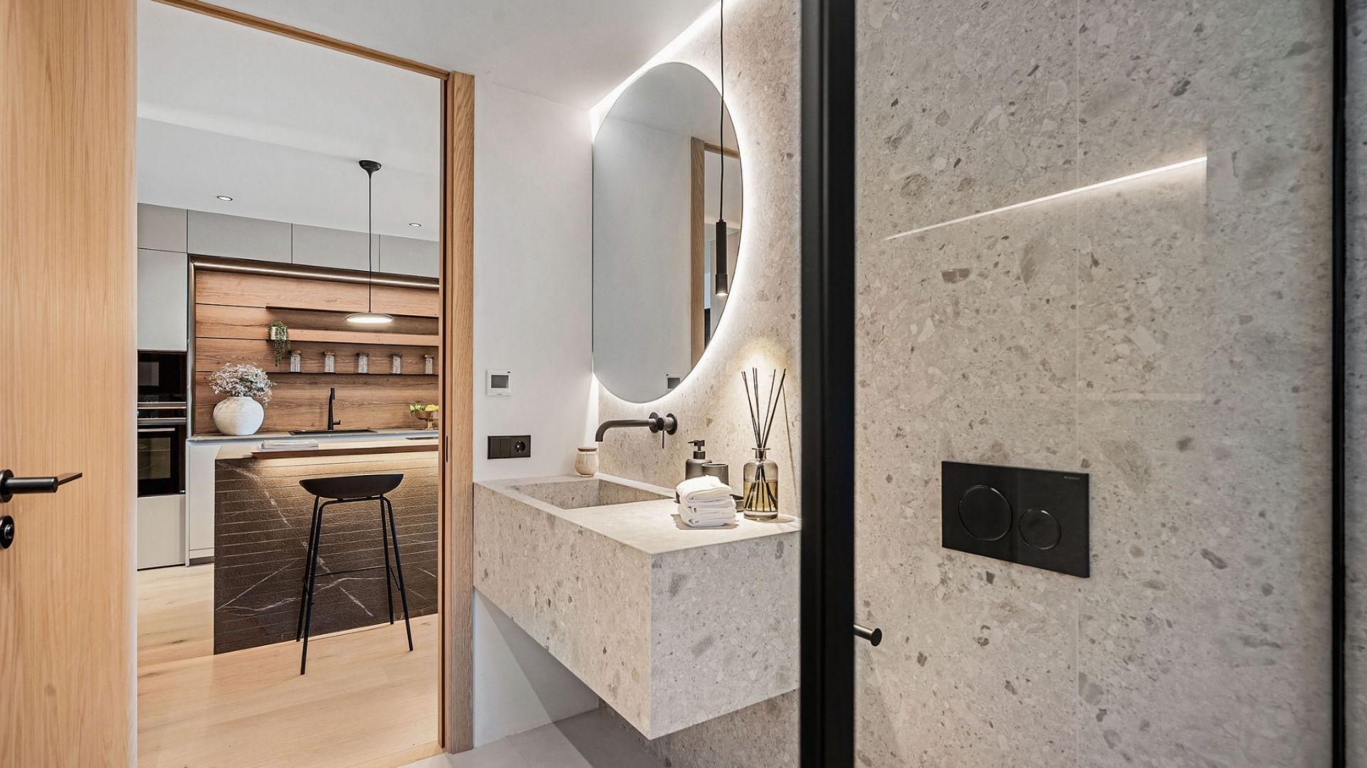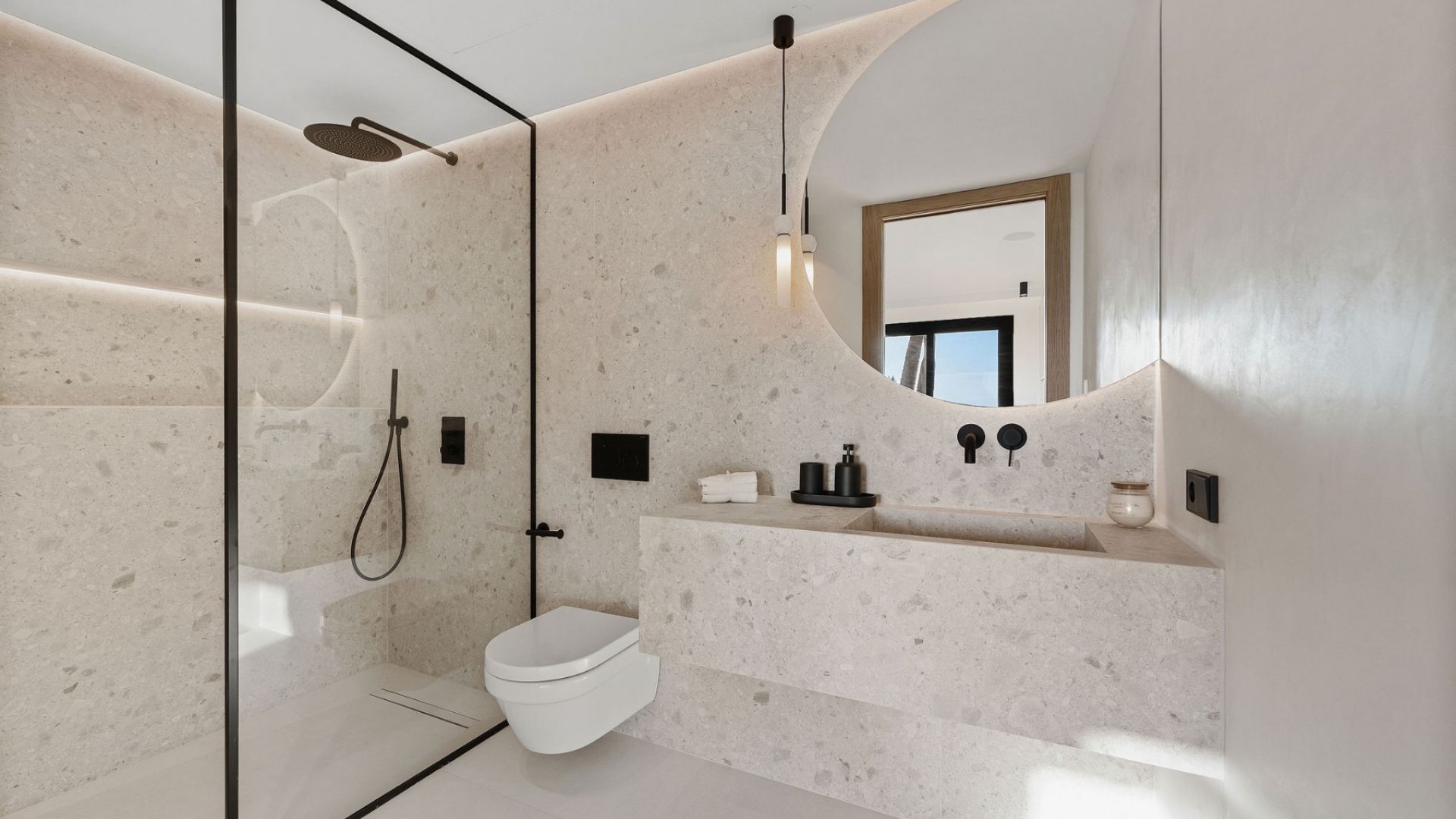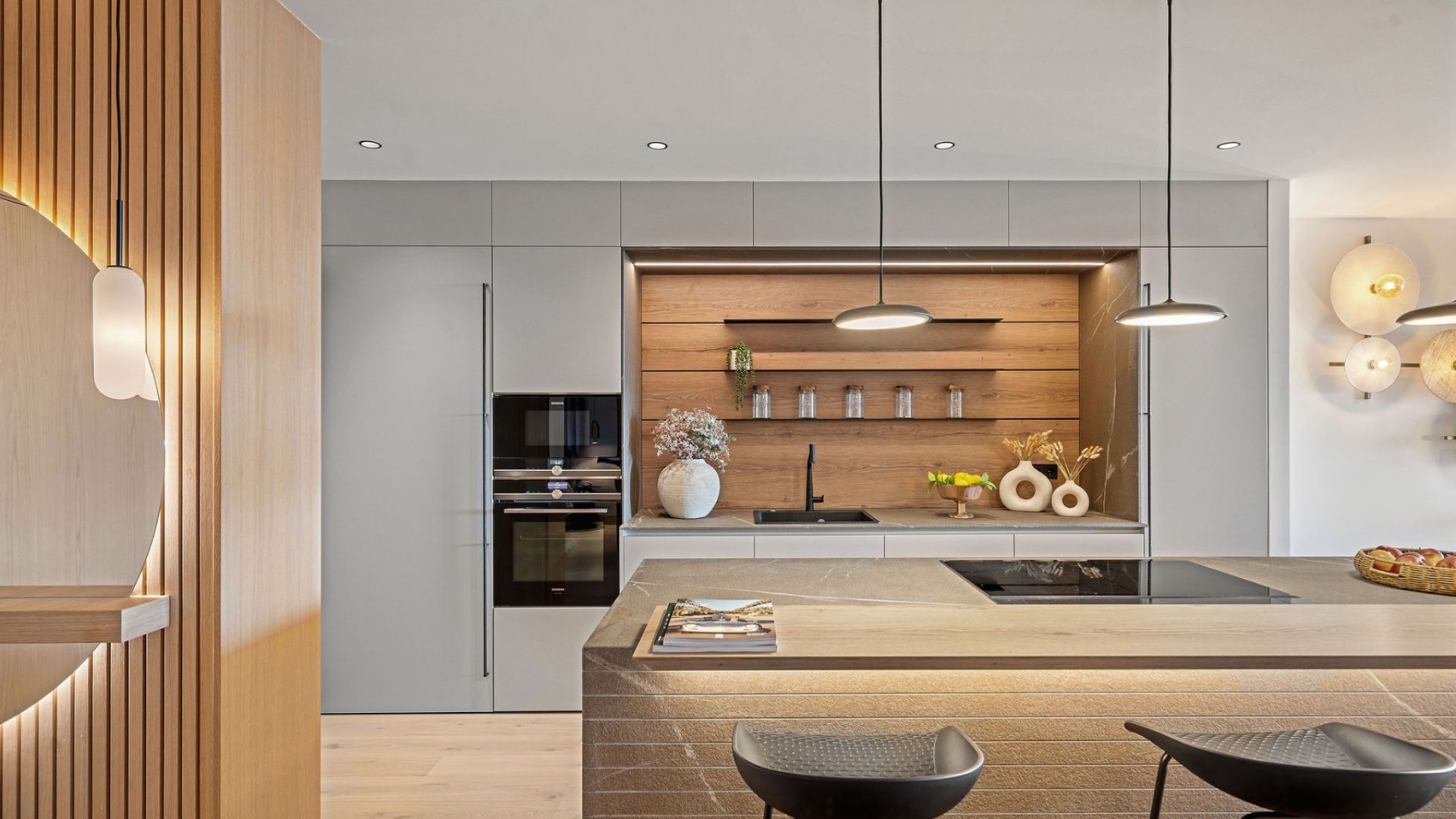 Con vistas panorámicas al Mediterráneo y a las montañas, la propiedad presenta un diseño abierto con detalles en madera y piedra. La cocina, equipada con electrodomésticos Siemens Studio Line y mobiliario de Decodan, es un espacio moderno y acogedor, mientras que los suelos de roble blanco aportan calidez y elegancia.