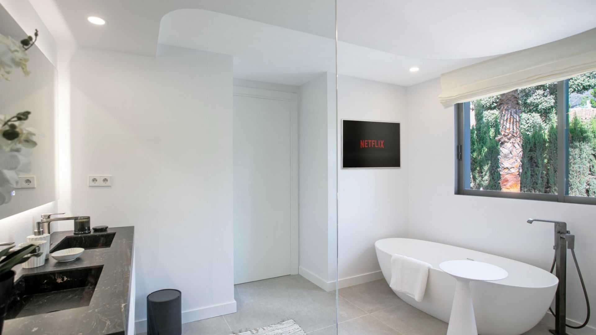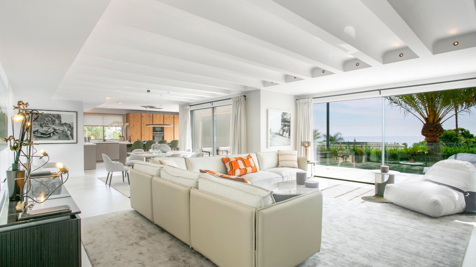 Set on a south-west facing plot with mature subtropical gardens, the villa combines contemporary style with Mediterranean charm. It offers breathtaking panoramic sea views from the living area and master bedroom, as well as stunning views of La Concha Mountain. The spacious and bright interior includes a living area with an integrated modern fireplace, a dining area, a sleek contemporary kitchen, five bedrooms, five bathrooms, one guest toilet, a wine cellar, a guest room, storage space, and a garage for three cars. Natural light flows throughout the villa, creating a harmonious connection between indoor and outdoor spaces.