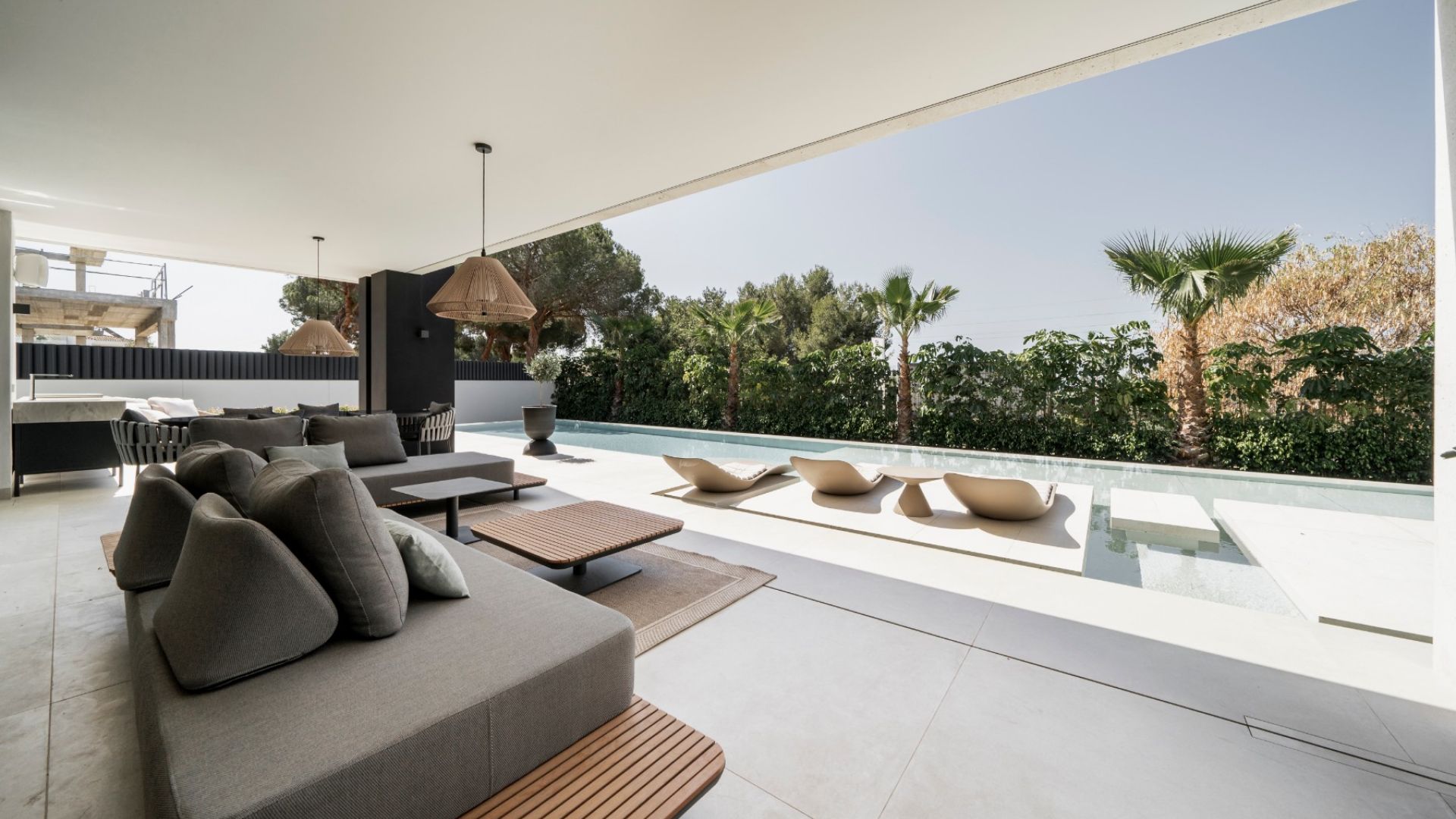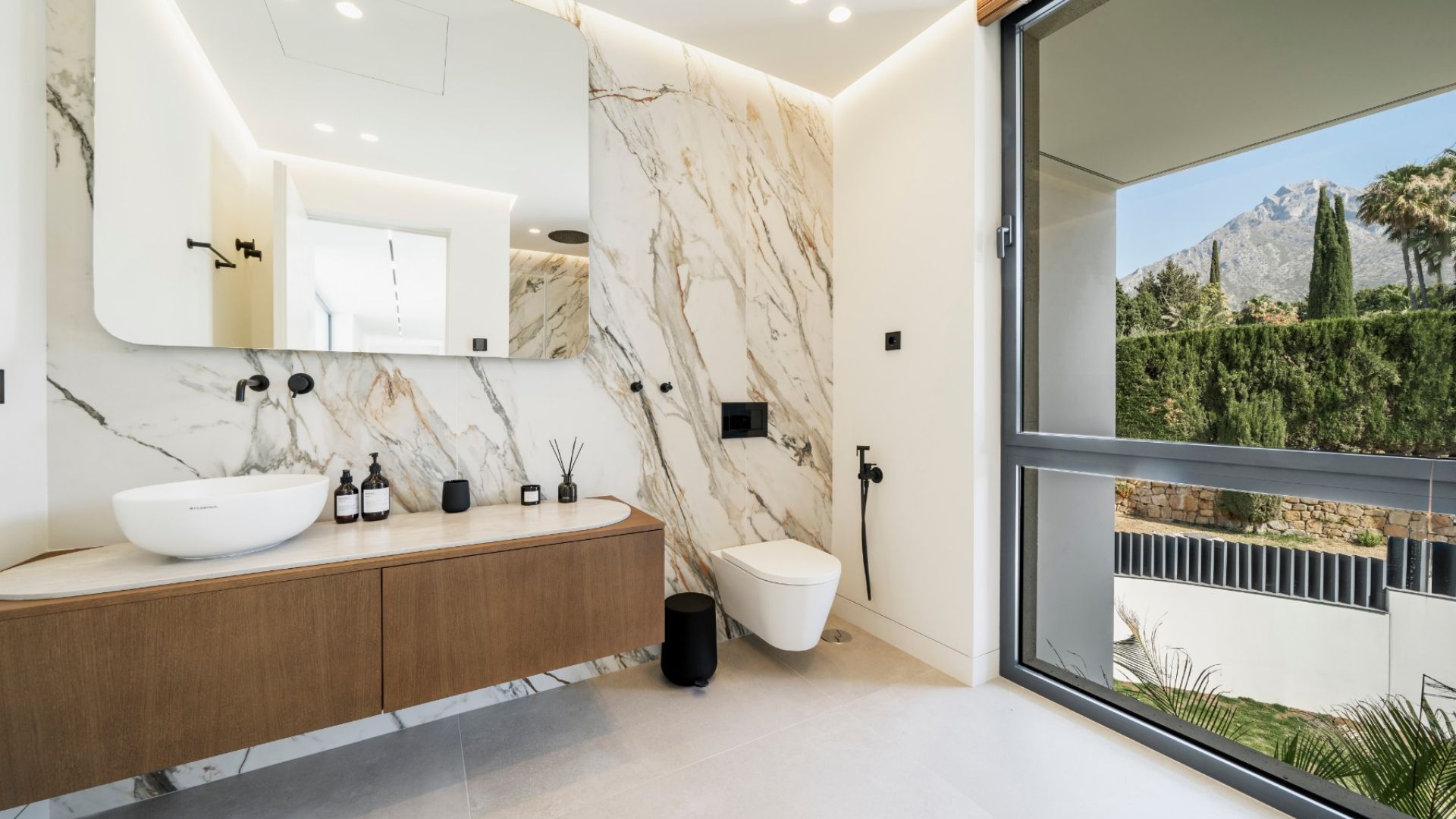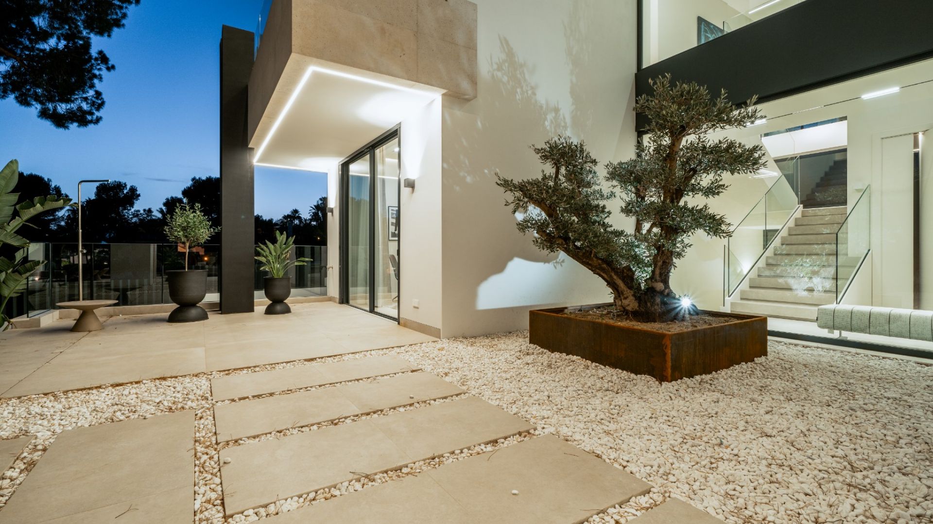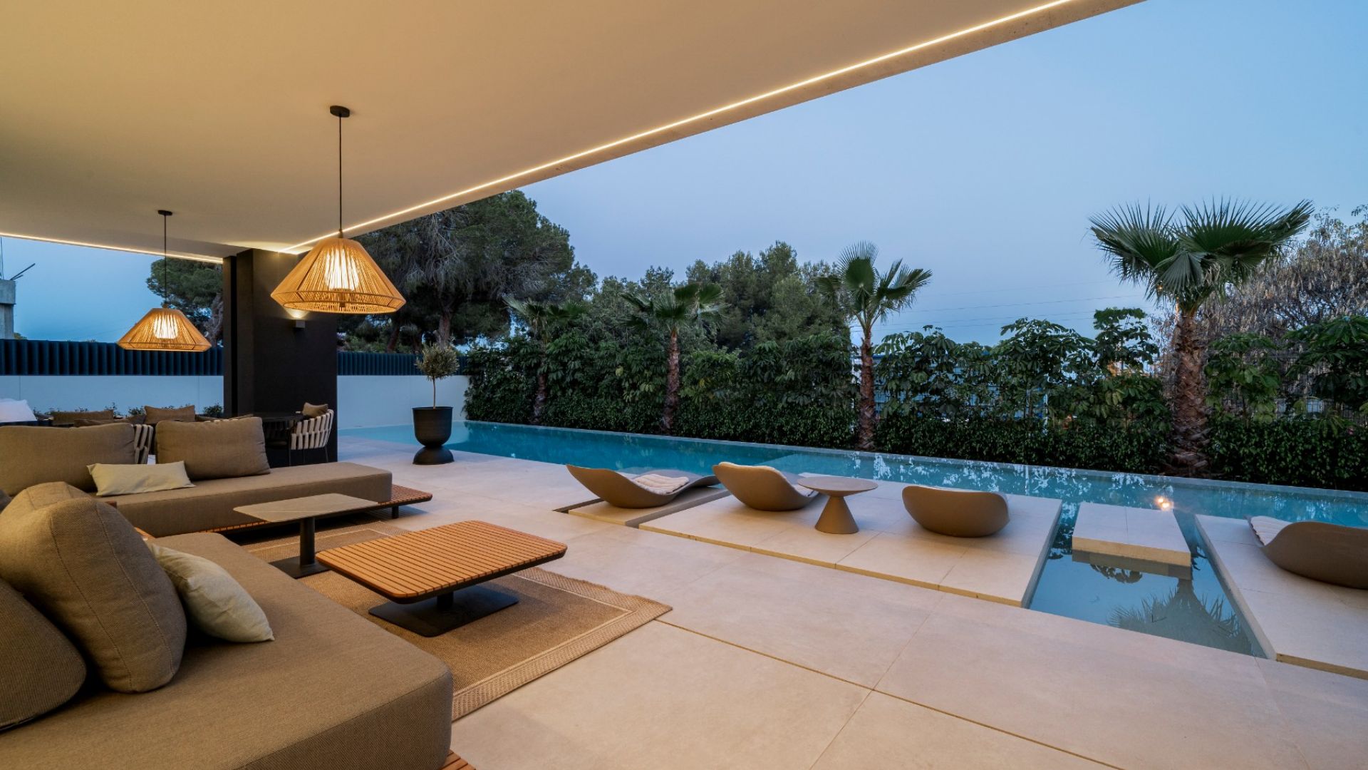 Situated in the exclusive Rodio de Nagüeles area, this sophisticated newly built villa sits on a 1,050m² plot adorned with palm trees and pines. Its south-facing orientation ensures abundant natural light throughout the day.