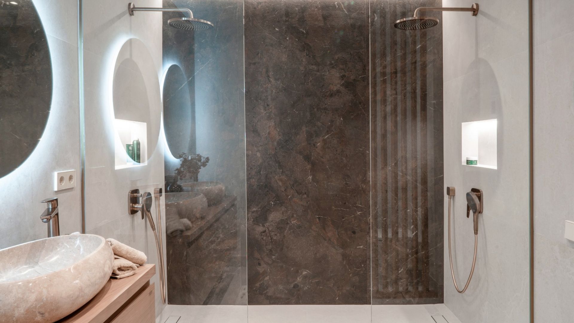 Two of the bedrooms are generously sized, featuring built-in wardrobes with ample storage space. The master bedroom and a second bedroom include en-suite bathrooms, while the third bedroom benefits from a separate bathroom. All the bathrooms are in perfect condition and offer underfloor heating throughout.