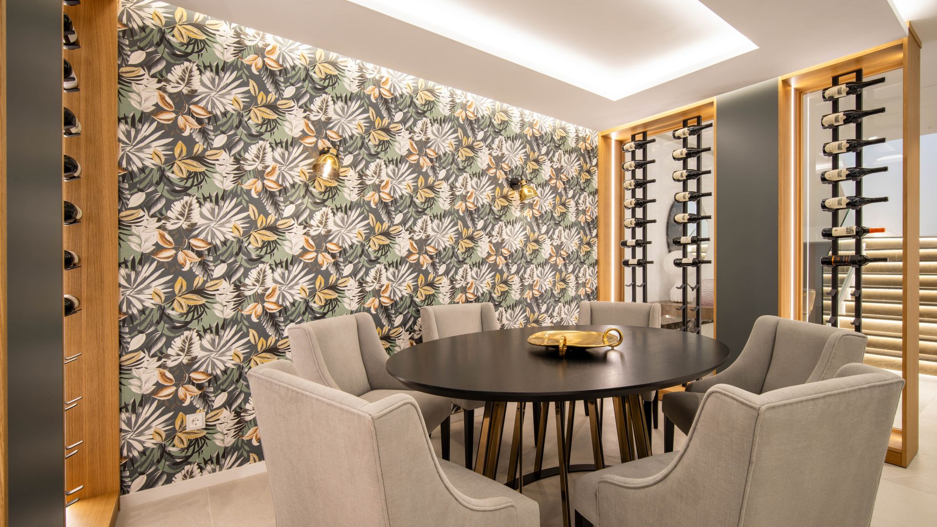 The interiors are equally impressive, with an open-plan living area, stylish furnishings, and a dining area with incredible outdoor views. The bespoke kitchen features wooden cabinetry, a marble island, and state-of-the-art gaggenau appliances. The upper-level terrace provides a chill-out area with stunning sunset views.