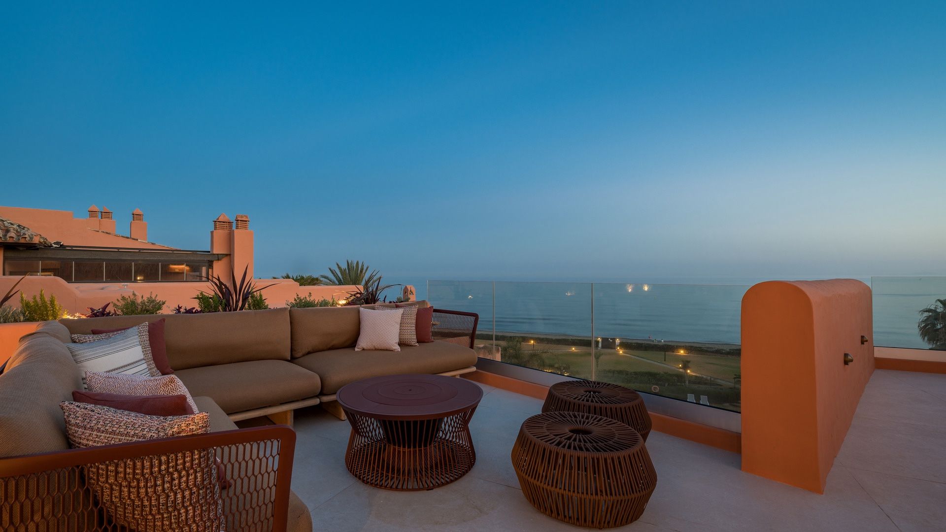 This exceptional residence showcases exclusive interior design, elegant contemporary furniture, custom-built wardrobes, a new Siematic designer kitchen with Miele appliances, a Bang & Olufsen sound system, an electric fireplace, and stylish Kettal outdoor furniture. From both terraces, you can admire the stunning beauty of a frontline beach location, with breathtaking views of the Mediterranean coastline extending to Gibraltar and North Africa. The property also includes 2 underground parking spaces and a storage room.