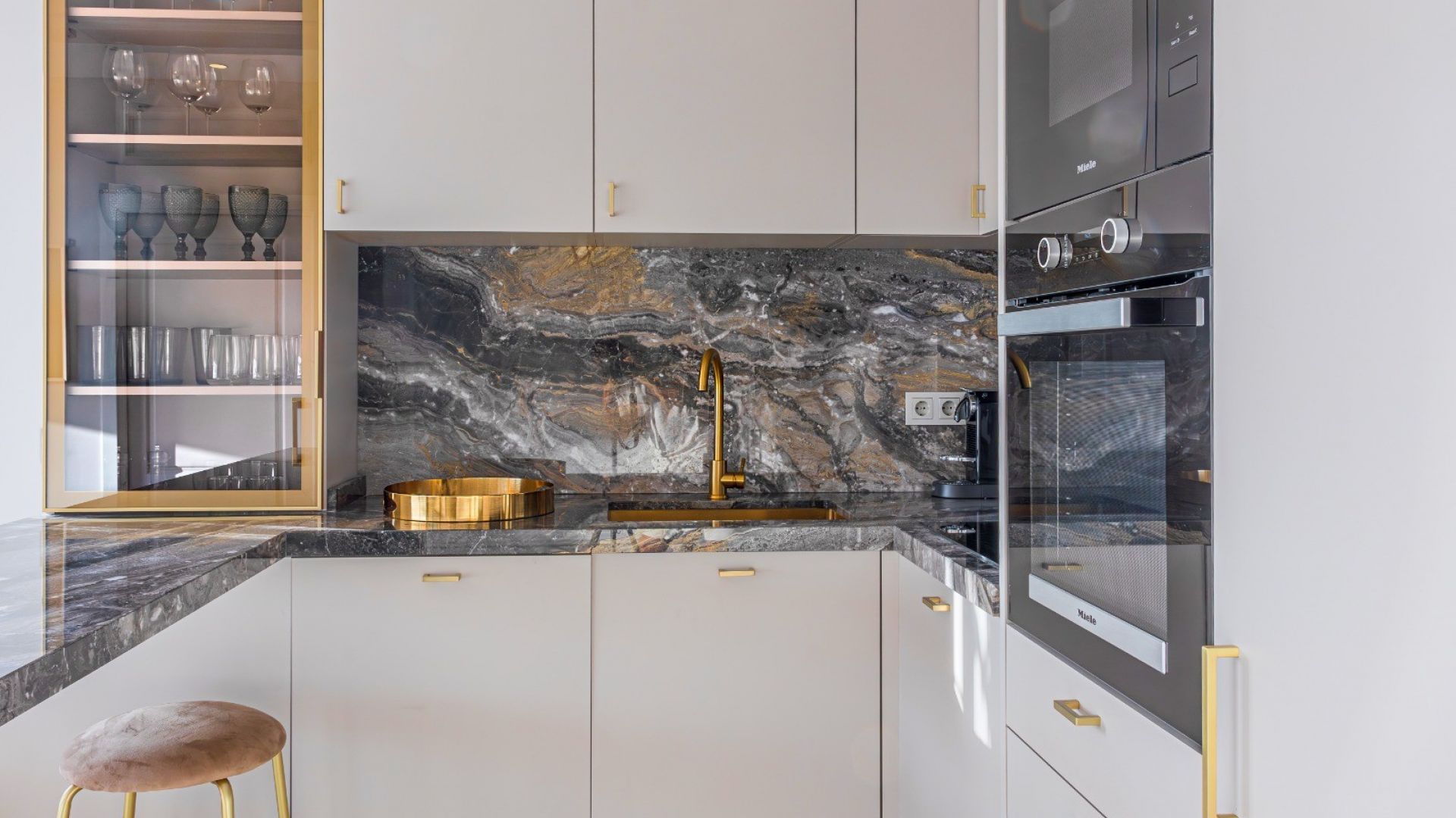The penthouse includes two elegant bedrooms. The master bedroom boasts an ensuite bathroom, a spacious sliding-door wardrobe, and a wall-mounted TV, while the second bedroom provides ample storage and comfort. The two bathrooms are exquisitely designed with premium materials, featuring gold accents and chic walk-in showers that exude luxury.
