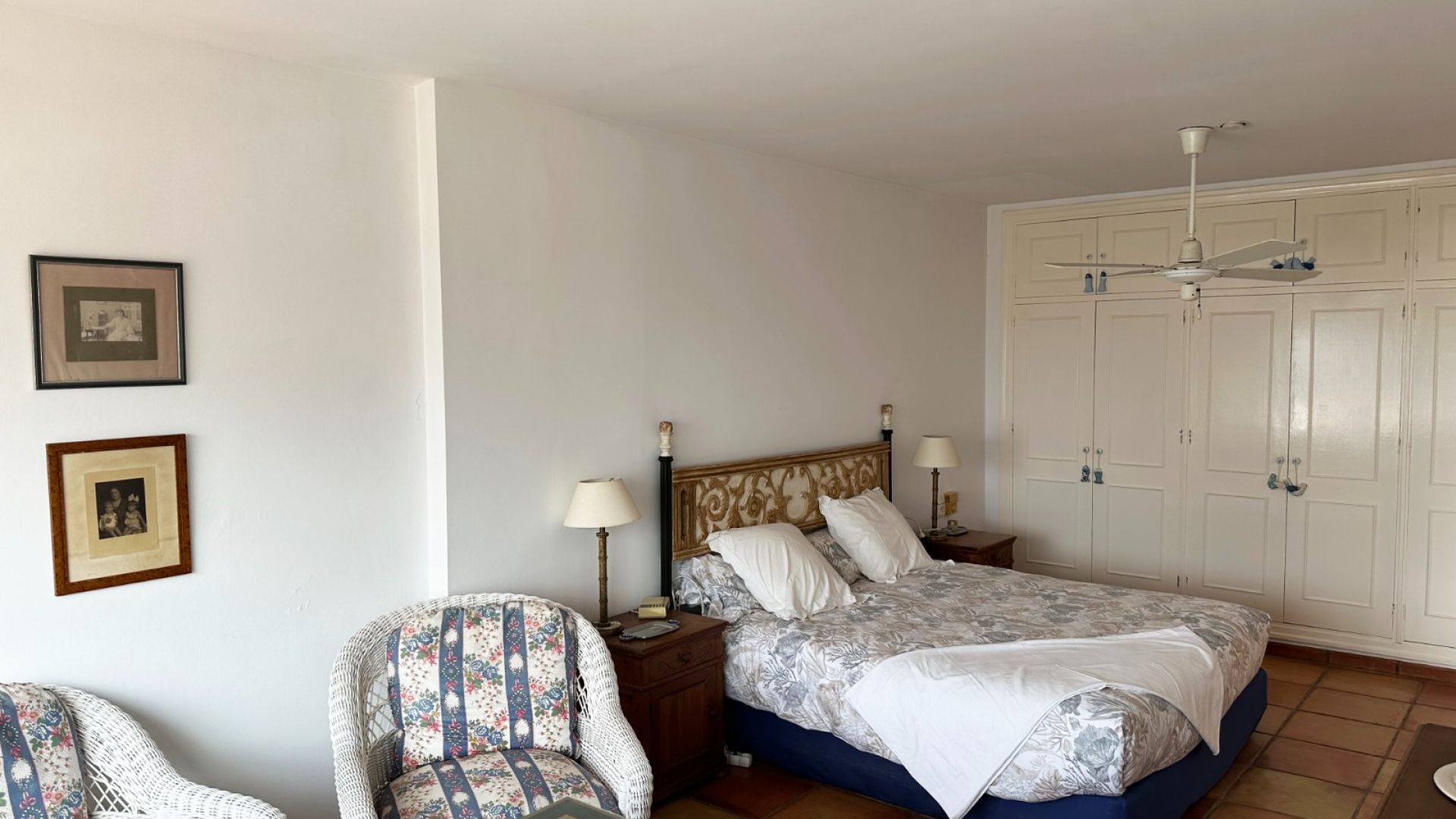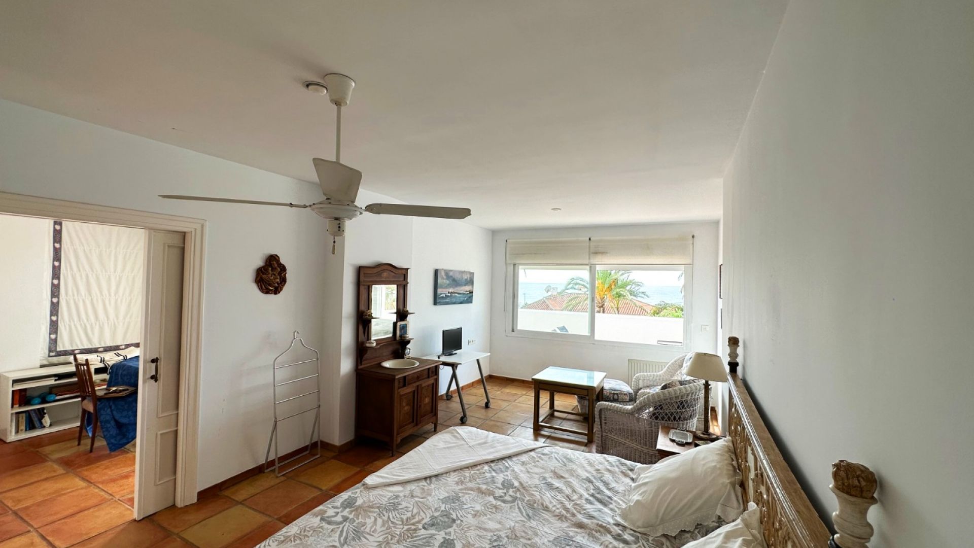 The home is spread across two levels. On the ground floor, you'll find a spacious living area with a dining room and a separate kitchen, which could easily be opened up in the future. The kitchen also has a separate entrance from the back, where you'll discover an additional room that can serve as a staff or guest room. There are also two bedrooms and two bathrooms on this level. The second floor features three more bedrooms and two bathrooms, including a master bedroom with an en-suite bathroom and direct access to the front terrace, offering beautiful sea views.