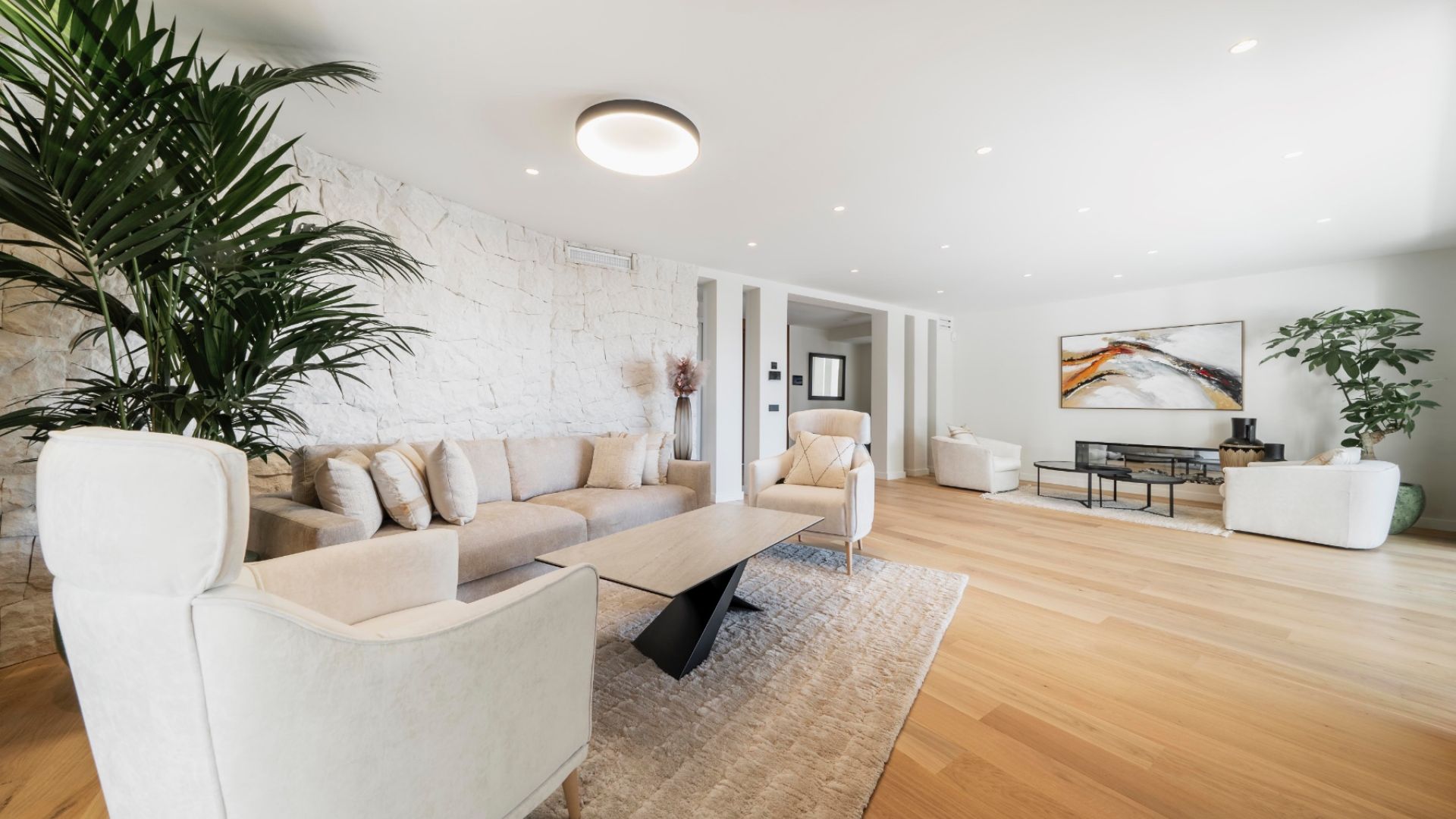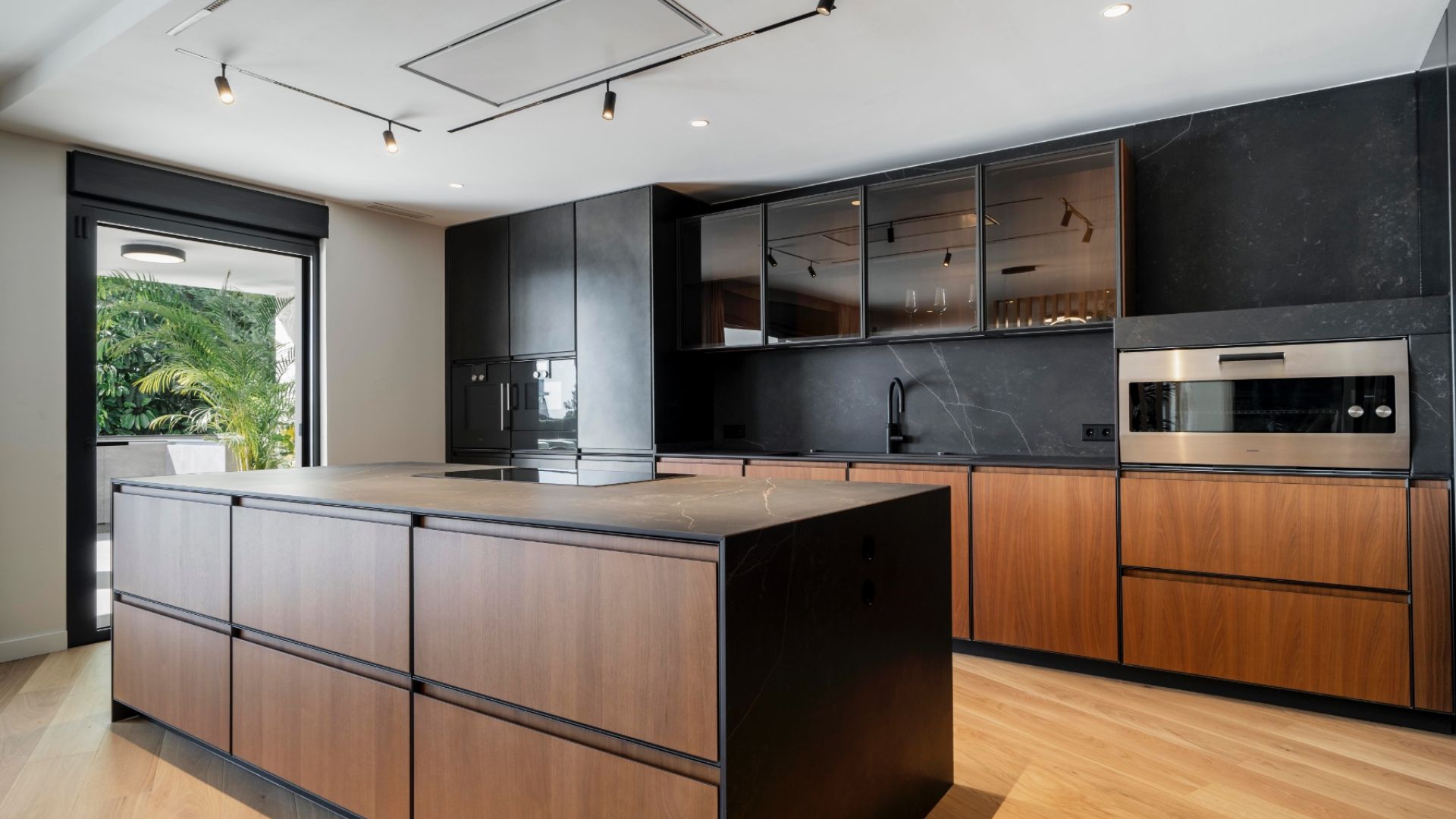 The layout is designed for both privacy and entertaining. The grand entrance opens to a central hallway, with a guest bathroom to the right and a spacious living room ahead. The open-plan kitchen, fitted with Gaggenau appliances, flows into a dining area and lounge, all framed by floor-to-ceiling windows that lead to a large terrace. The outdoor space includes a kitchen, barbecue, lounge area, and stairs down to the pool, surrounded by a solarium and a beautifully landscaped garden with avocado, lemon, and mango trees.