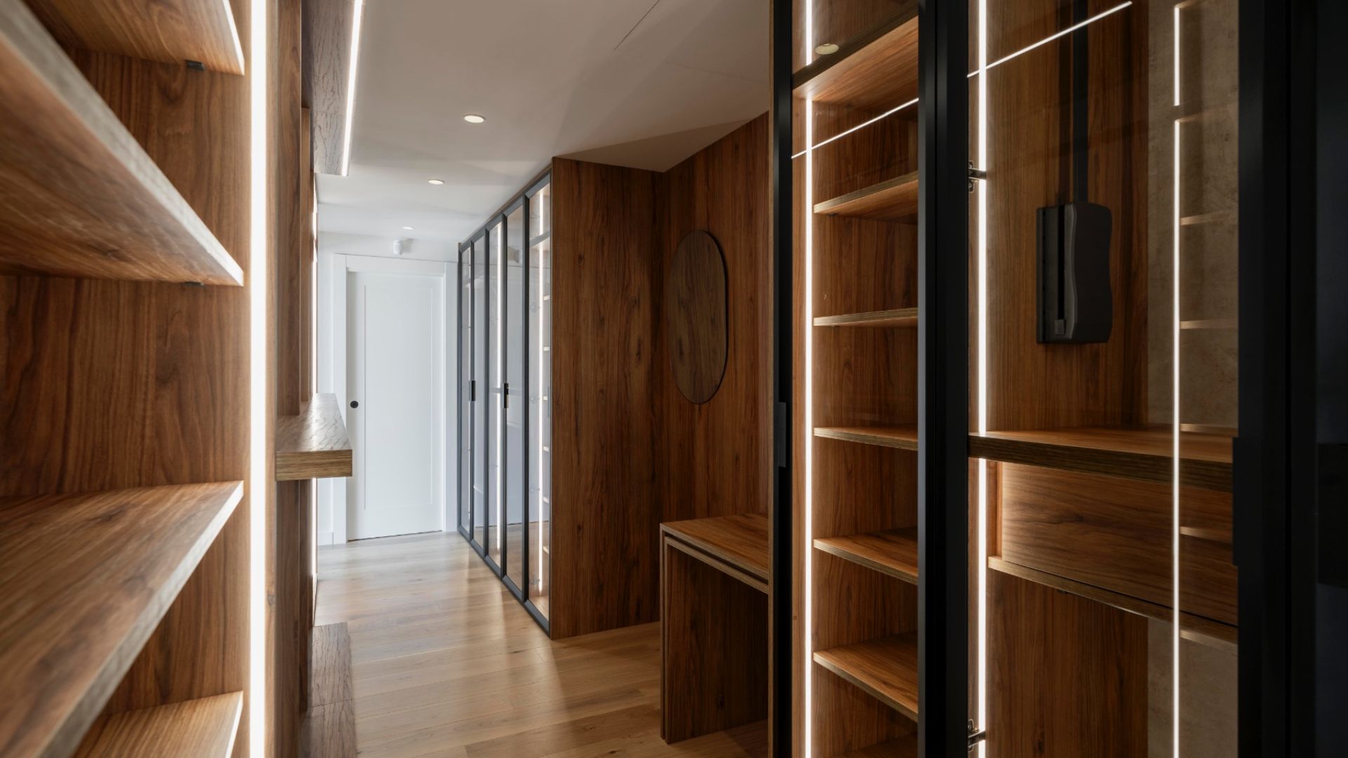 To the left, a corridor leads to three bedrooms (one en-suite) and a full bathroom, all with views of the garden, pool, and sea. A staircase or elevator takes you to the upper floor, dedicated to the master suite, which includes two bathrooms, a walk-in closet, and a private terrace overlooking the Mediterranean.