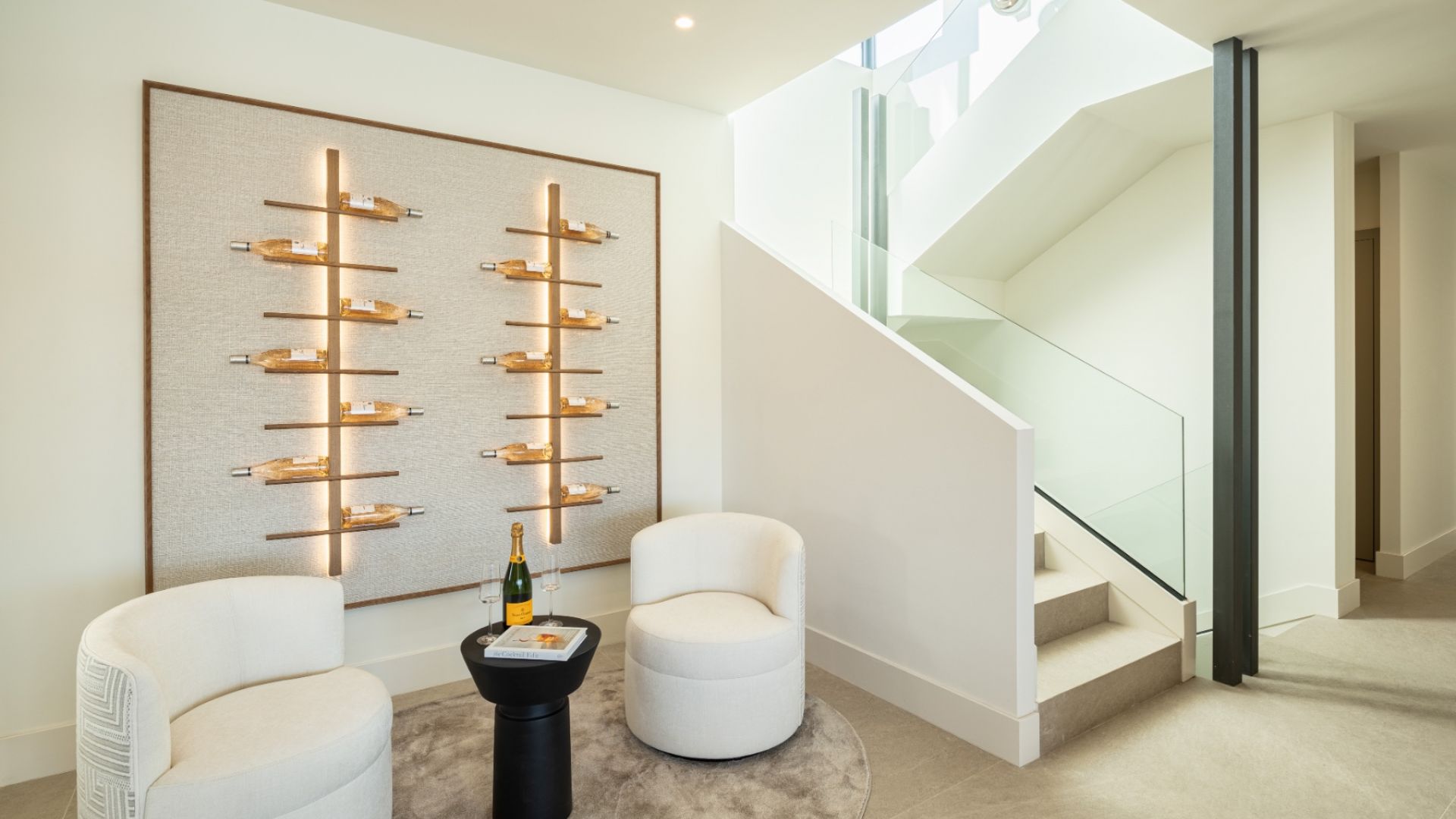 A striking staircase with an artistic chandelier leads to the lower level, where a cutting-edge kitchen with Siemens appliances, a dining area featuring a wine display wall, and access to a large terrace await. The outdoor space includes an infinity pool, barbecue, and lounge area—ideal for entertaining.