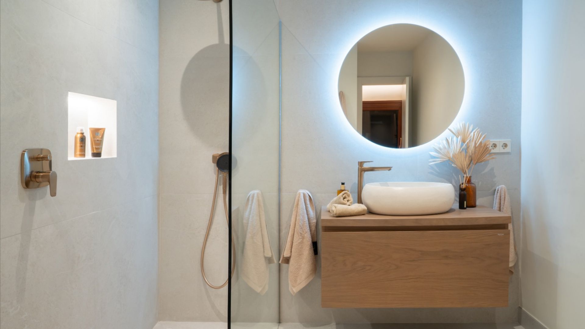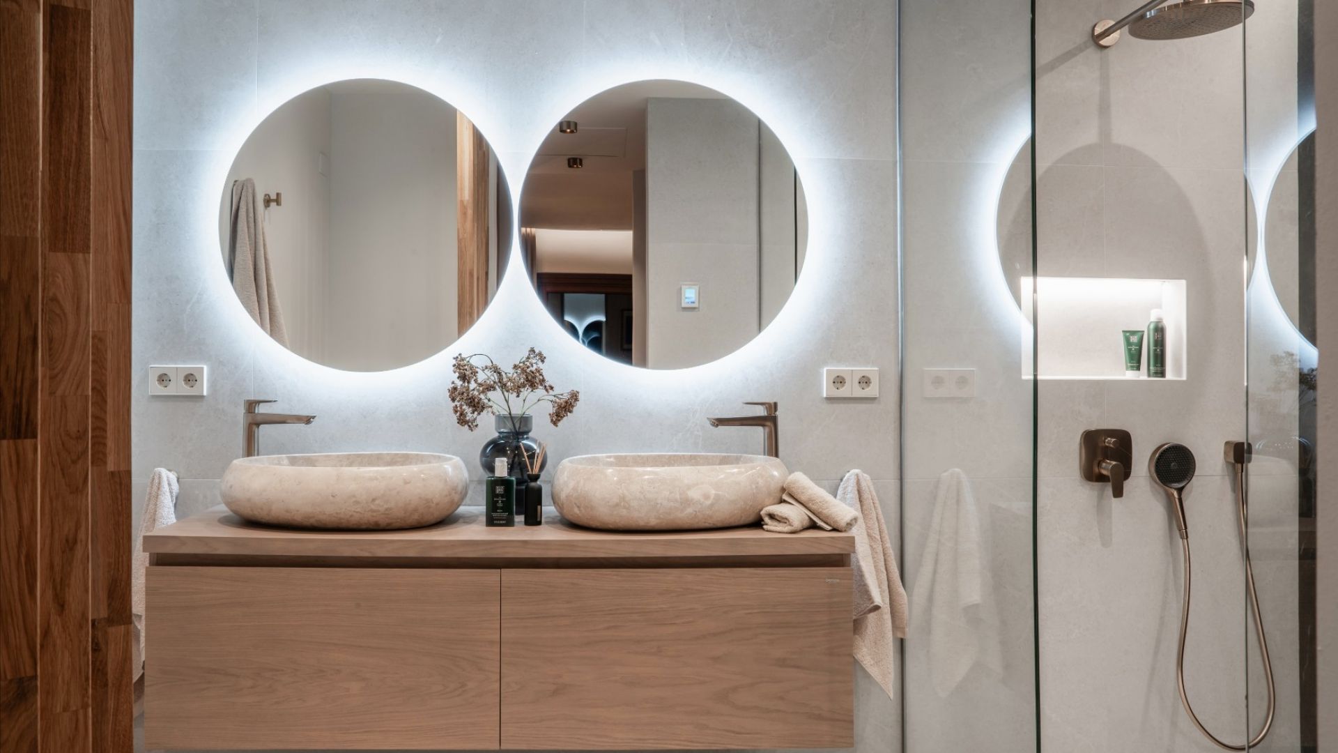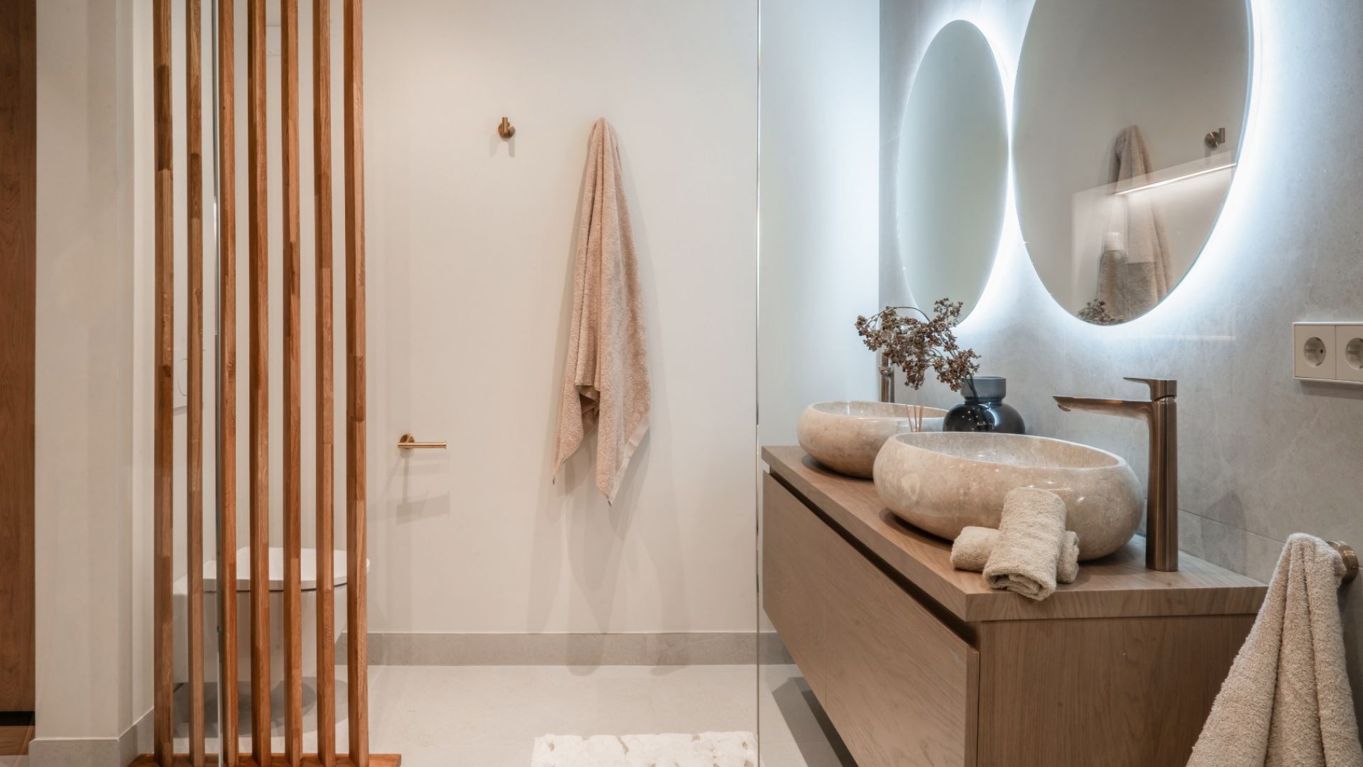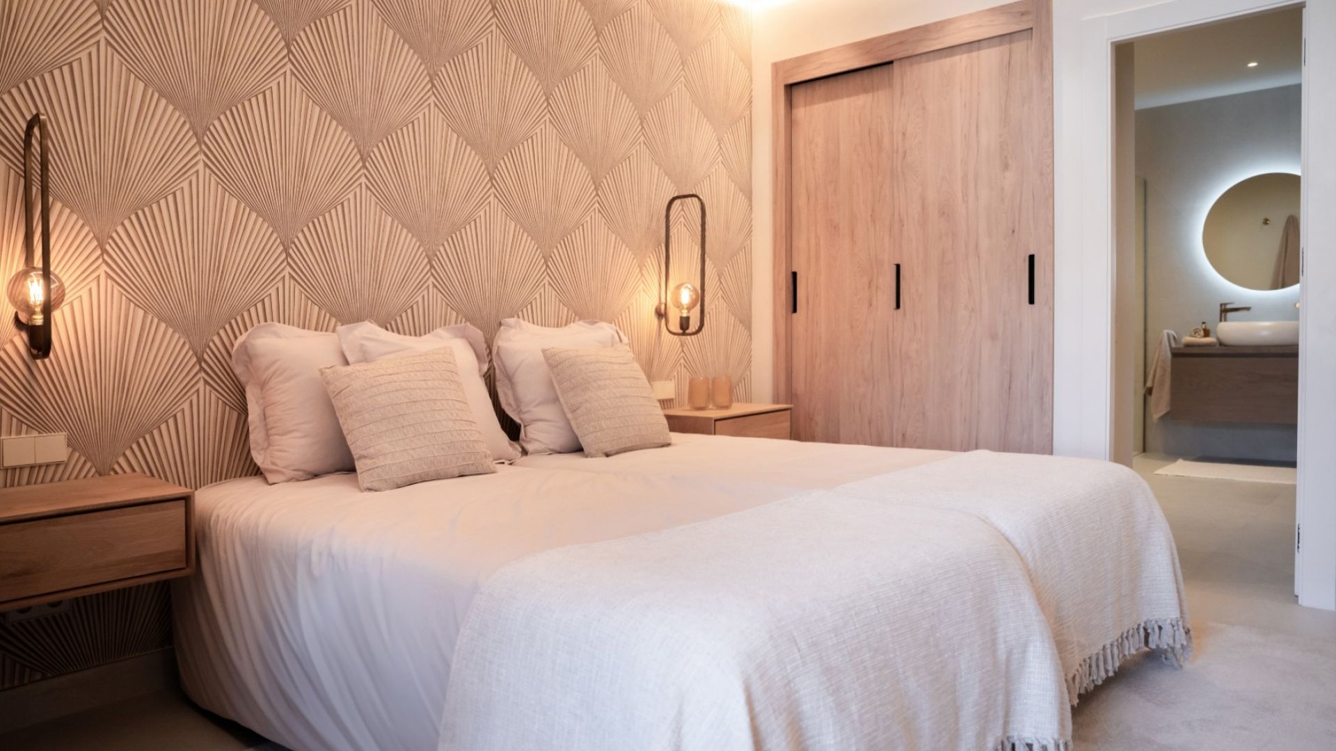 Две спальни имеют большие размеры и оборудованы встроенными шкафами, предоставляющими достаточно места для хранения. Главная спальня и вторая спальня имеют собственные ванные комнаты, а третья спальня пользуется отдельной ванной комнатой. Все ванные комнаты находятся в отличном состоянии и оборудованы полами с подогревом.