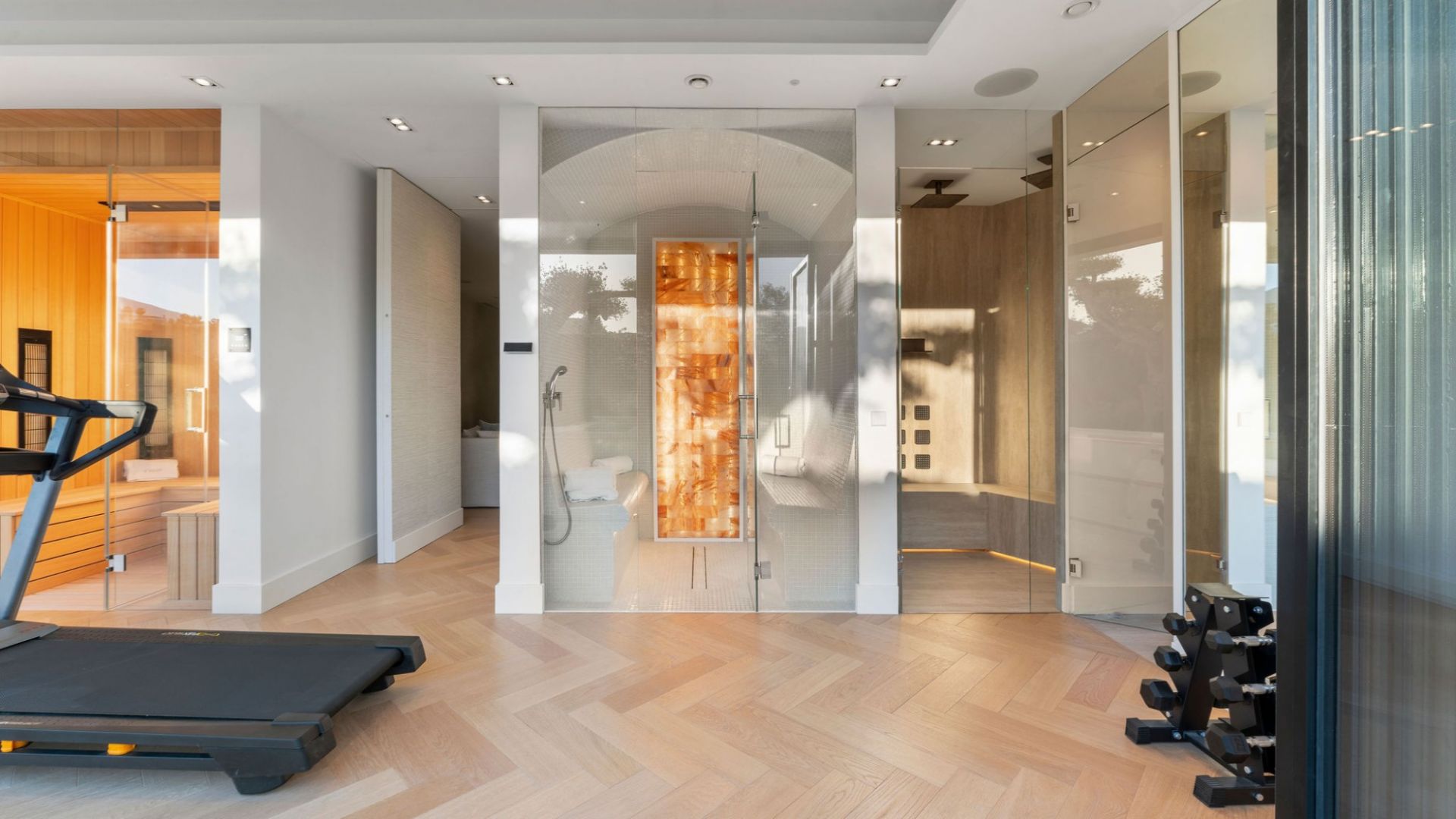 Подвал представляет собой уголок для развлечений и оздоровления с элегантным баром, уютной ТВ-комнатой, сауной с солевой стеной из Гималаев, массажным кабинетом и беговой дорожкой, предоставляя идеальное пространство для отдыха или активного образа жизни.