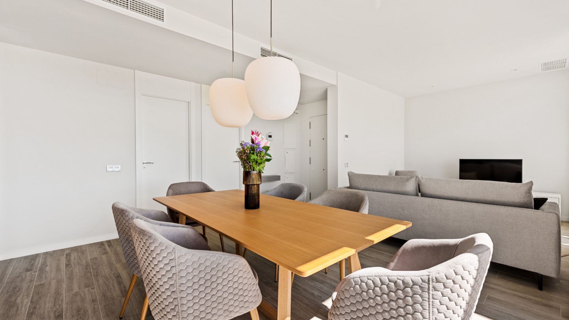 Недвижимость отличается высококачественной отделкой, включая порцелановые плитки, полностью оборудованную кухню с встроенной техникой, встроенные шкафы, видеодомофон, стеклопакеты, жалюзи на окнах, а также собственное парковочное место и складское помещение.