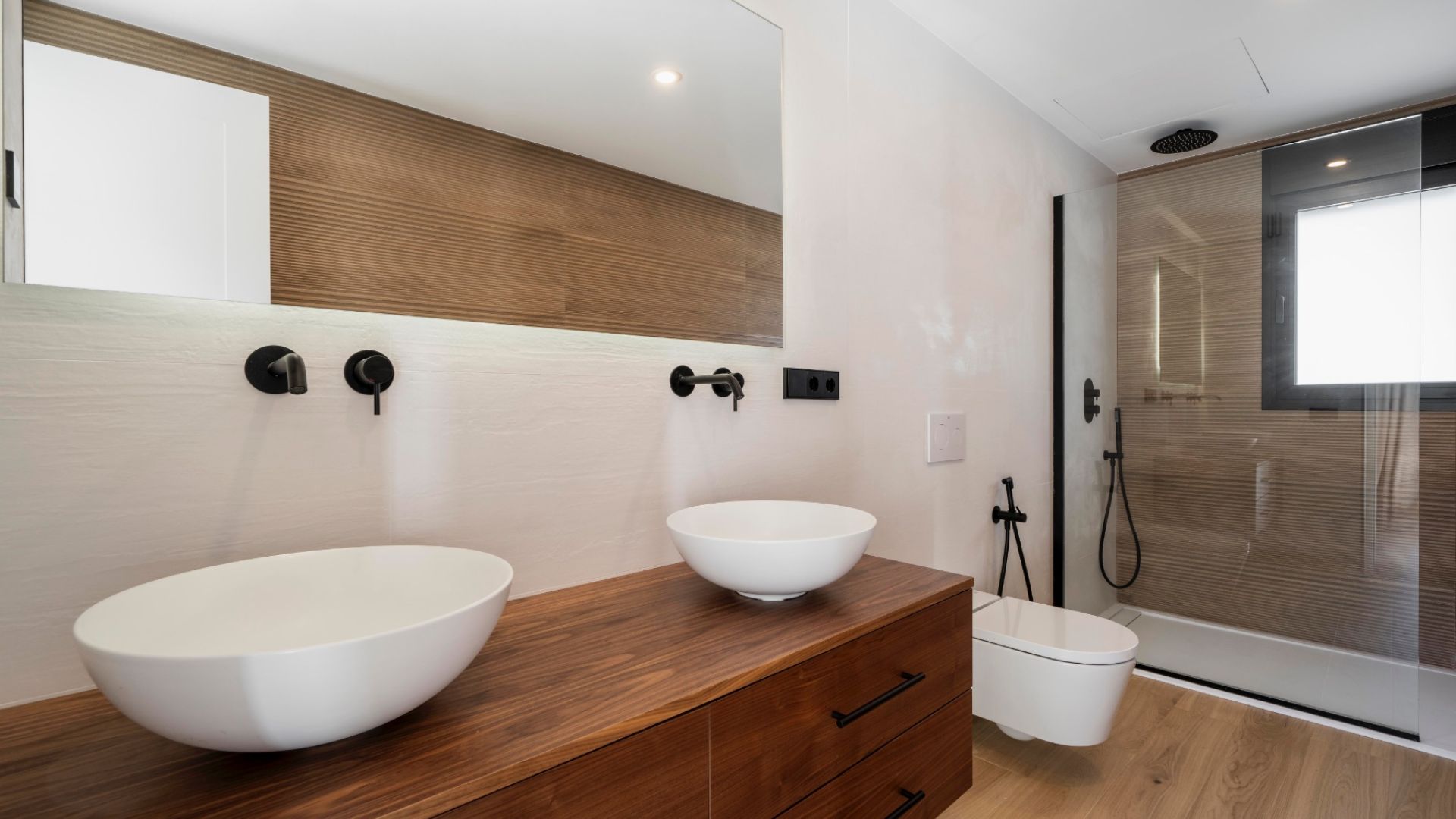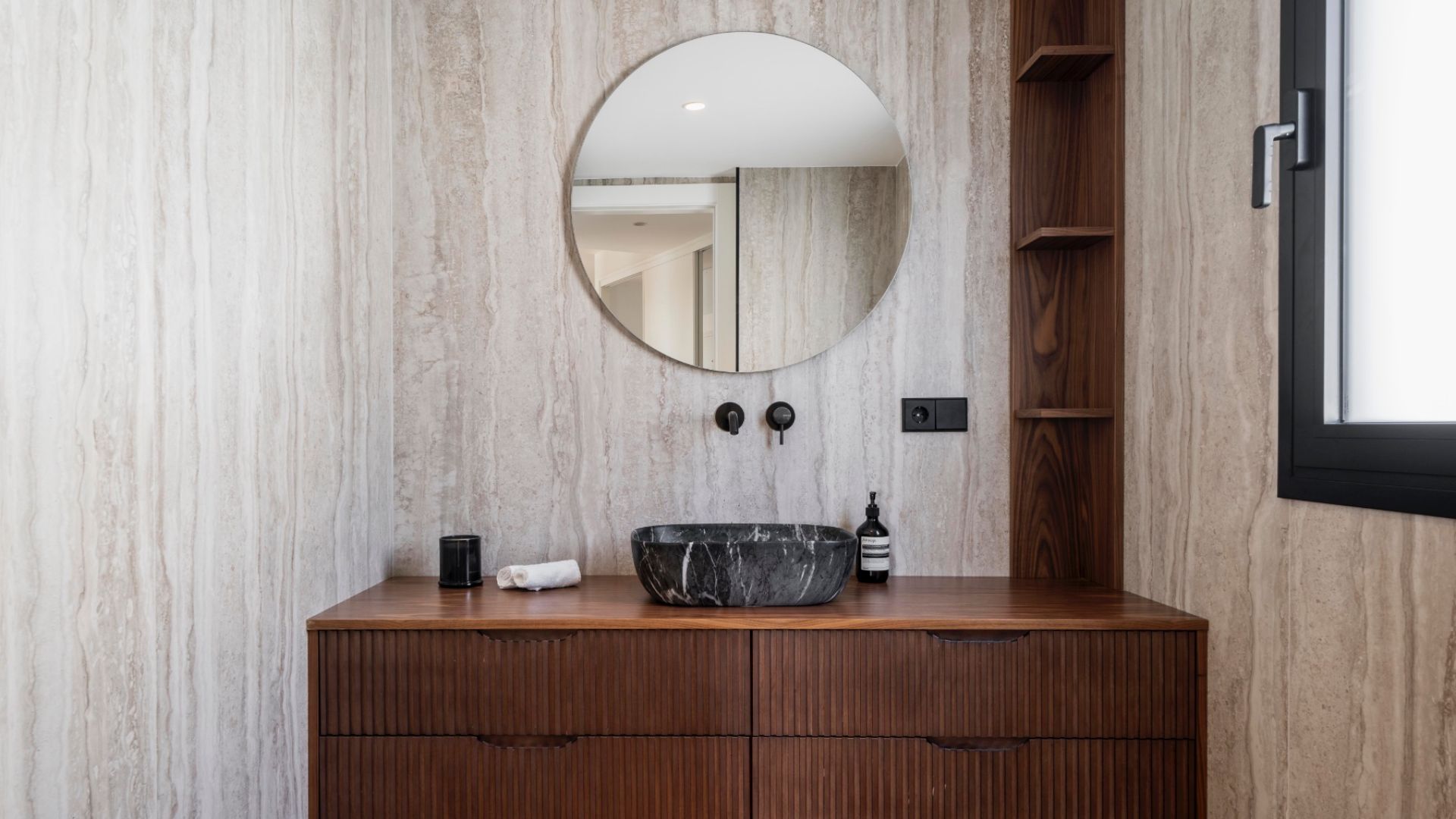 Планировка дома идеально подходит как для уединения, так и для приема гостей. Великолепная входная дверь ведет в центральный холл, справа находится гостевой санузел, а впереди — просторная гостиная. Открытая кухня, оборудованная техникой Gaggenau, плавно переходит в обеденную зону и гостиную, а все пространство окружено окнами от пола до потолка, которые выходят на большую террасу. Внешнее пространство включает кухню, барбекю, лаунж-зону и лестницу, ведущую к бассейну, окруженному солярием и ухоженным садом с авокадо, лимонными и манговыми деревьями.