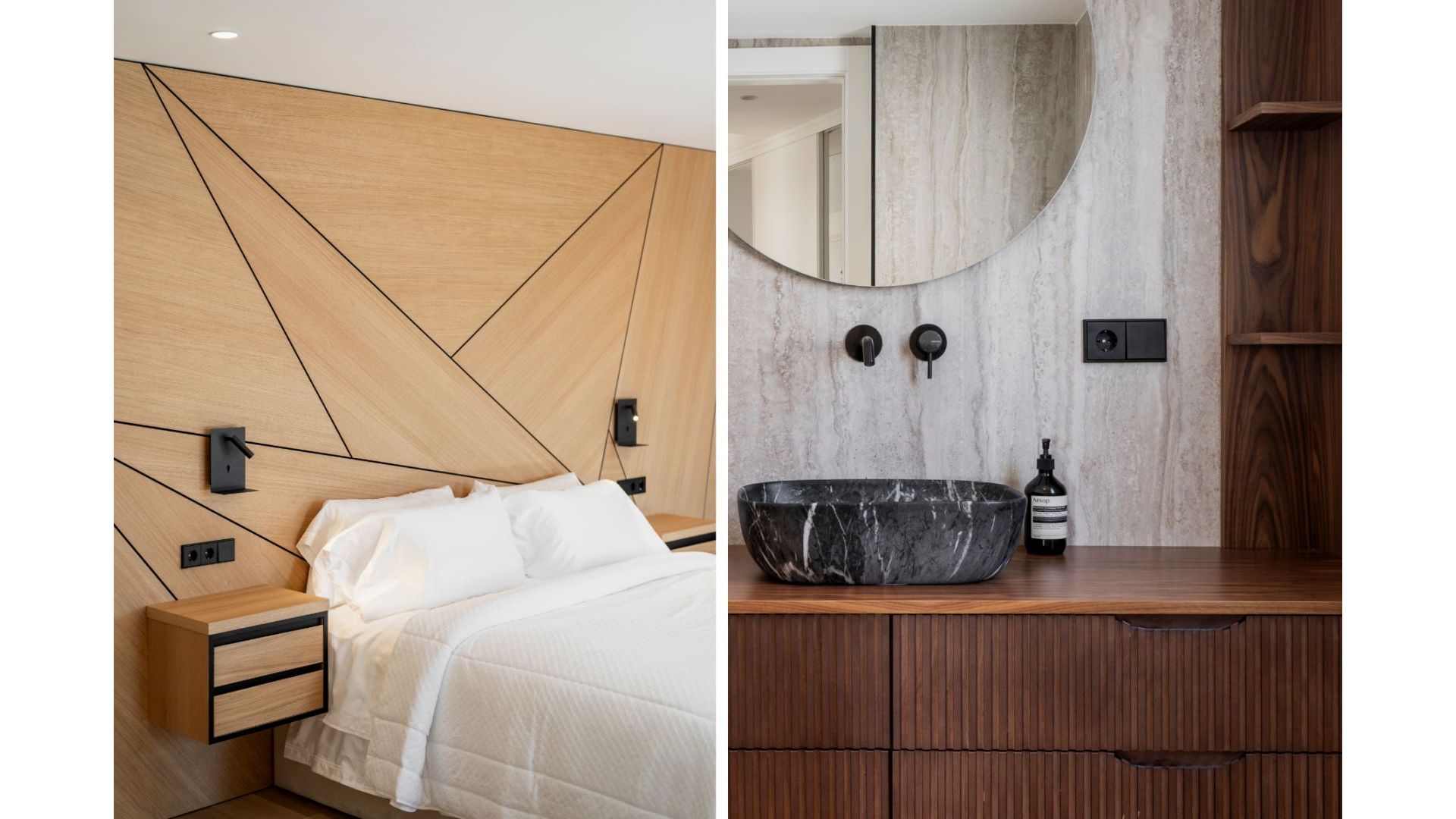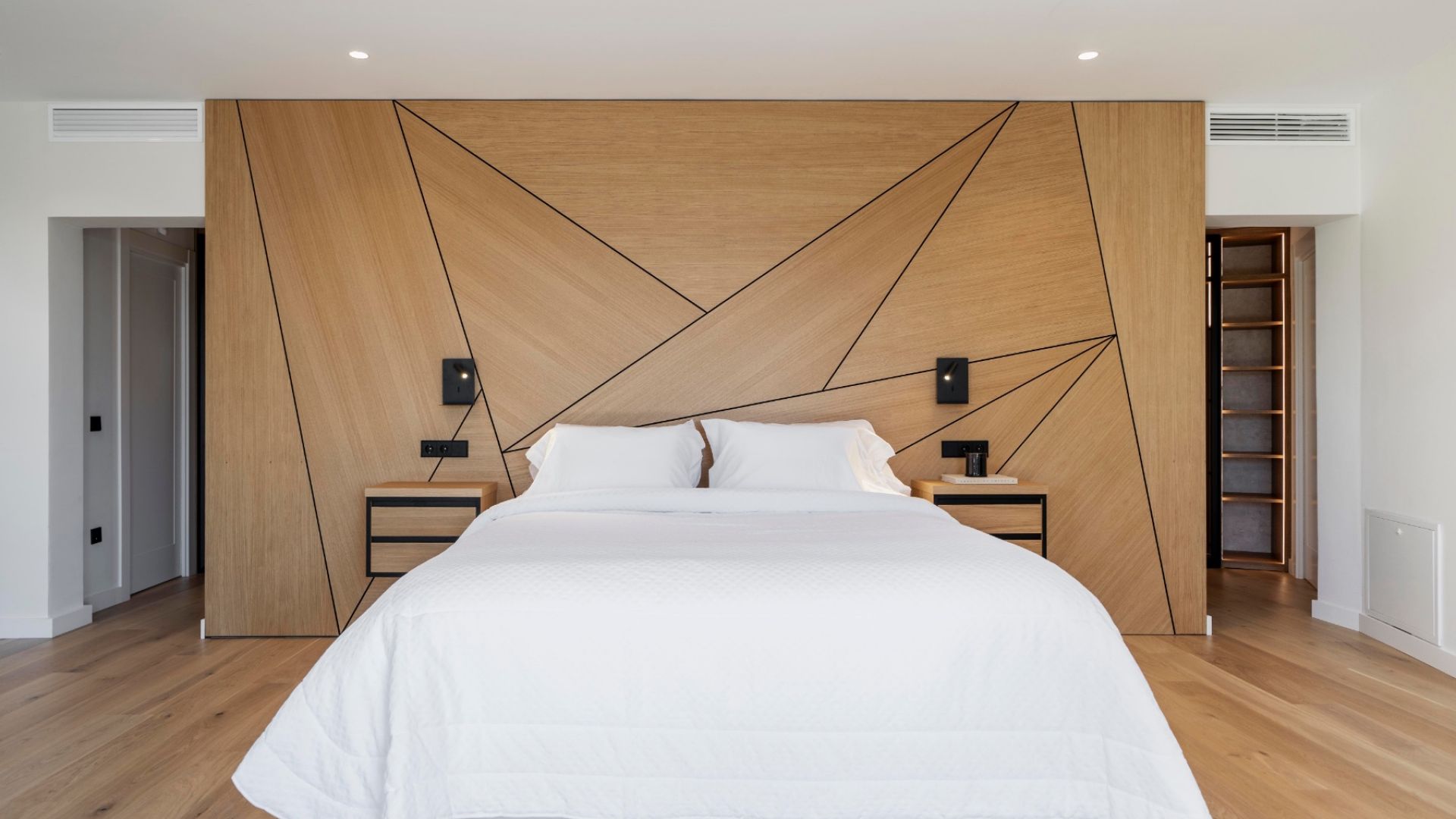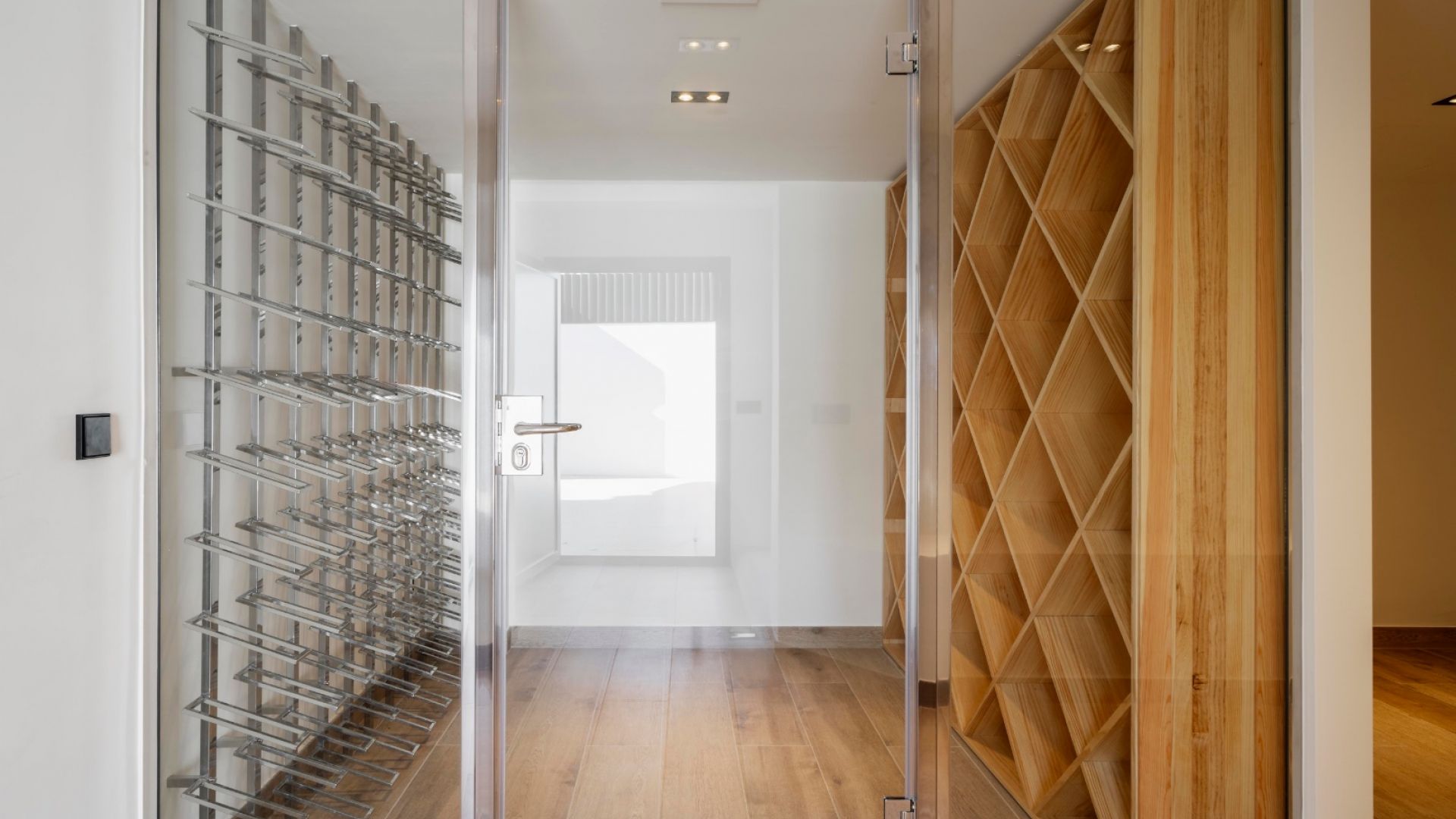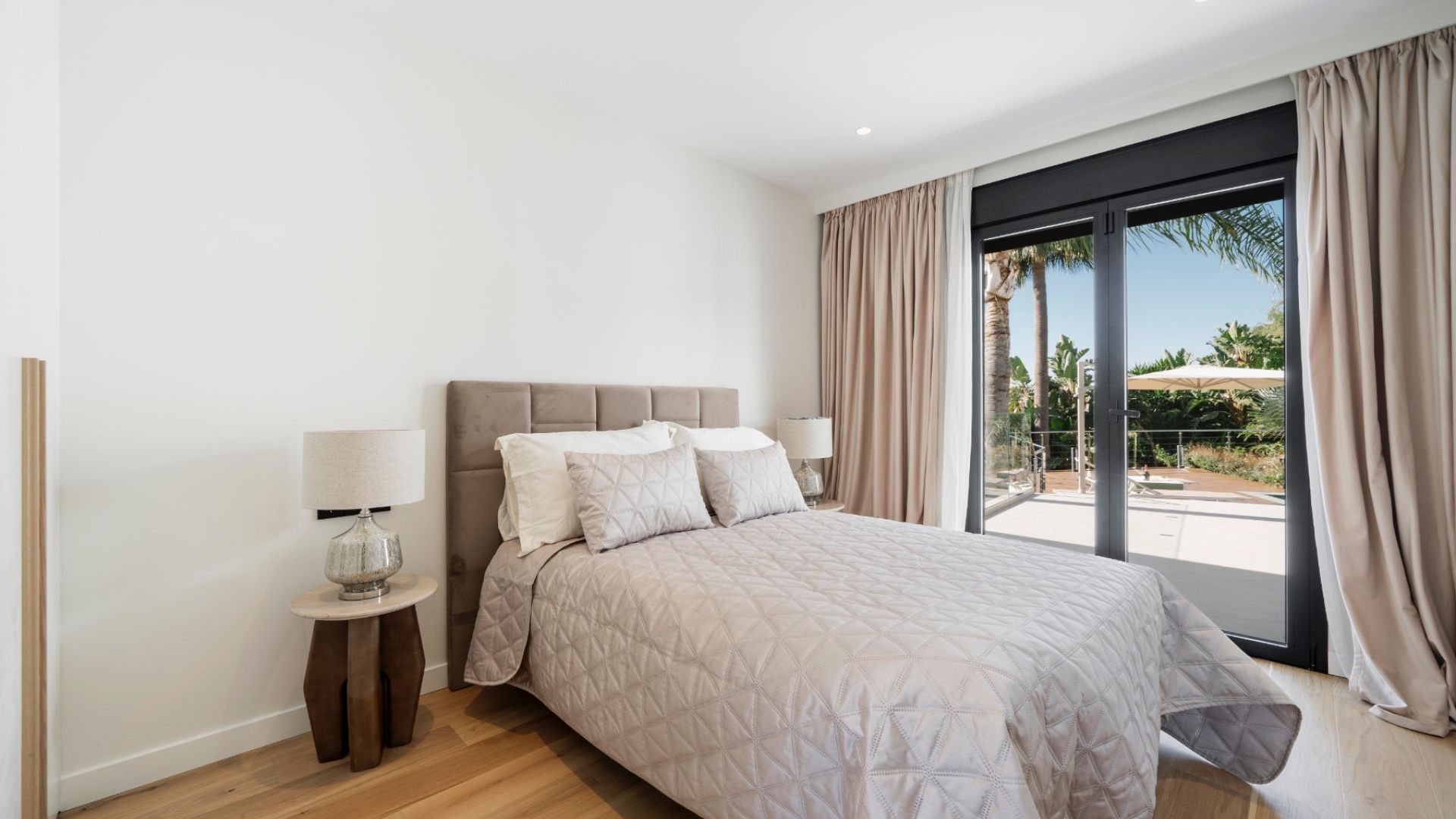 Слева от холла находится коридор, ведущий к трем спальням (одна из которых с ванной комнатой) и общей ванной комнате, все комнаты с видом на сад, бассейн и море. Лестница или лифт ведет на верхний этаж, который полностью посвящен главной спальне с двумя ванными комнатами, гардеробной и частной террасой с видом на Средиземное море.