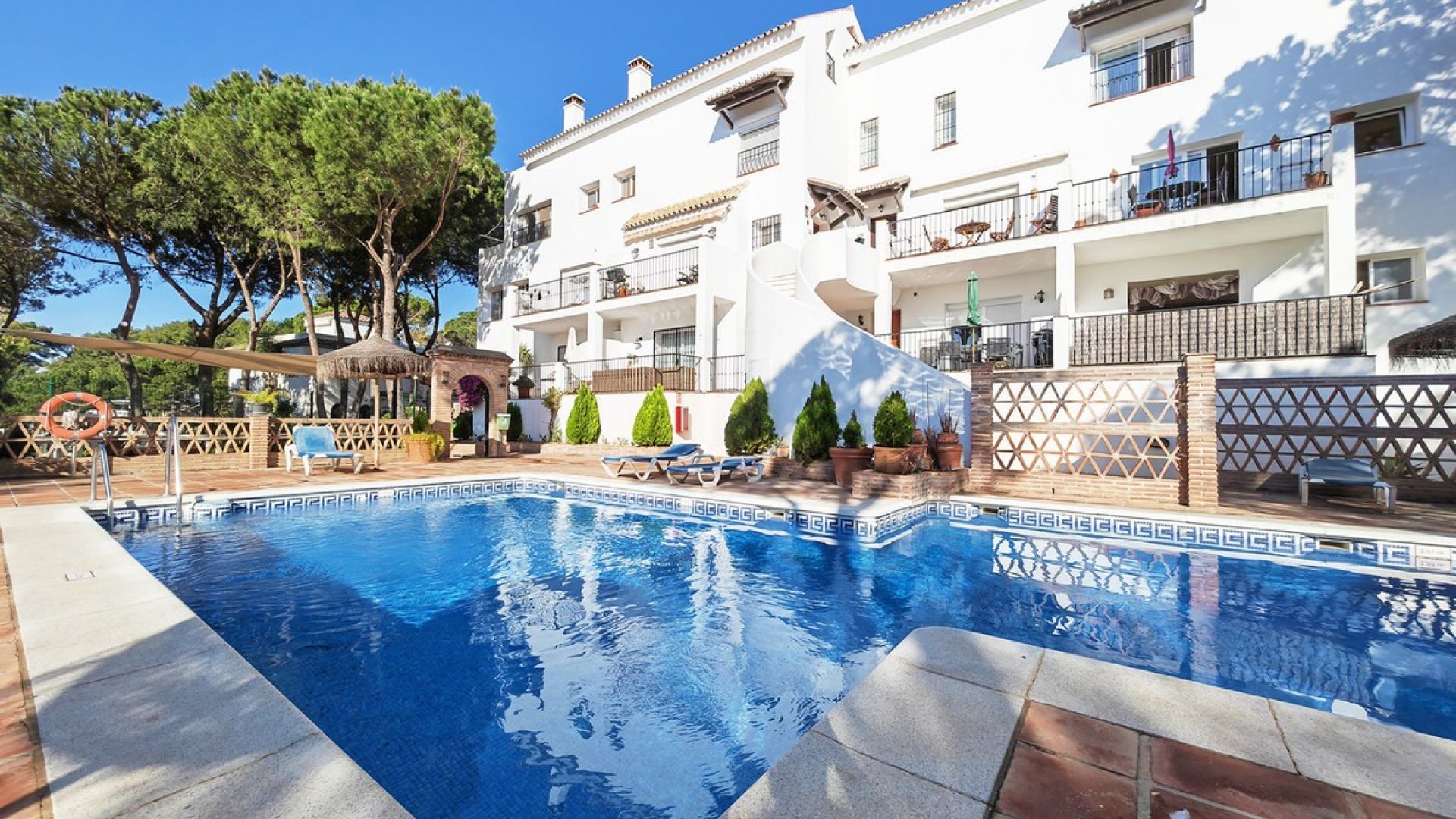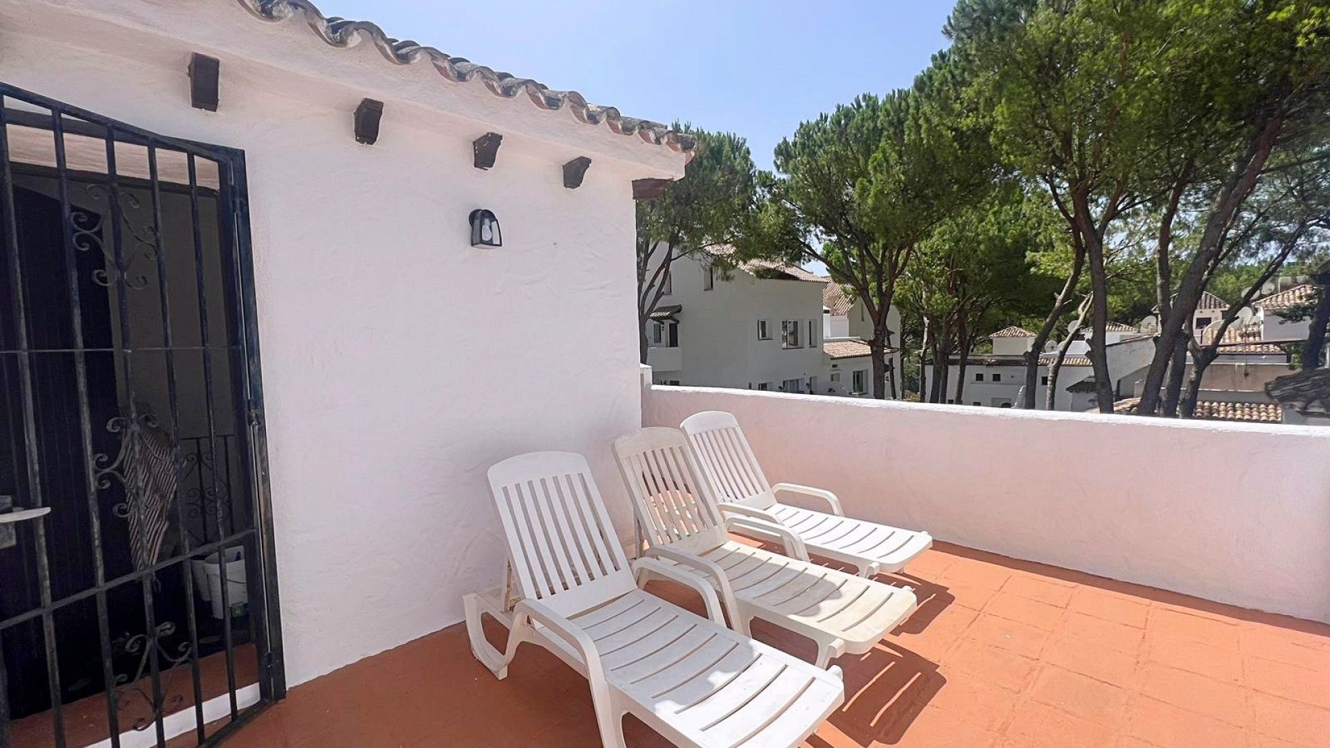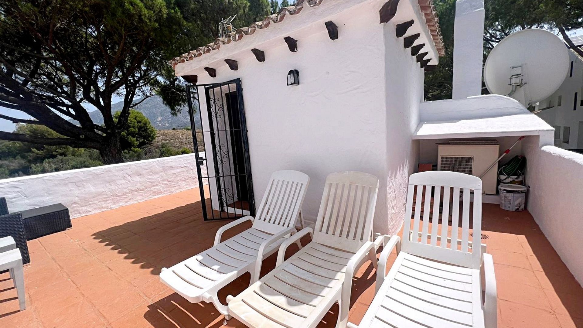 Denna 2-rumslägenhet ligger i en triplexlägenhet i bostadsområdet Los Pinos de Aloha i Nueva Andalucía. Lägenheten har på bottenvåningen ett utrustat och självständigt kök, ett rymligt vardagsrum med tillgång till en mysig terrass med utsikt över La Concha-berget. På andra våningen finns 2 sovrum med egna badrum, varav ett är huvudsviten med privat terrass. Översta våningen består av ett solarium med solstolar och en loungedel med 360 graders utsikt över bergen och urbaniseringen. Detta bostadsområde har en gemensam pool och en parkeringsplats inom urbaniseringen. Dessutom inkluderar lägenheten: