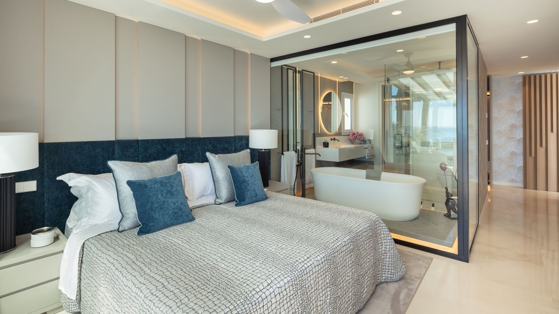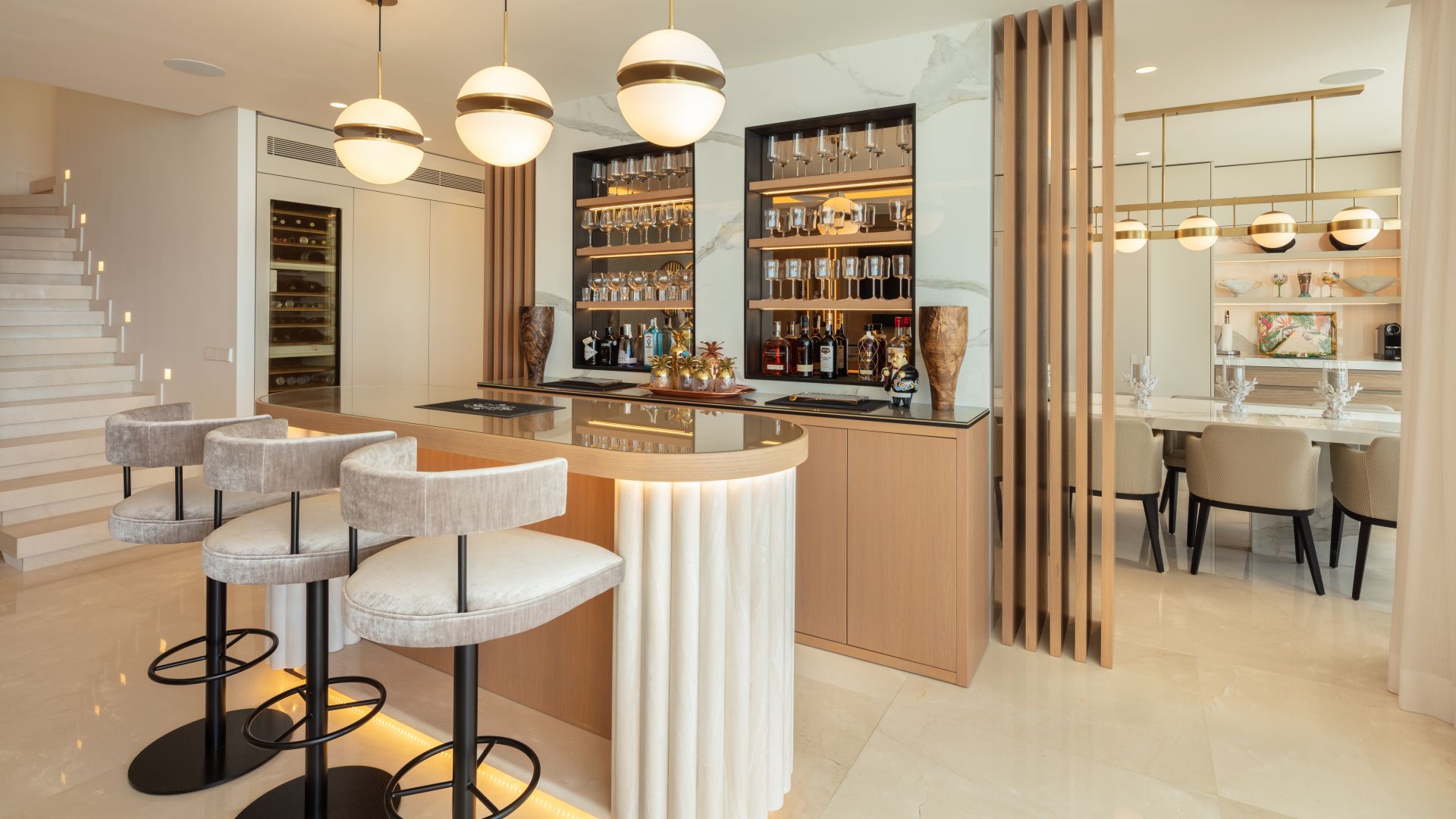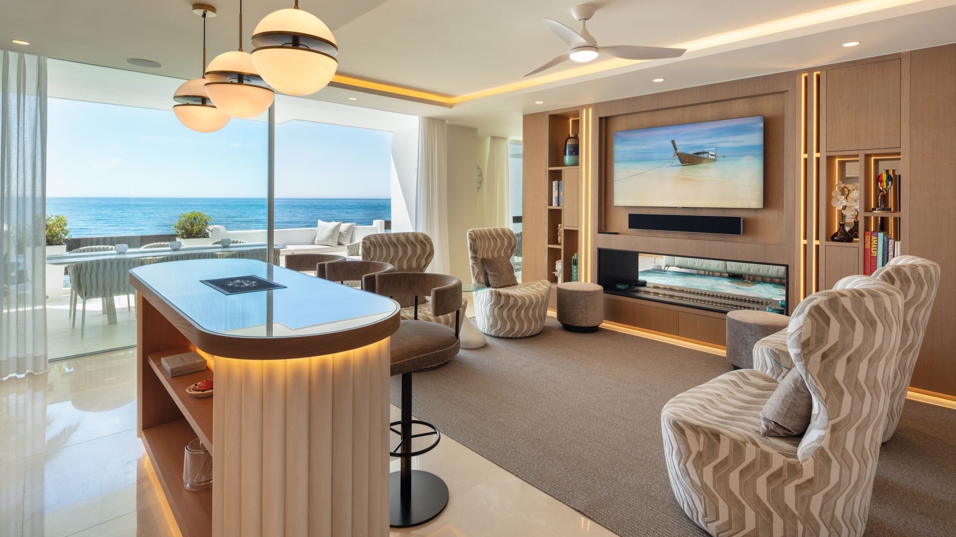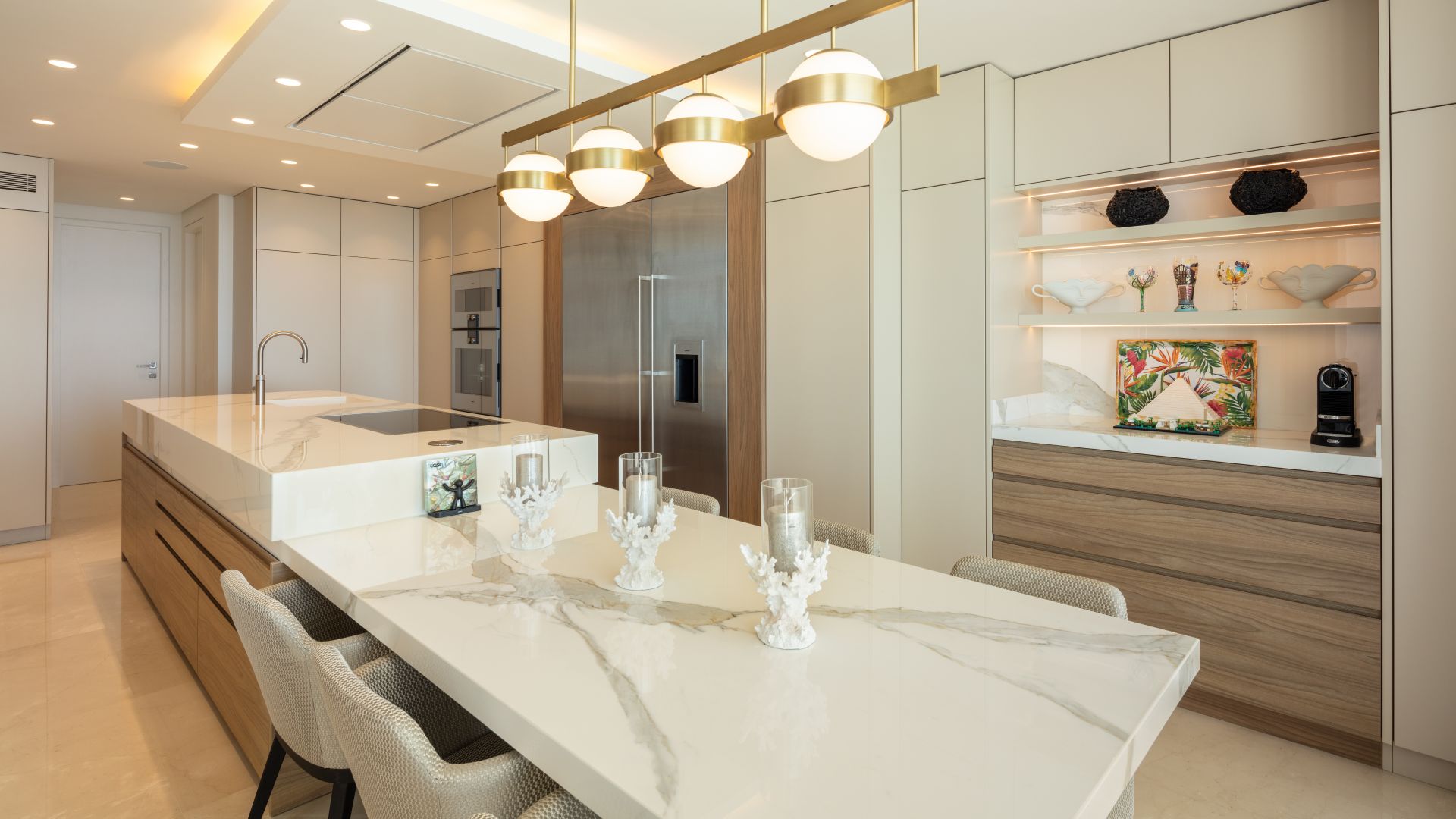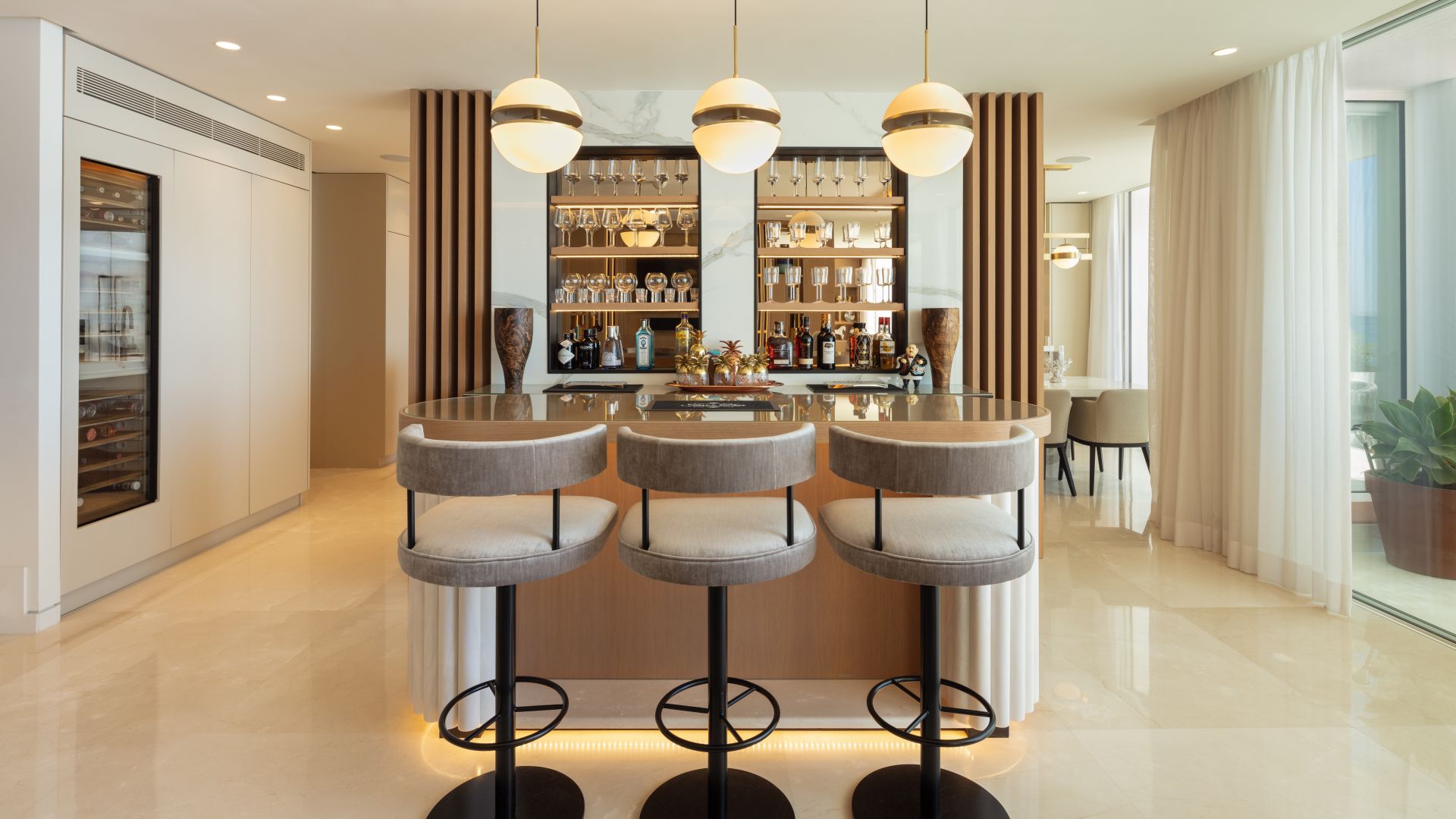 Med stor omsorg för detaljer i designen har bostaden sex eleganta sovrum med egna badrum. Det toppmoderna köket, utrustat med högkvalitativa Gaggenau-apparater, är en dröm för matlagningsentusiaster, medan matplatsen erbjuder oförglömlig havsutsikt för en minnesvärd måltidsupplevelse.