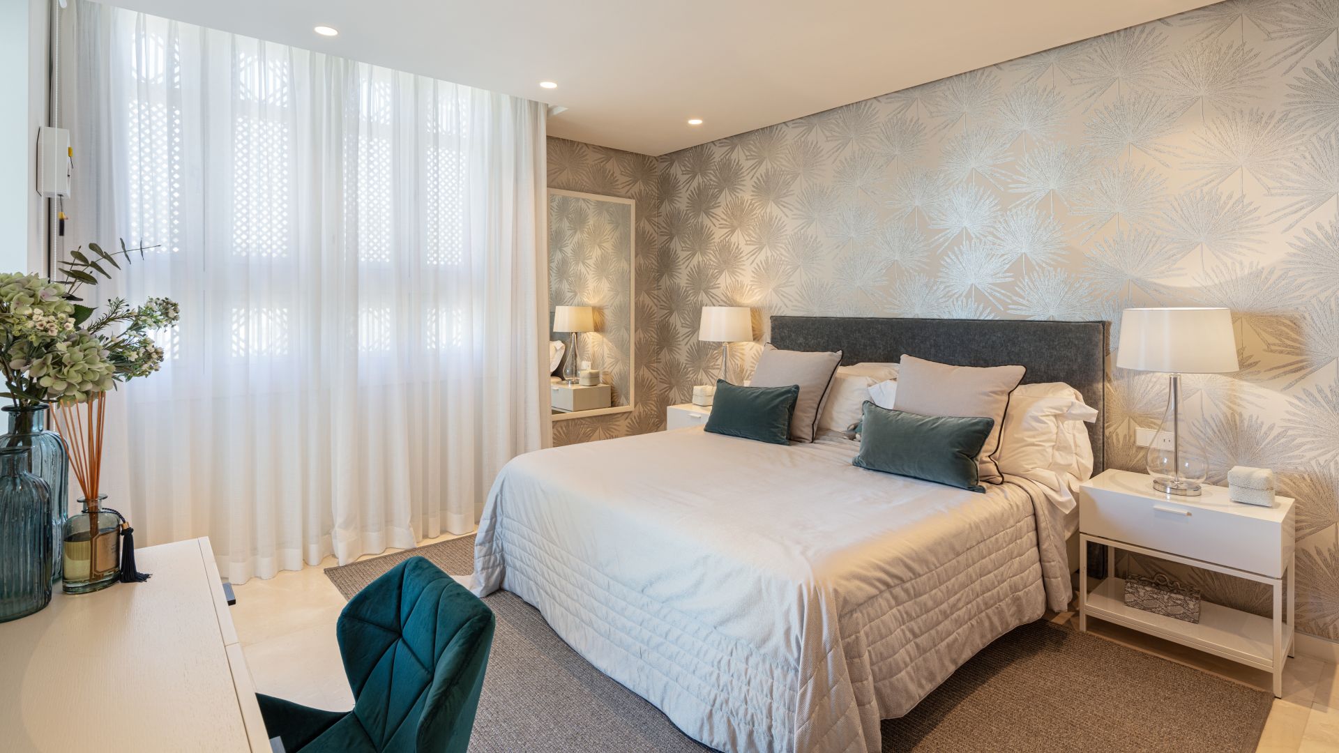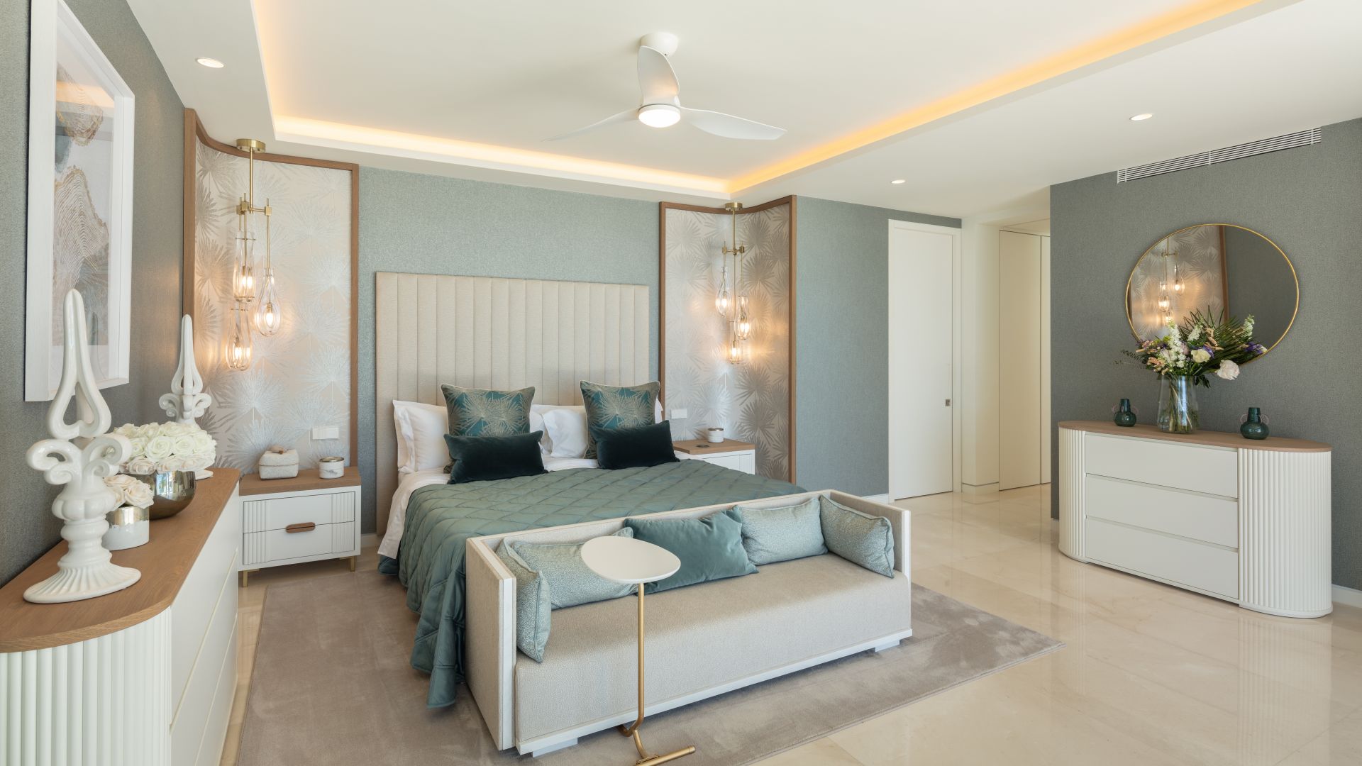 På huvudvåningen finns fyra rymliga sovrum med egna badrum och vacker utsikt över havet eller bergen, vilket skapar en känsla av lugn och naturskönhet. En privat hiss eller trappa leder till den lyxiga mastersviten, komplett med separata klädkammare och badrum för honom och henne, och erbjuder en fridfull tillflyktsort med panoramautsikt över Medelhavet.