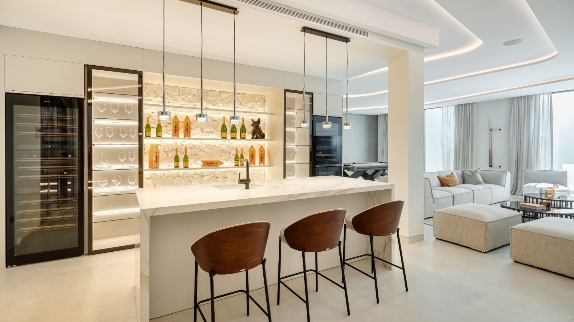 Källaren erbjuder ett fullt utrustat techno-gym, bastu, ångbastu och ett andra vardagsrum med naturligt ljus, vilket skapar en idealisk plats för avkoppling och underhållning. Detta område inkluderar också en bar med en stenvägg som bakgrund, ett hemmabio och ytterligare sovrum, vilket gör det till en mångsidig plats för olika aktiviteter.