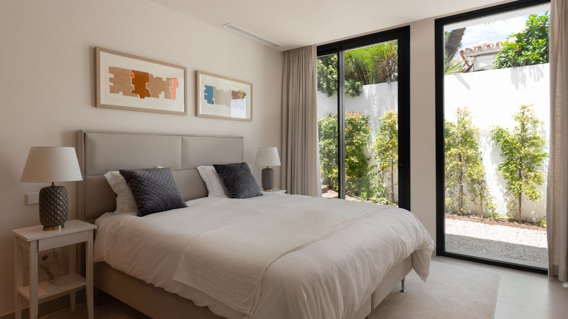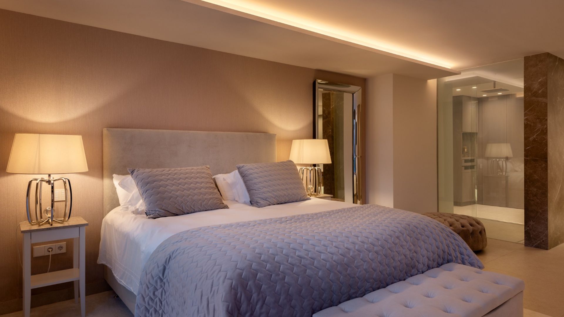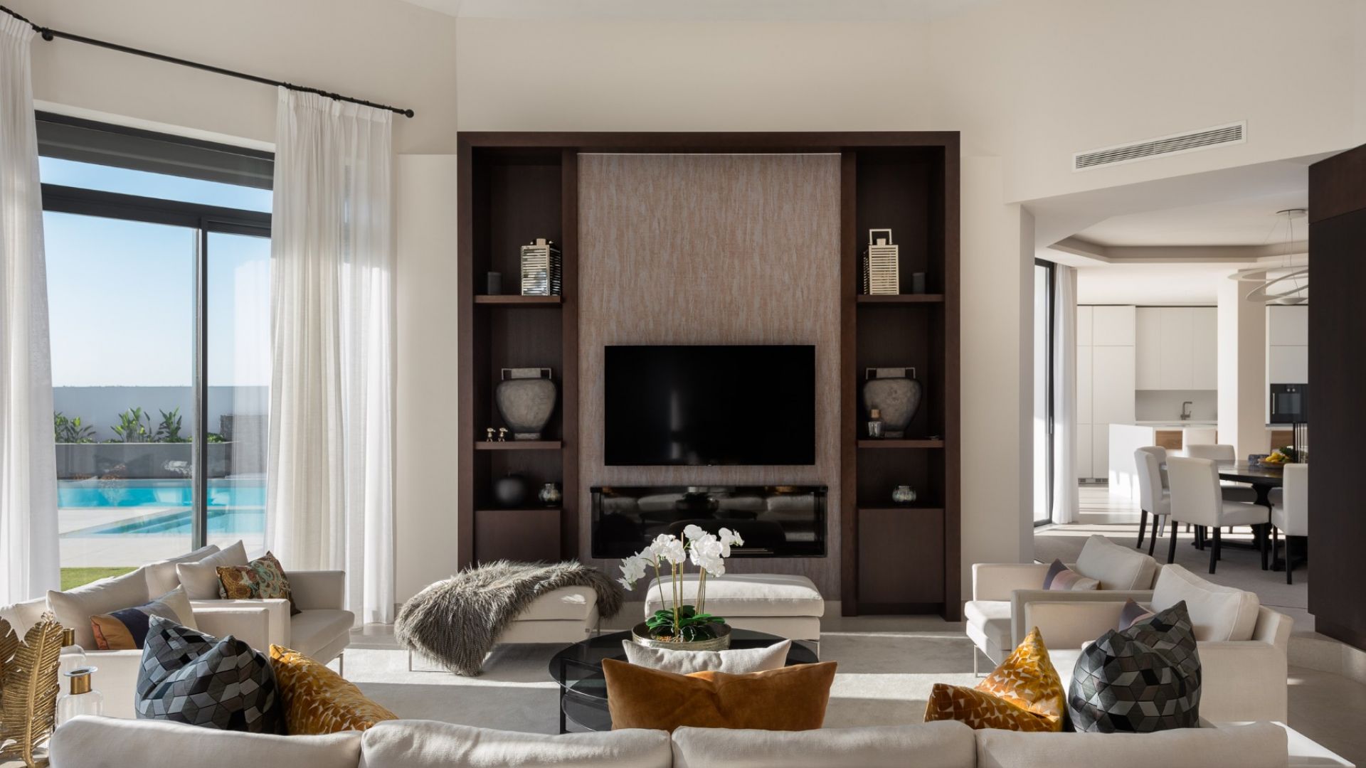 Villan har 5 rymliga sovrum, inklusive en master suite med ett lyxigt badrum, samt en separat gäst- eller personal svit. Det öppna vardagsrummet fylls med naturligt ljus tack vare golv-till-tak fönster som erbjuder imponerande utsikt. Det moderna köket är utrustat med Gaggenau-apparater, och takterrassen har en BBQ-område, matplats och ett bubbelbad.