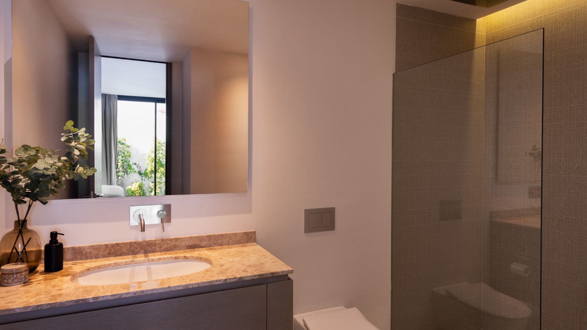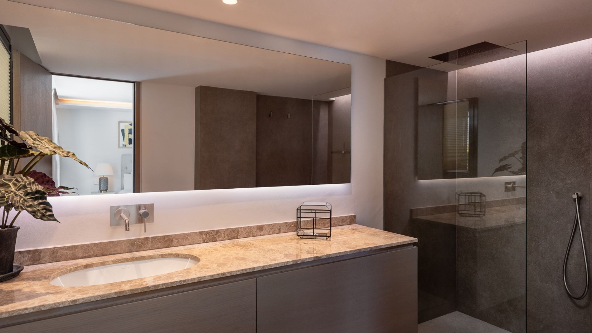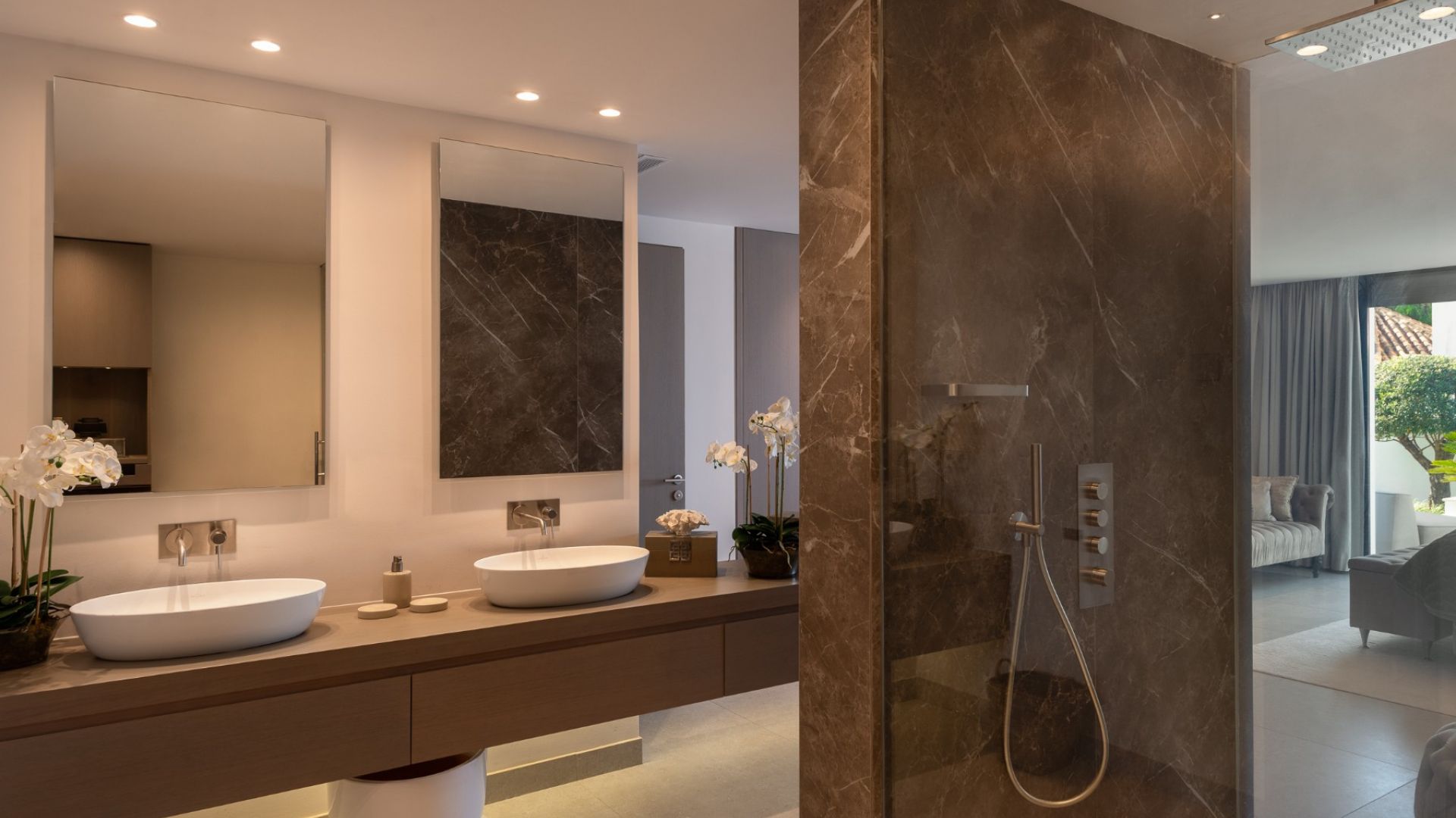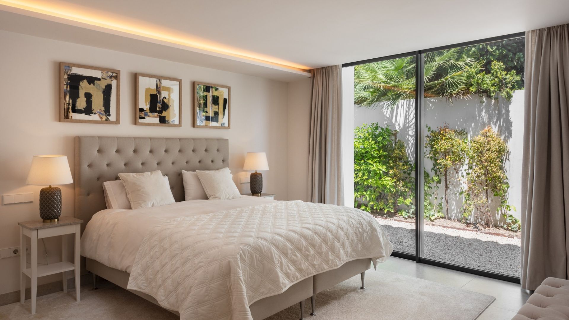 Villan har 5 rymliga sovrum, inklusive en master suite med ett lyxigt badrum, samt en separat gäst- eller personal svit. Det öppna vardagsrummet fylls med naturligt ljus tack vare golv-till-tak fönster som erbjuder imponerande utsikt. Det moderna köket är utrustat med Gaggenau-apparater, och takterrassen har en BBQ-område, matplats och ett bubbelbad.