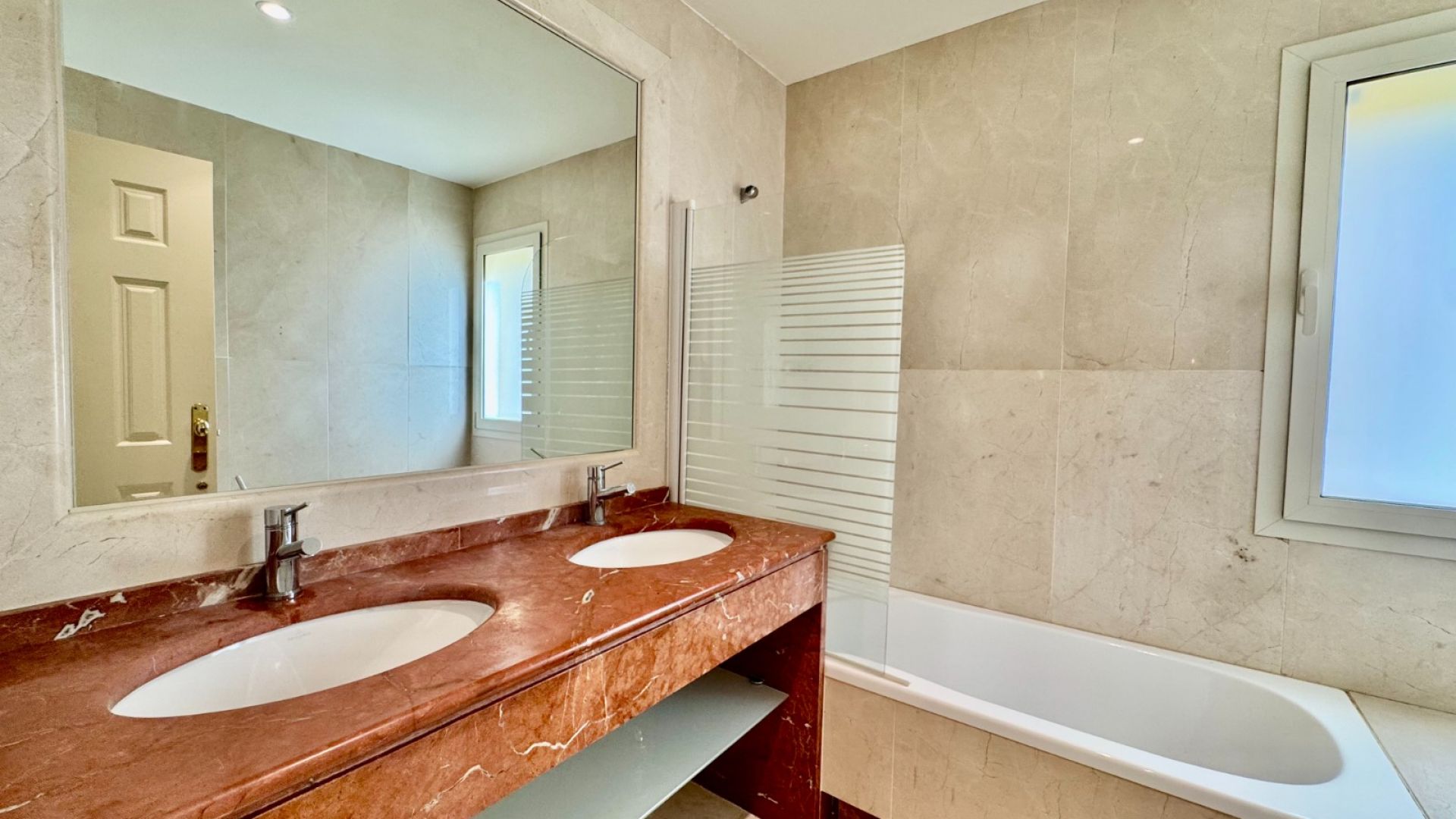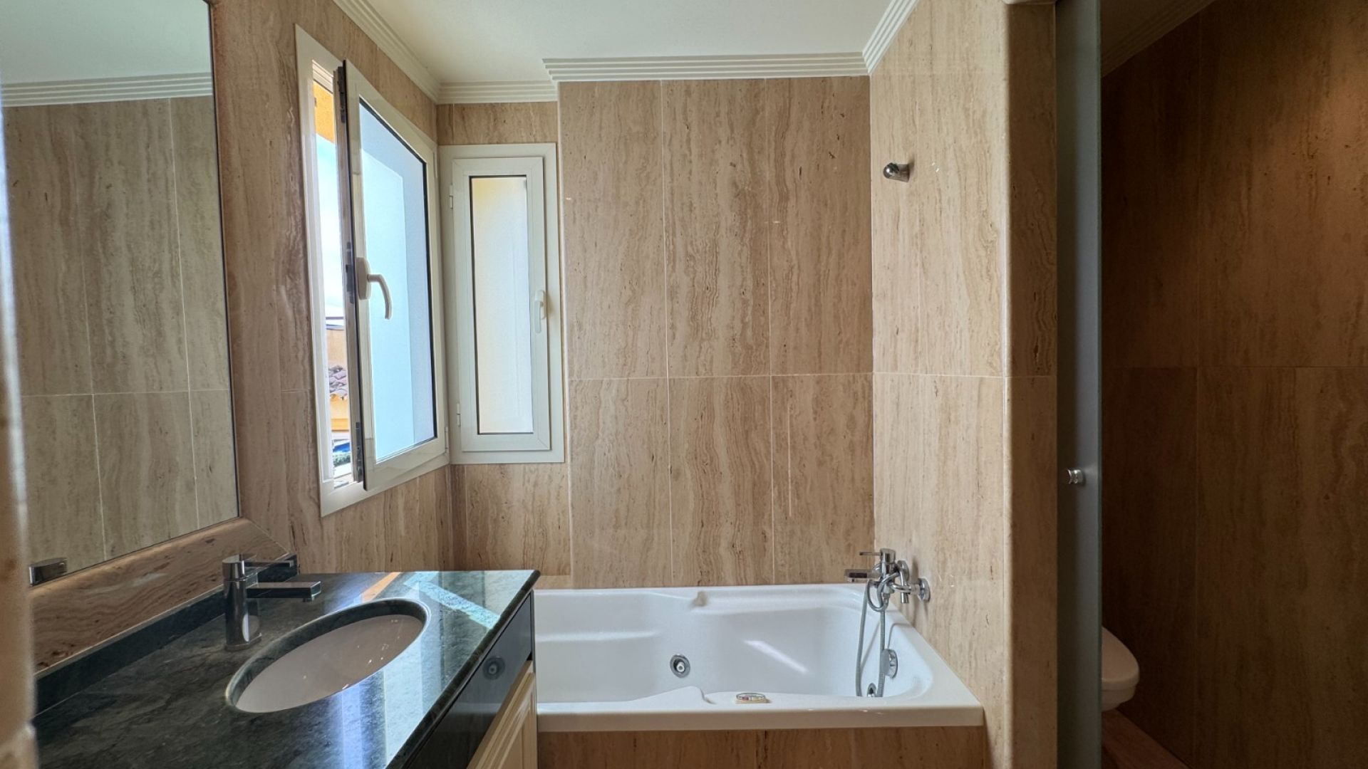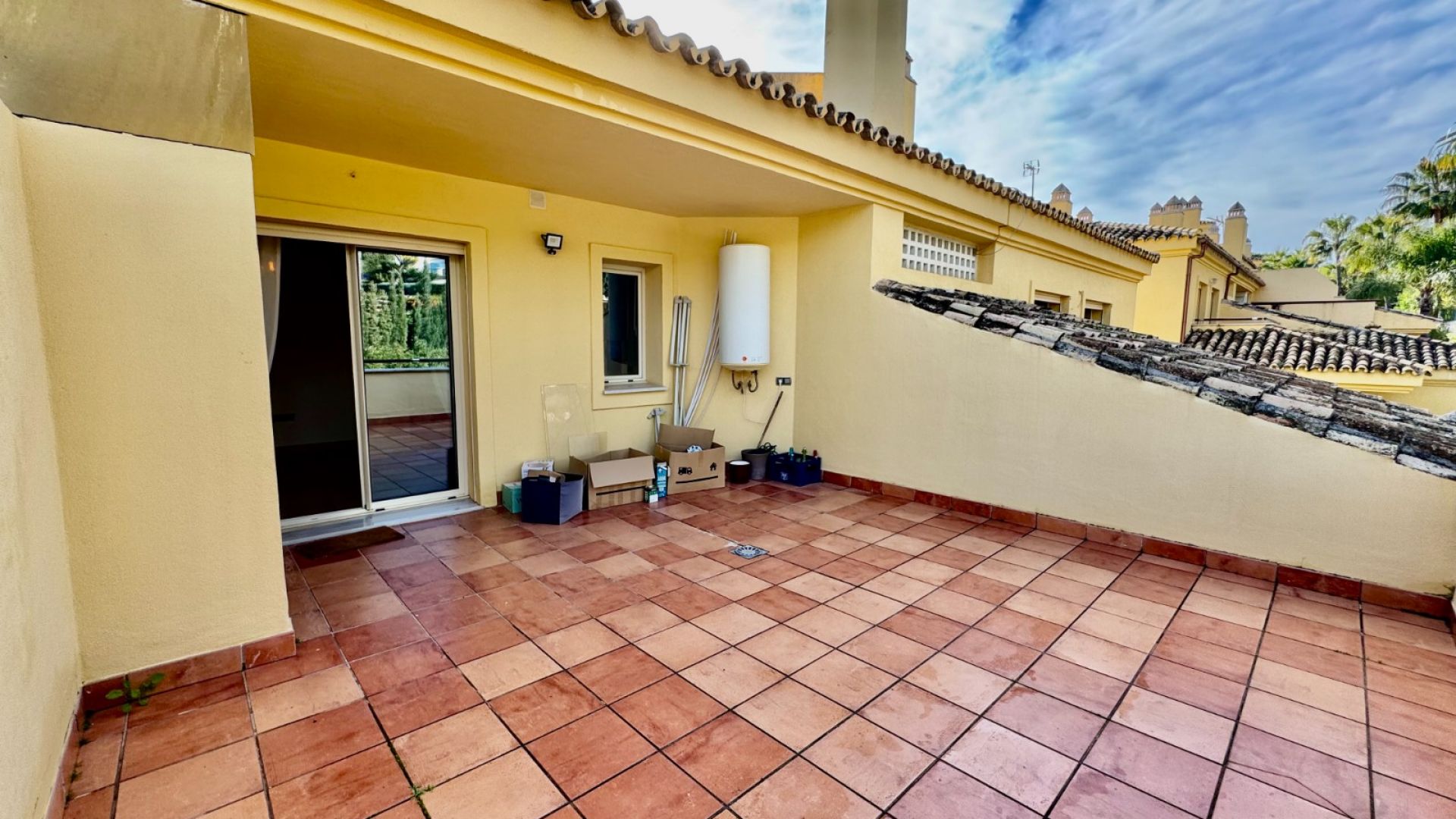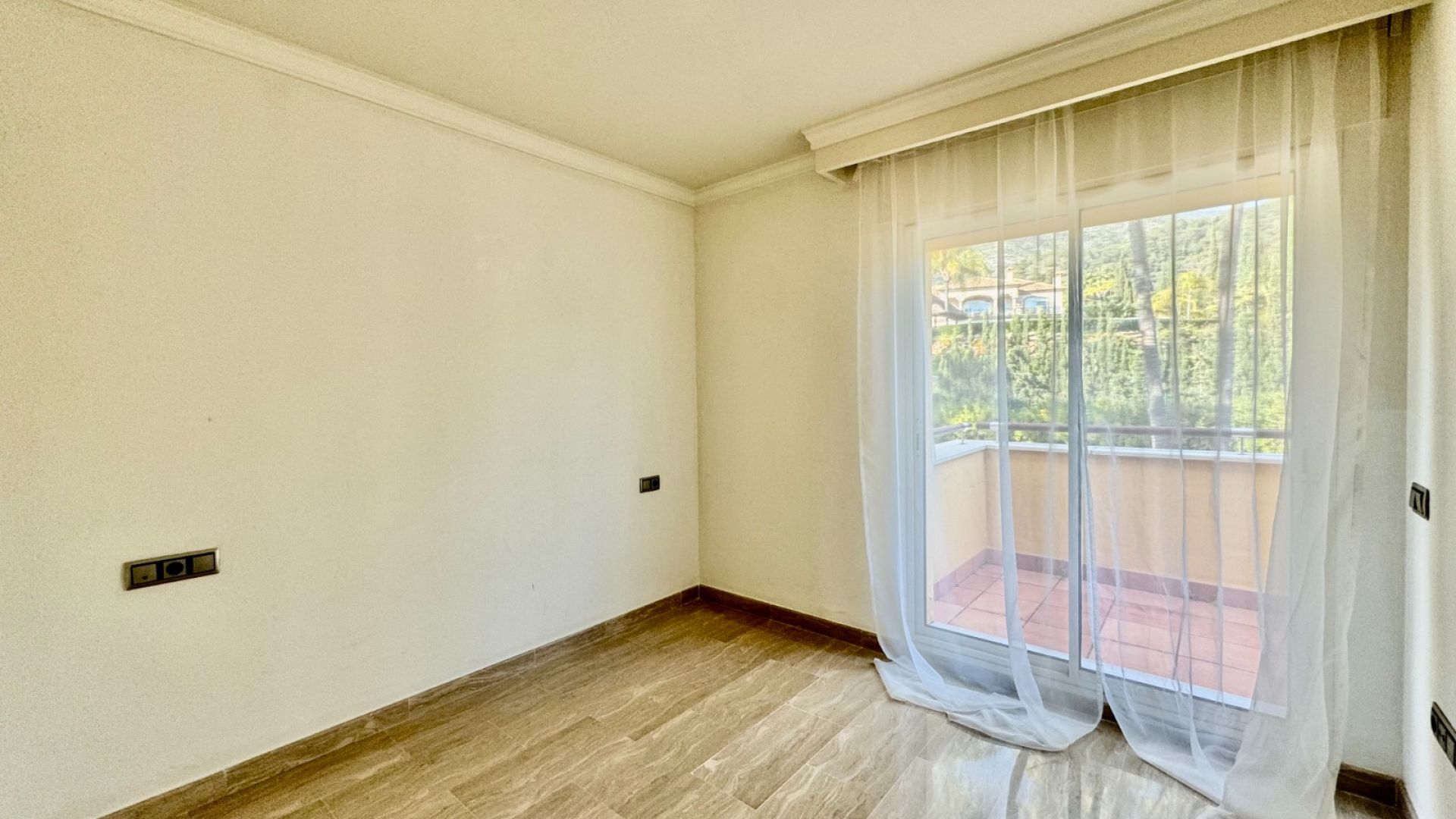 Takvåningen har två rymliga dubbelrum med inbyggda garderober som delar ett badrum samt ett lyxigt master bedroom med eget badrum, utrustat med både ett badkar och en stor dusch. Från master bedroom finns direkt tillgång till en generös terrass med jacuzzi och enastående panoramautsikt över kusten.