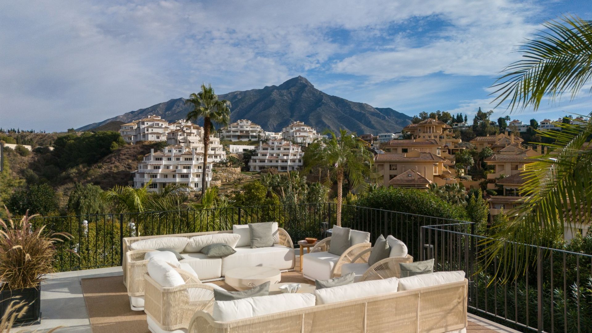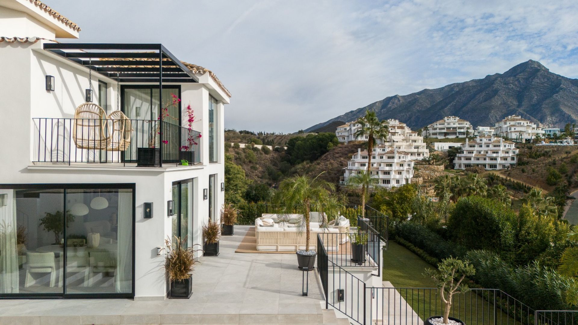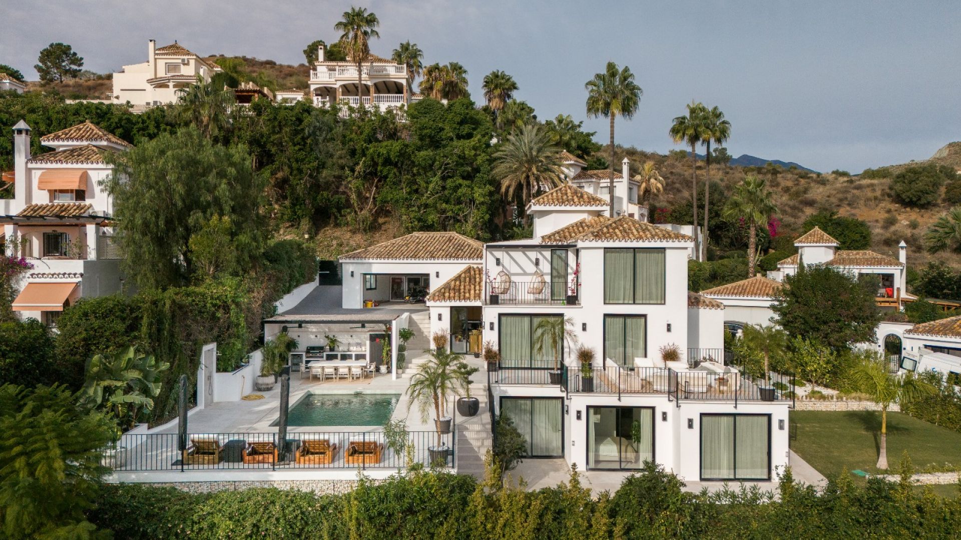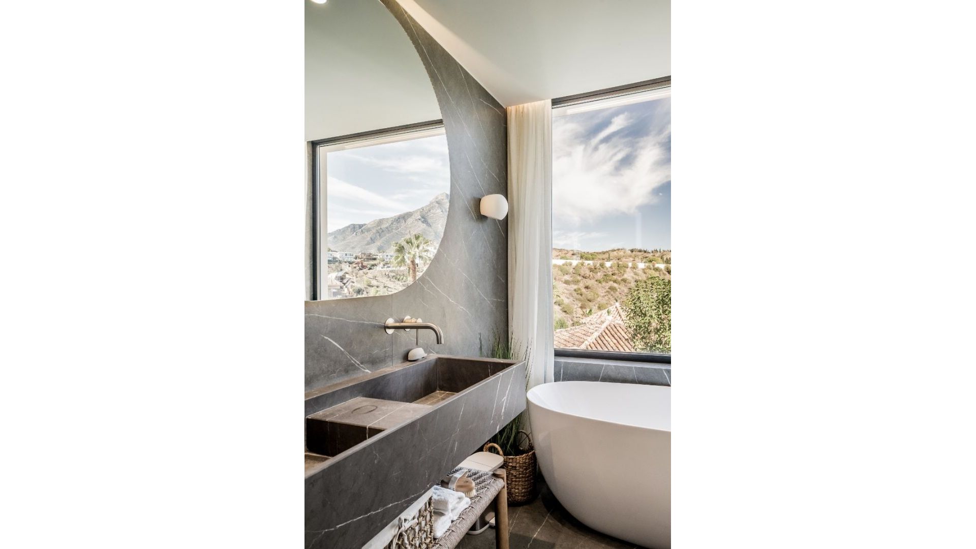 Färdigställd 2023, ligger denna moderna villa i den prestigefyllda Golf Valley i Nueva Andalucía. Med slående modern arkitektur och traditionella andalusiska inslag, erbjuder den spektakulära vyer över La Concha-berget, golfbanan och havet. Den öppna planlösningen har en Boho chic vardagsrum och matsal, ett fullt utrustat kök och stora fönster som flödar med naturligt ljus. Villan inkluderar ett biosalong, vinkällare och en fullt möblerad gästrätt.