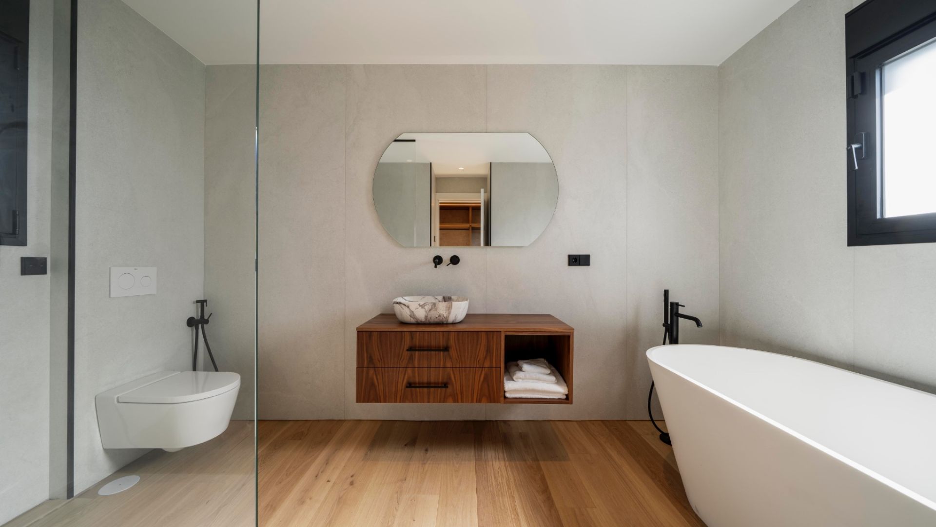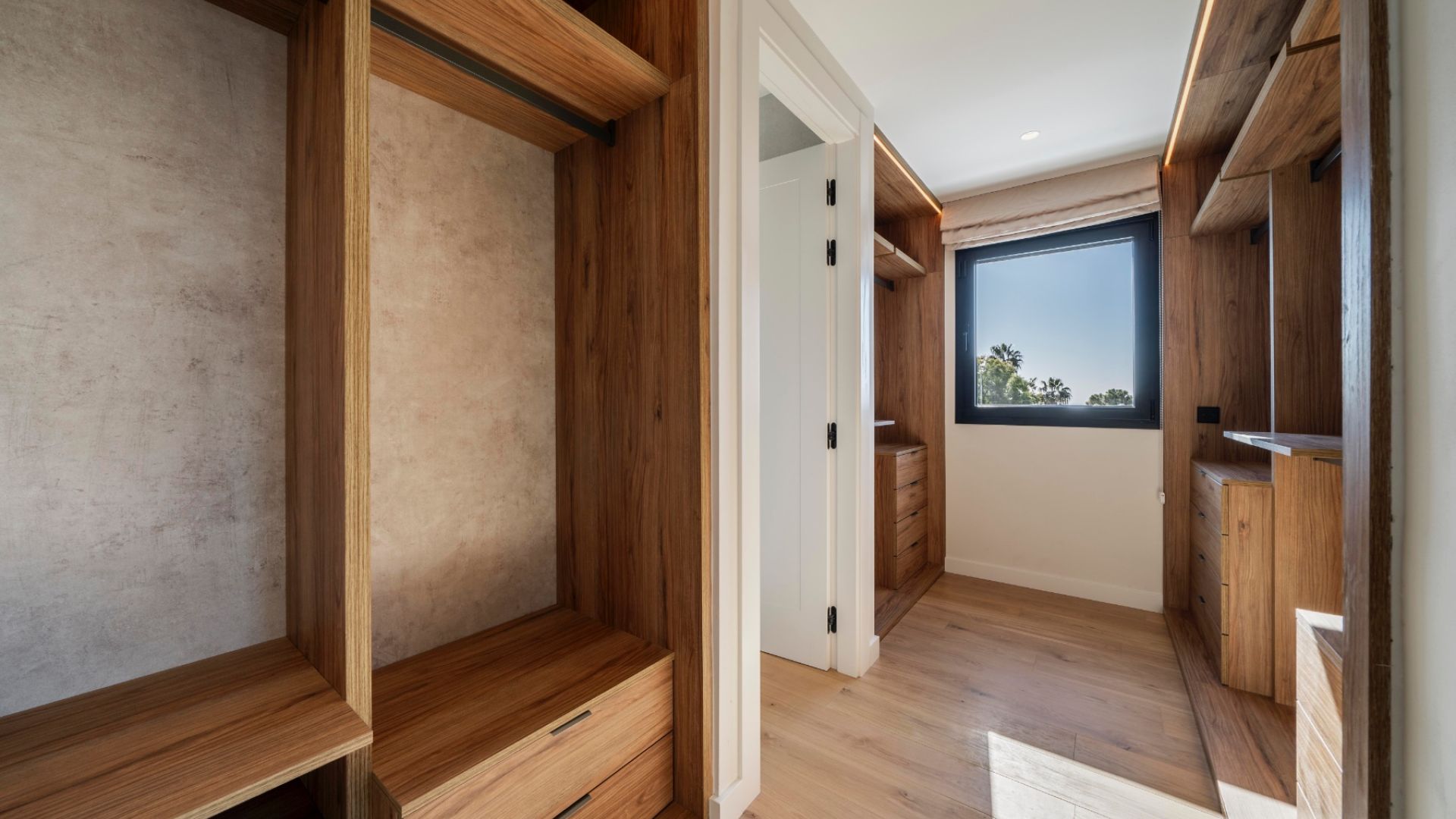 Till vänster i hallen finns en dörr som leder till en ljus korridor som leder till tre sovrum (ett en suite) och ett fullständigt badrum, alla med utsikt över trädgården, poolen och havet. En trappa eller hiss leder upp till övervåningen, som är helt dedikerad till master-sviten, inklusive två badrum, en walk-in closet och en privat terrass med utsikt över Medelhavet.