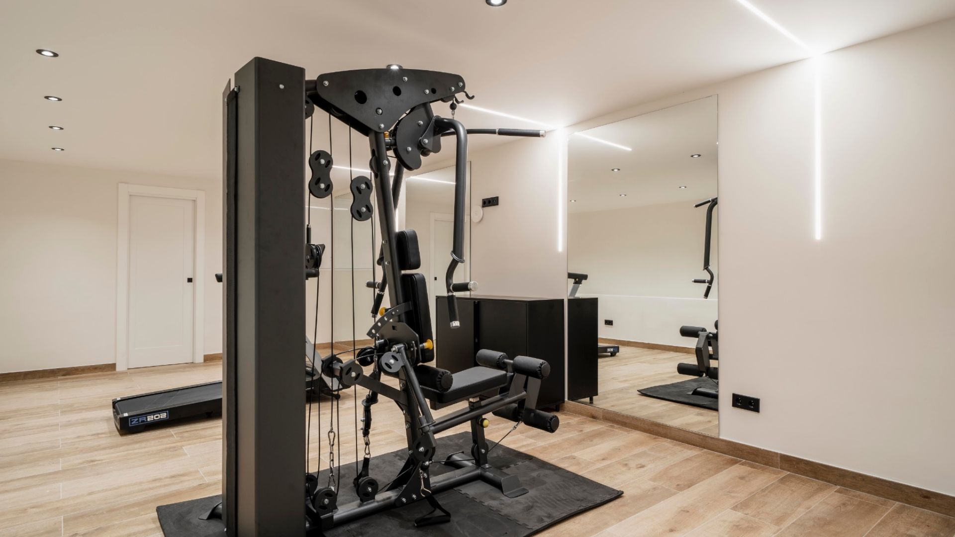 Under poolområdet finns en separat lägenhet med ett sovrum, badrum och pentry, idealisk för gäster eller personal. Fastigheten inkluderar också ett täckt garage, plats för tre ytterligare bilar och ett separat utrymme med vinförråd, gym och badrum.