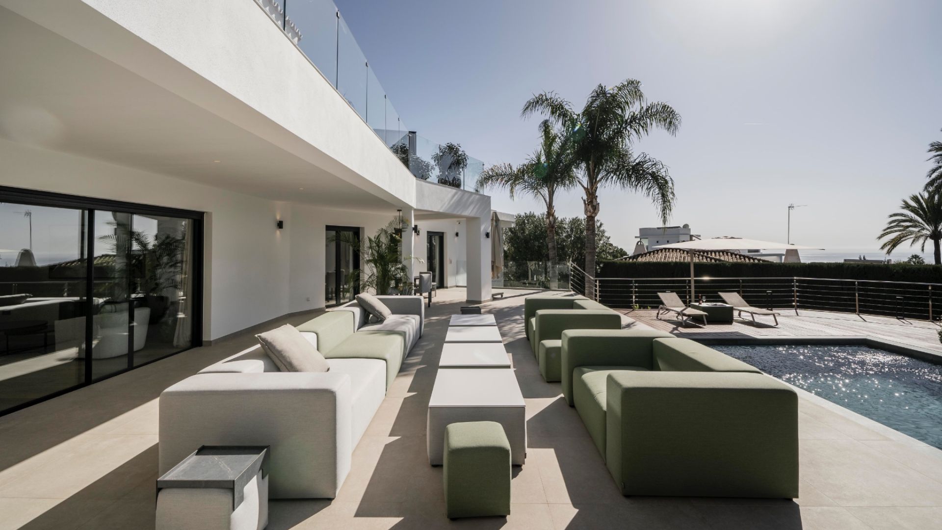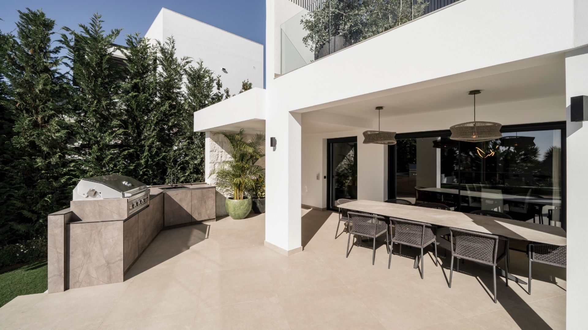 Planlösningen är perfekt både för privatliv och underhållning. Den stora entrédörren leder till en rymlig hall, med ett gästrum till höger och ett stort vardagsrum rakt fram. Det öppna köket, utrustat med Gaggenau-apparater, flödar in i matplatsen och vardagsrummet, allt inramat av golv-till-tak fönster som leder till en stor terrass. Uteområdet inkluderar ett kök, grill, lounge och trappa som leder ner till poolen, omgiven av solarium och en vackert anlagd trädgård med avokado-, citron- och mangoträd.
