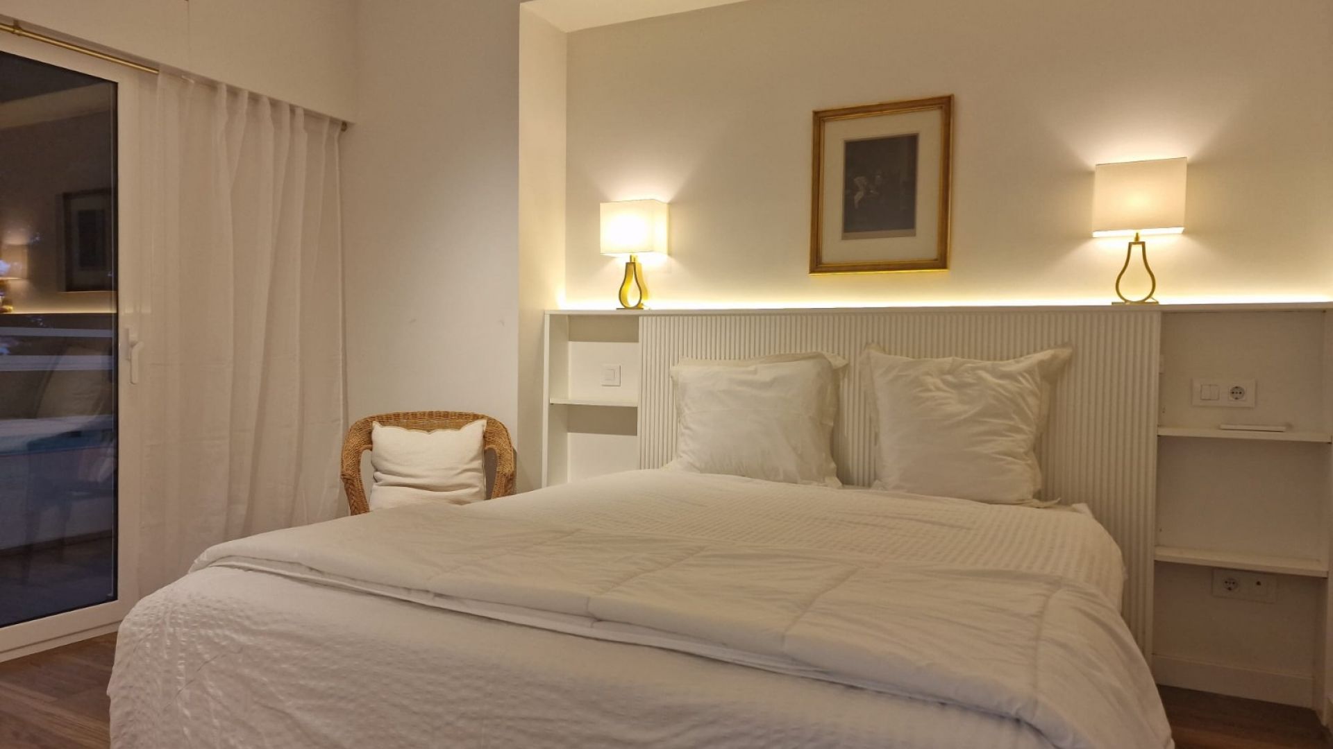 Lägenheten erbjuder ett rymligt och ljust sovrum, ett mysigt vardagsrum och två moderna badrum – perfekt anpassat för både bekvämlighet och stil, vare sig du har gäster eller njuter av lugnet själv.