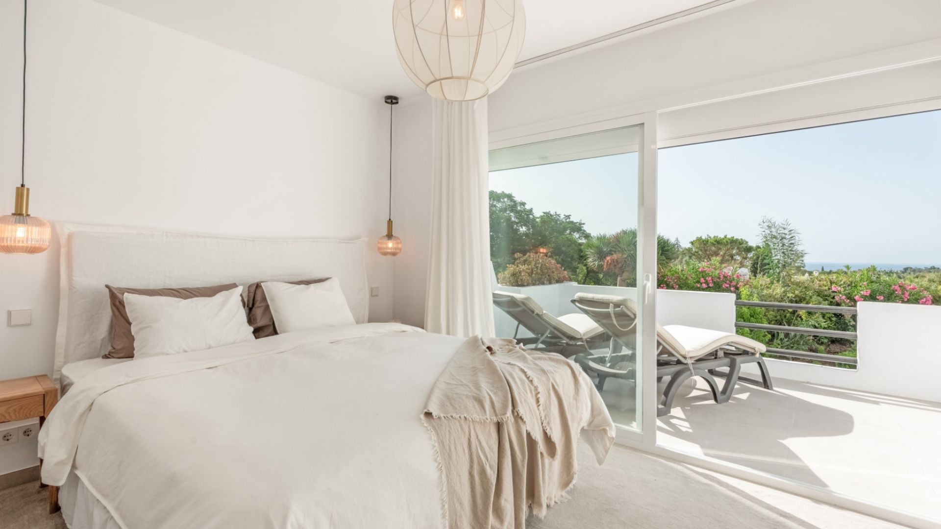Bland bekvämligheterna finns ett fullt utrustat kök, golvvärme i badrummen, elektriska persienner och inbyggda garderober – allt utformat för komfort och funktionalitet. Master-sovrummet bjuder dessutom på havsutsikt.