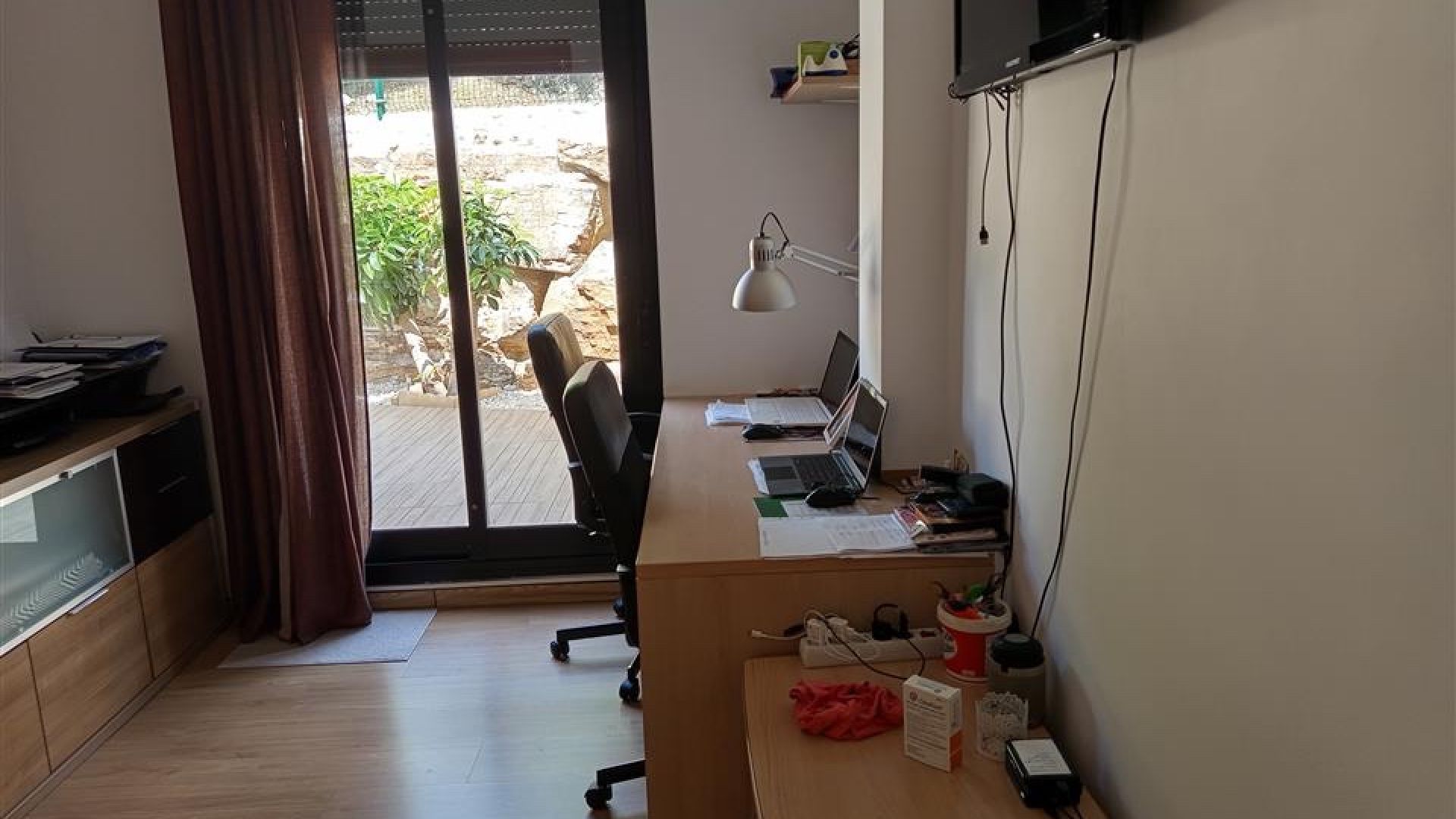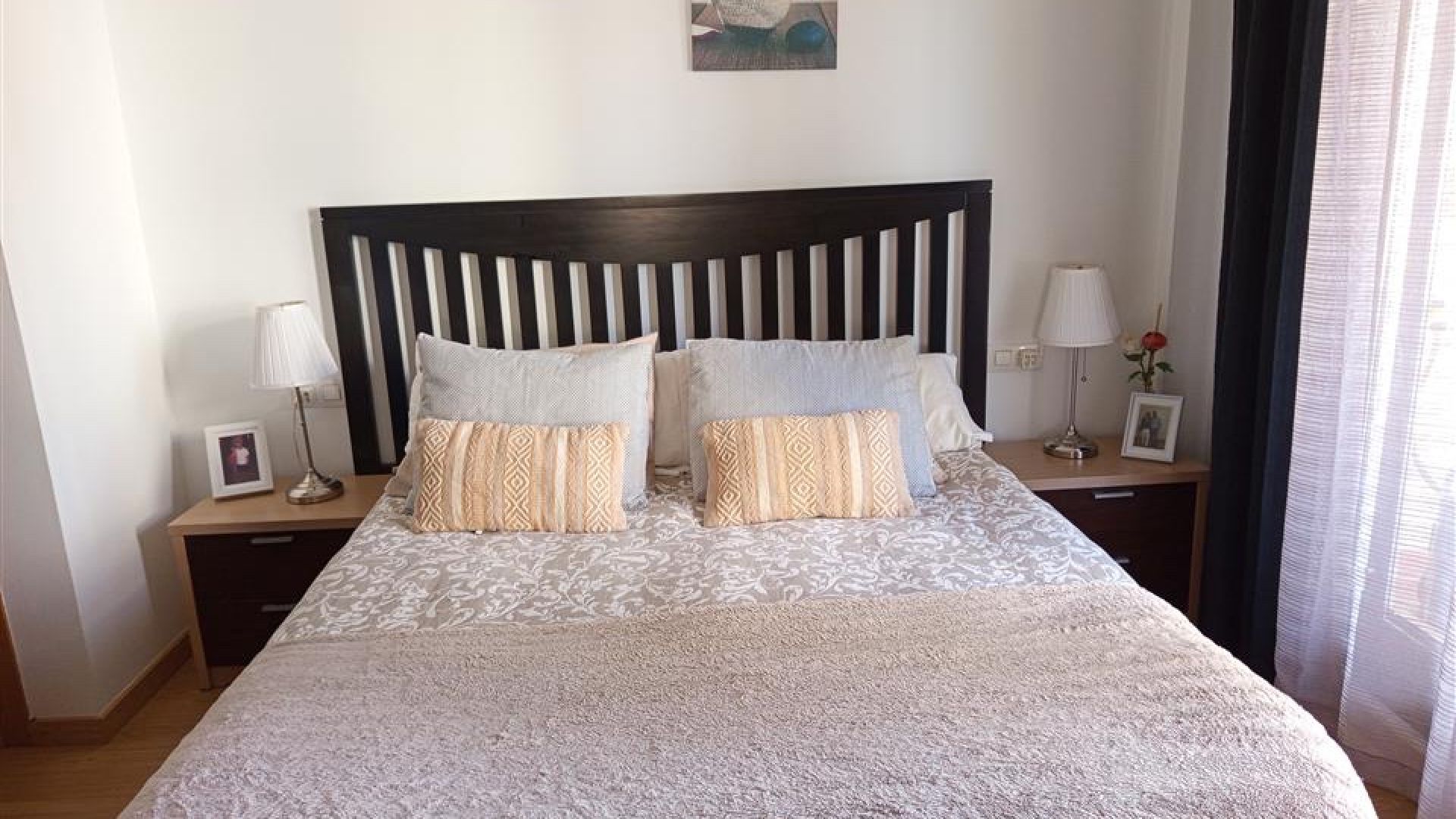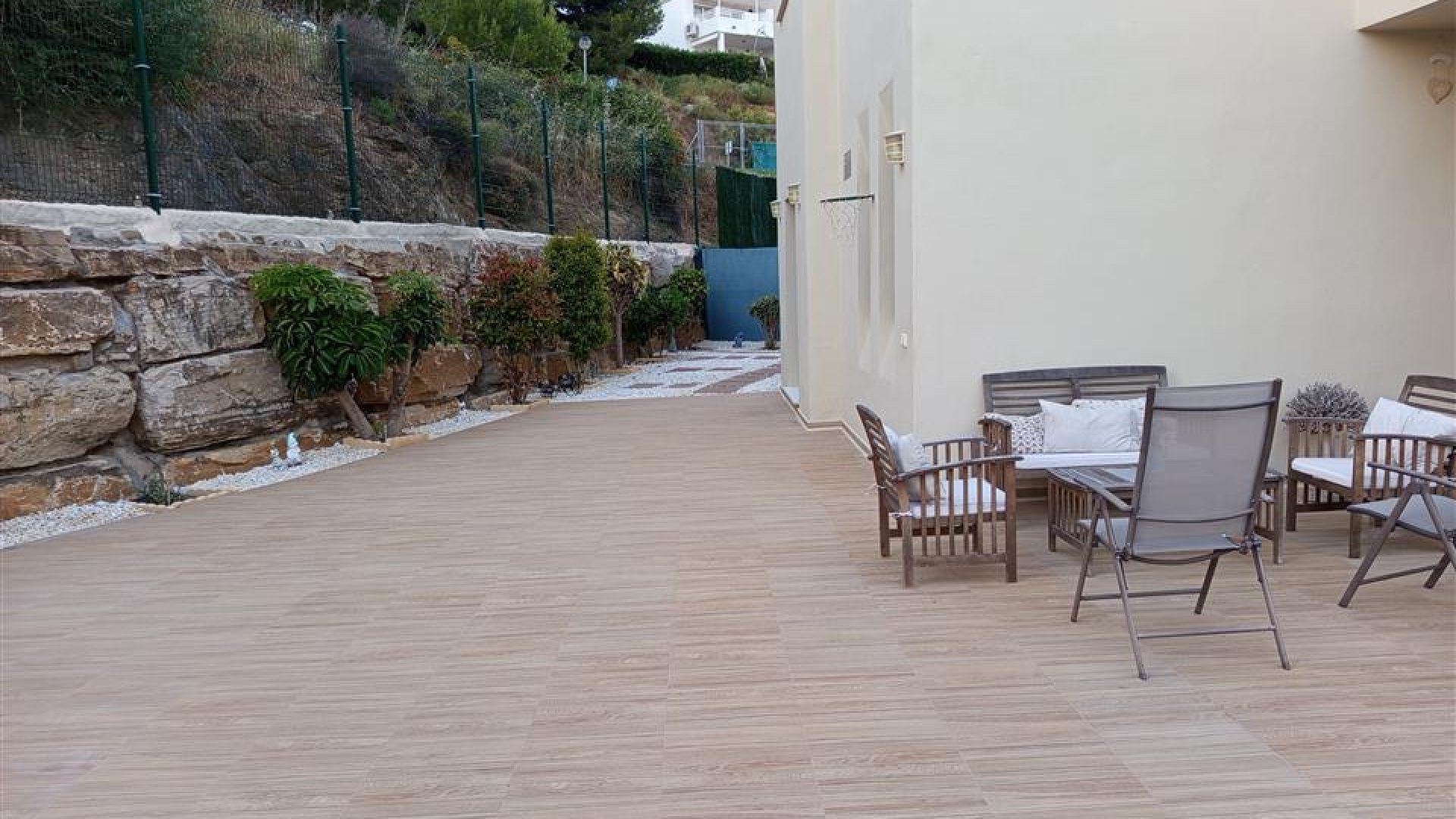 Inuti har lägenheten tre rymliga sovrum och två badrum. Huvudsovrummet har ett eget badrum med jacuzzi och separat dusch, medan de två andra sovrummen delar ett generöst familjebadrum. Alla sovrum har direkt tillgång till den frodiga trädgården och terrassen, vilket ger ett ljust och luftigt intryck i hela bostaden.