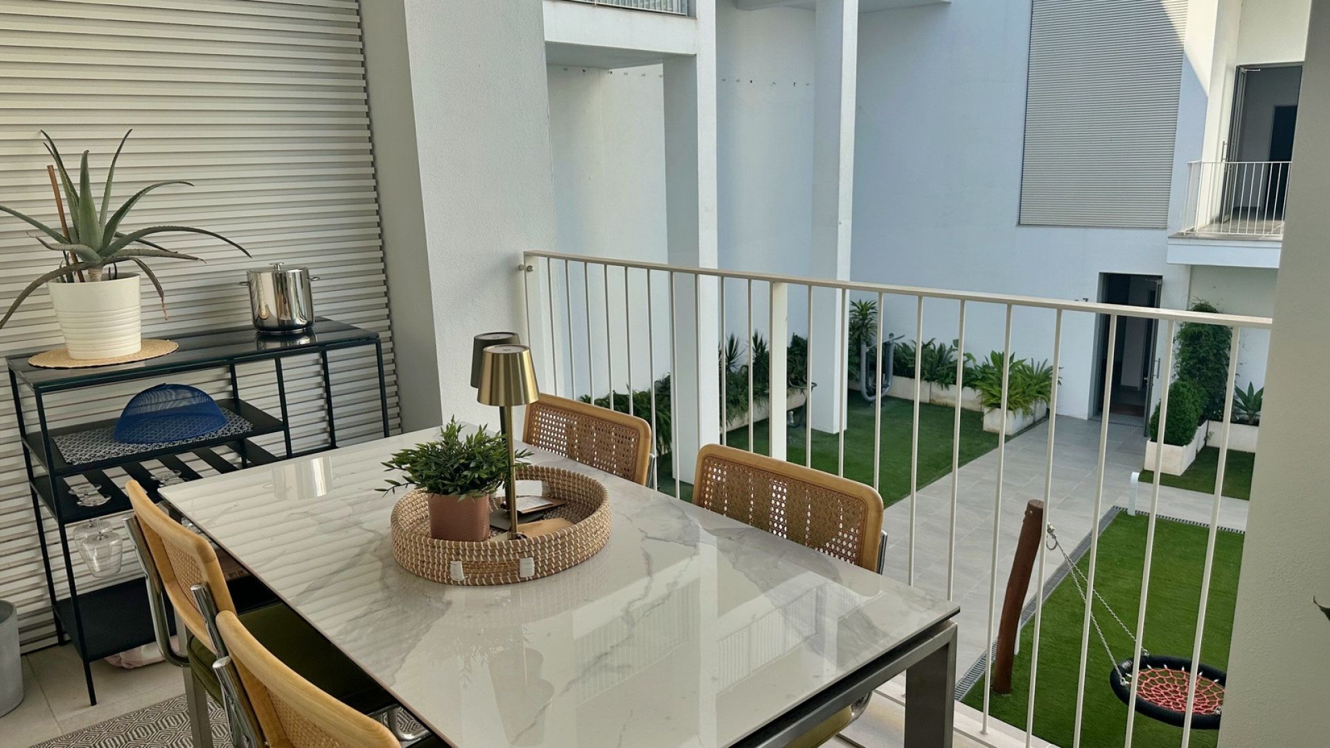 Stilfullt ombyggd 3-rumslägenhet till salu i den eftertraktade nyproducerade urbanisationen i San Pedro de Alcántara, Marbella. Ursprungligen designad som en 2-rumslägenhet har bostaden smart omkonfigurerats till ett rymligt och funktionellt hem med 3 sovrum. Den totala byggytan är 116,34 m², inklusive en generös terrass på 21,18 m² – perfekt för utomhusmiddagar och avkoppling.